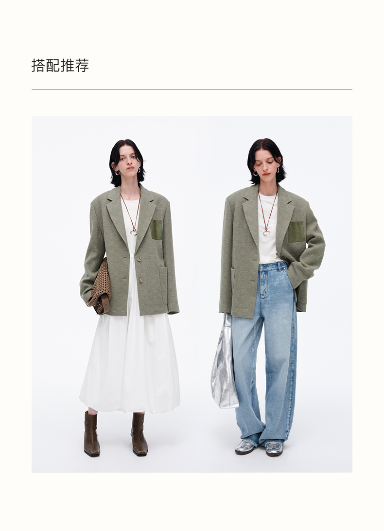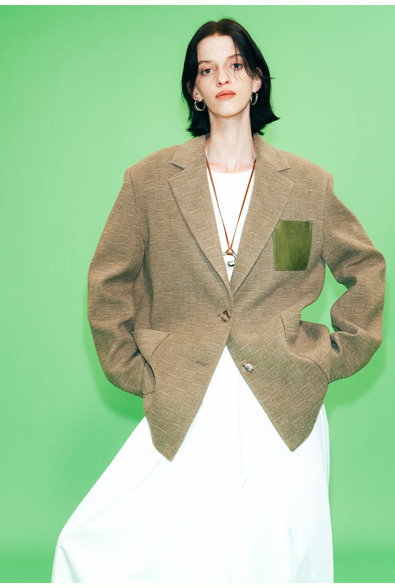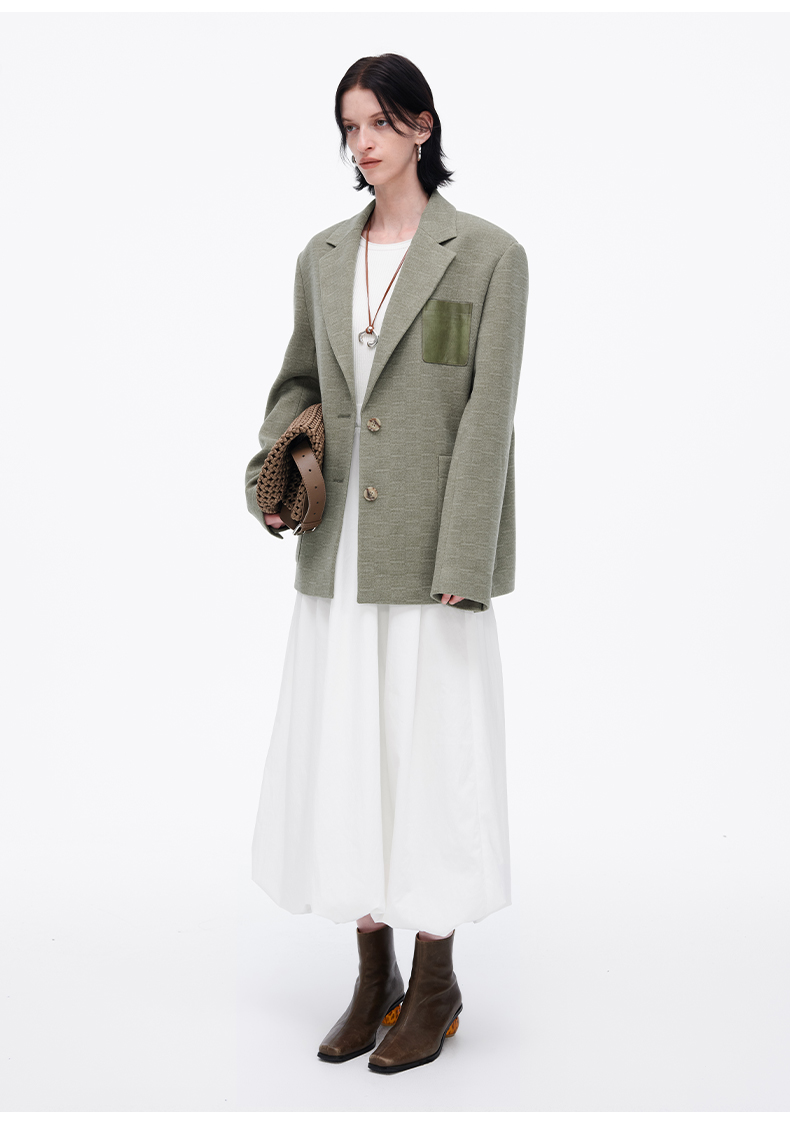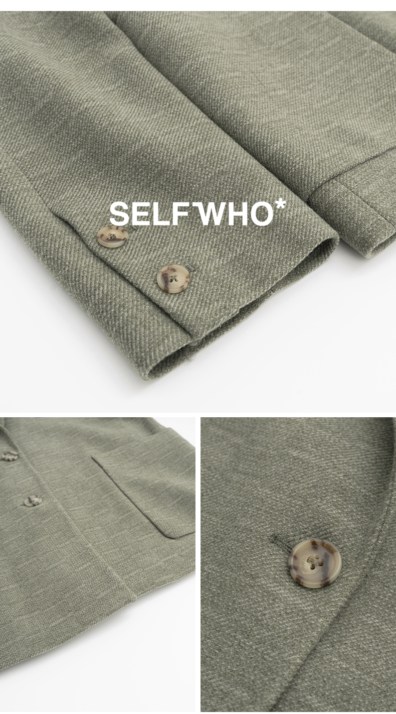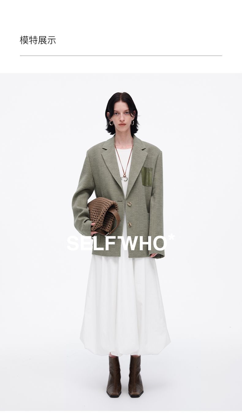 SELFWHO绿色西装外套女2025春新款撞色贴袋宽松休闲通勤西服上衣
