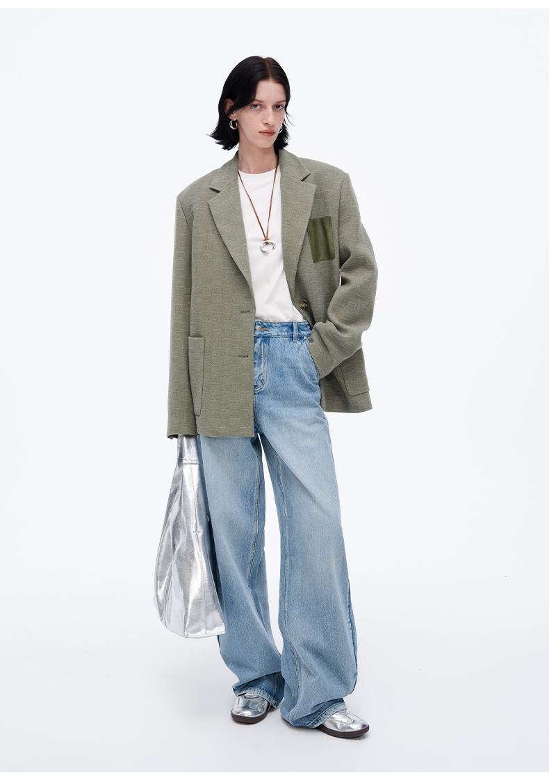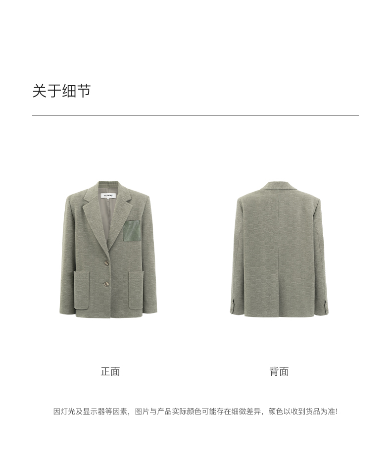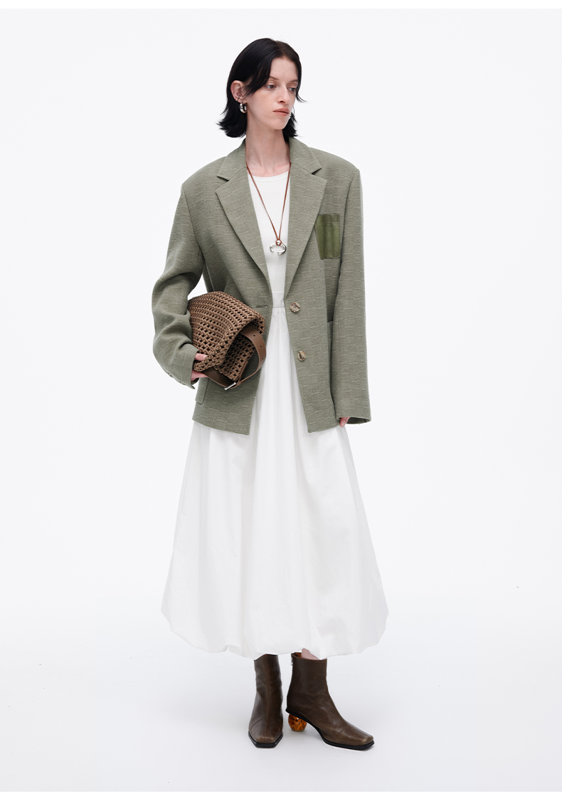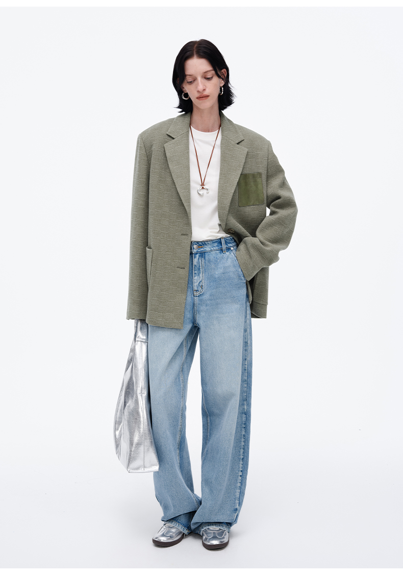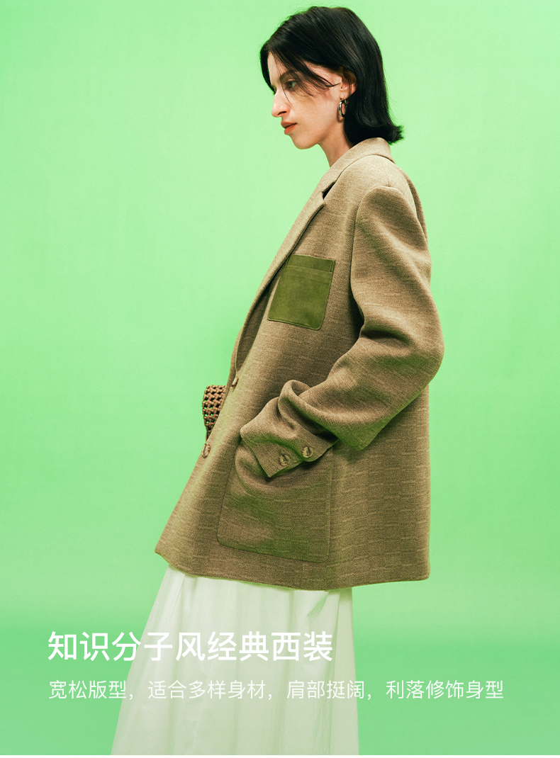 SELFWHO绿色西装外套女2025春新款撞色贴袋宽松休闲通勤西服上衣