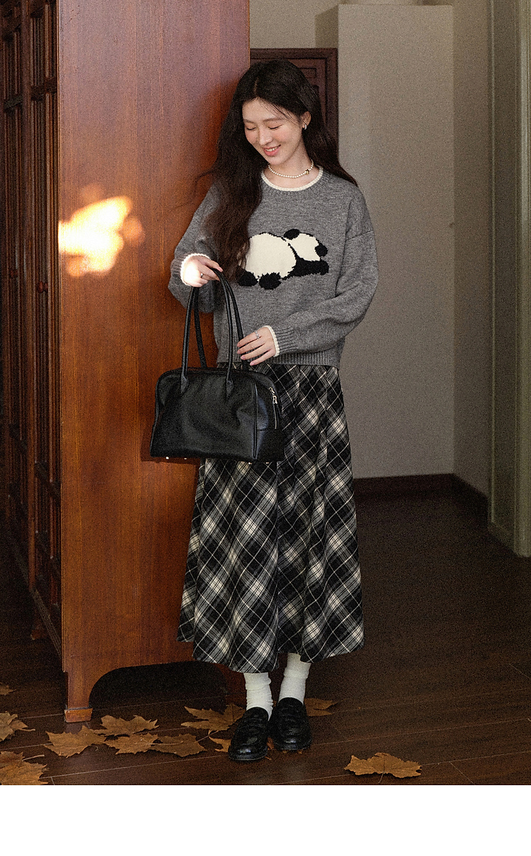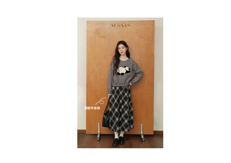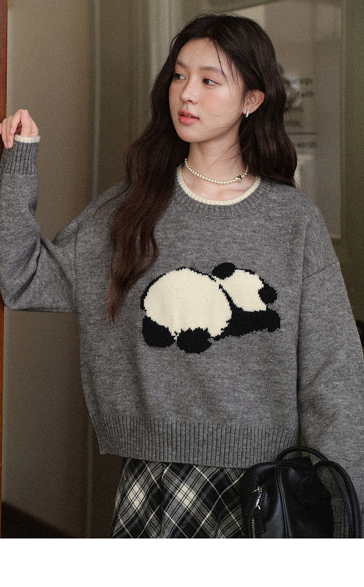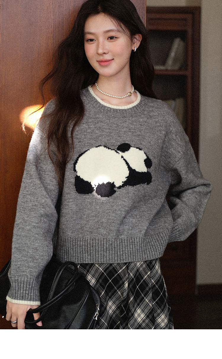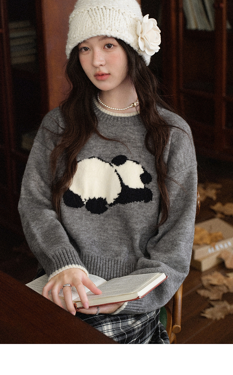 鹿向南「熊猫团子」花灰色圆领保暖长袖毛衣秋冬季新款简约上衣女L58116