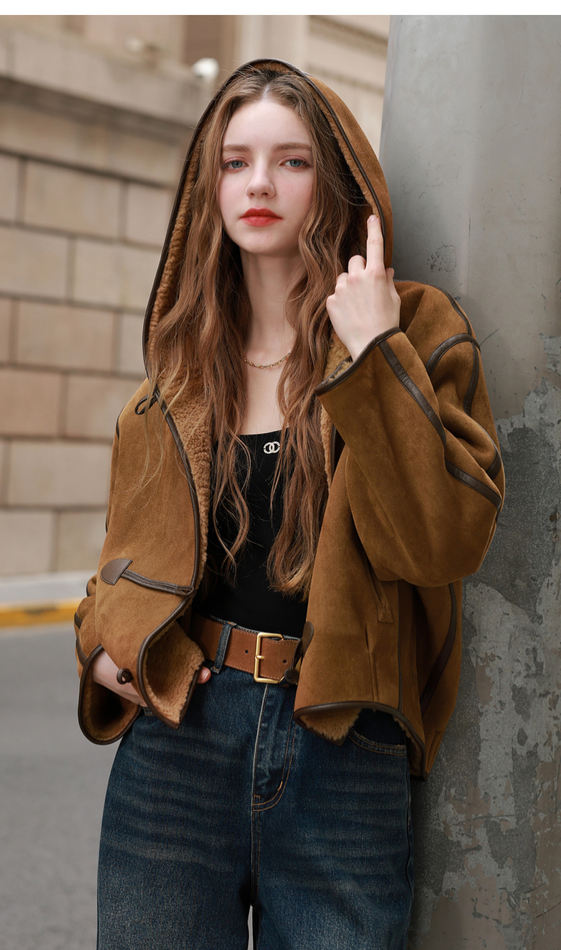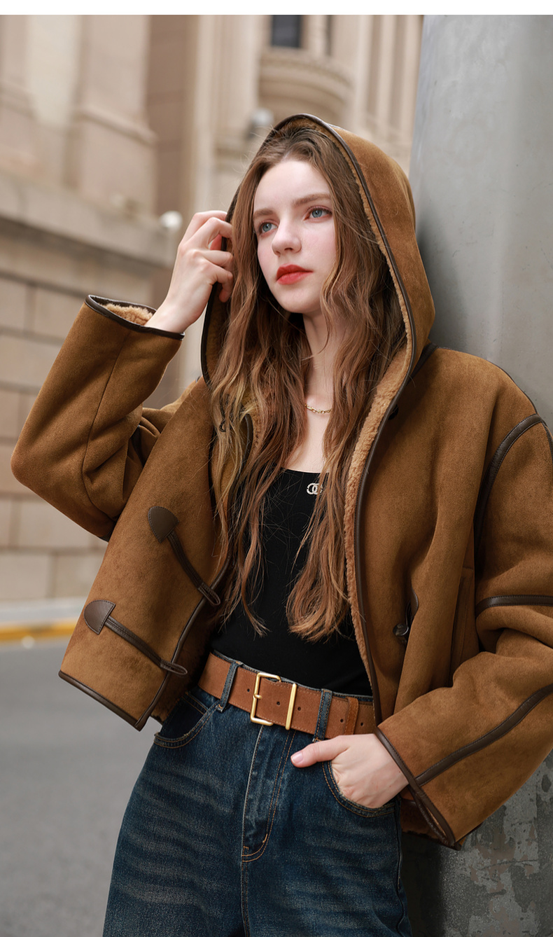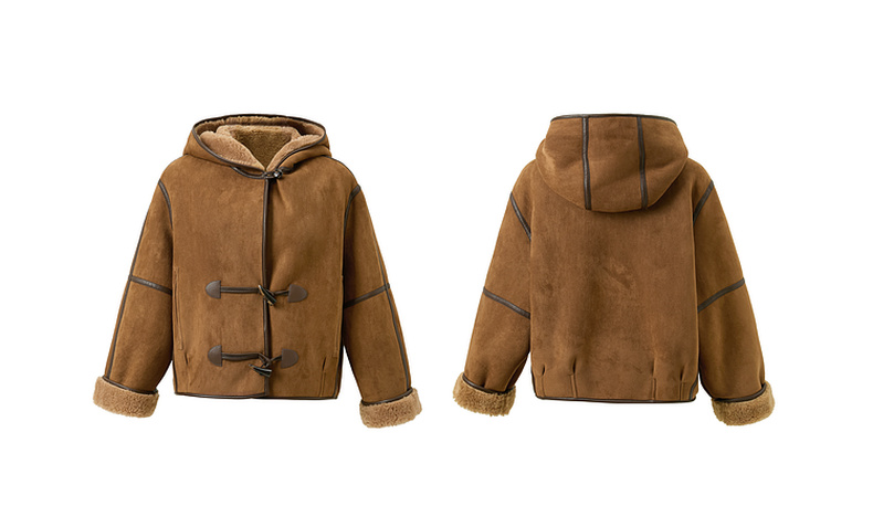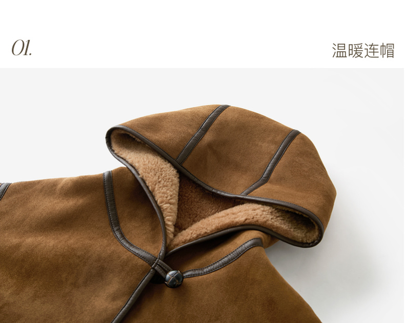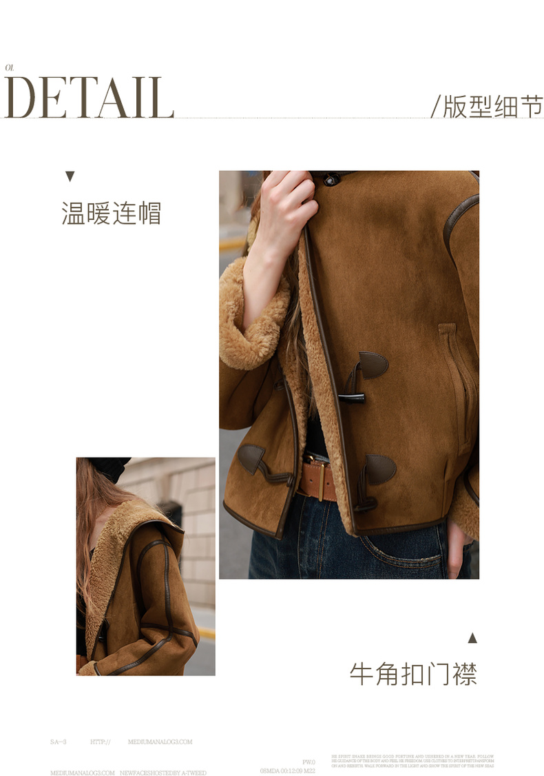 三彩2025冬季新款仿麂皮环保皮草连帽毛毛外套牛角扣M