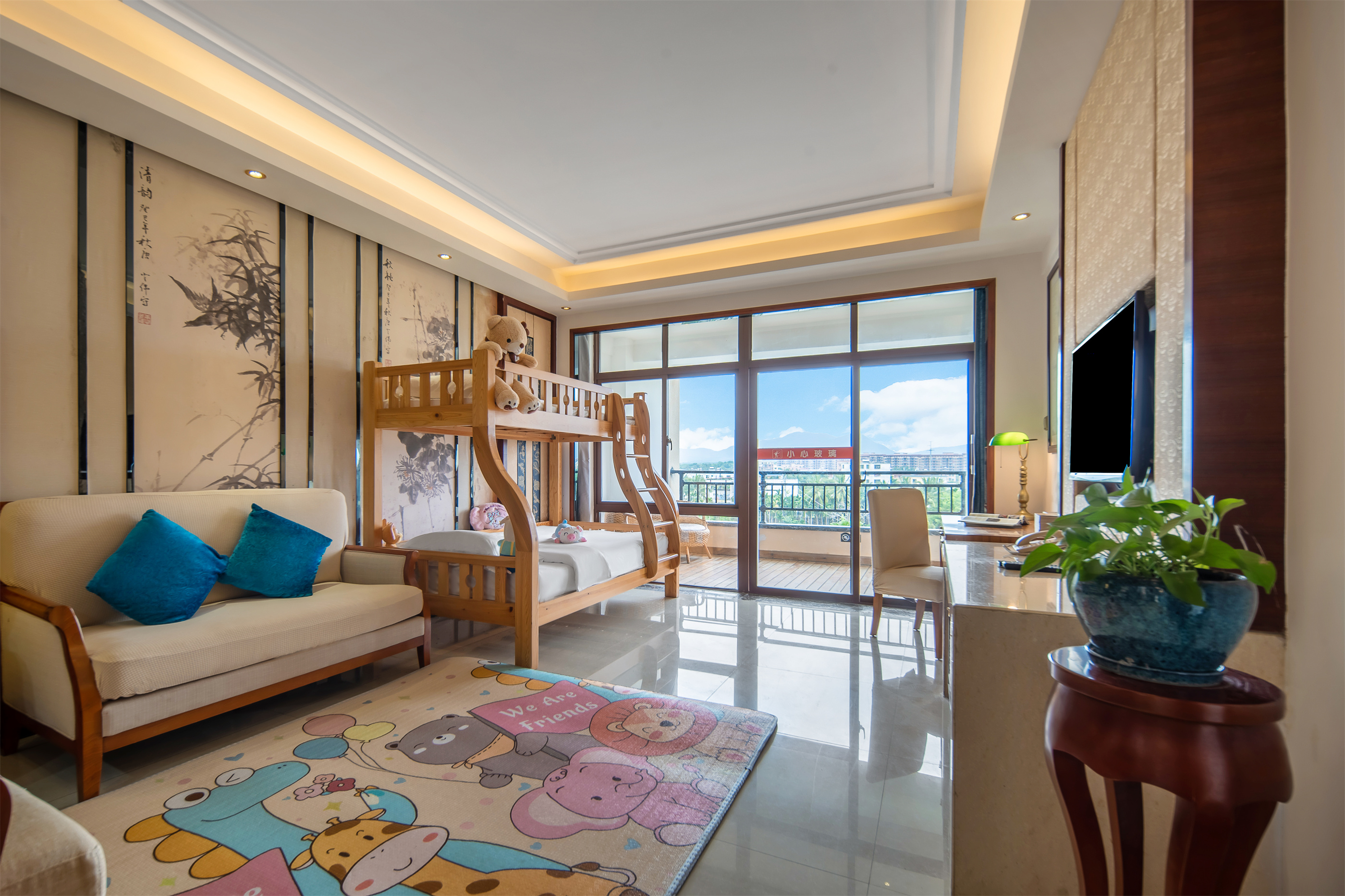 可选商务套(有小客厅,无房)、亲子套(客厅内有上下铺)、双床套(客厅内有一个小床)。