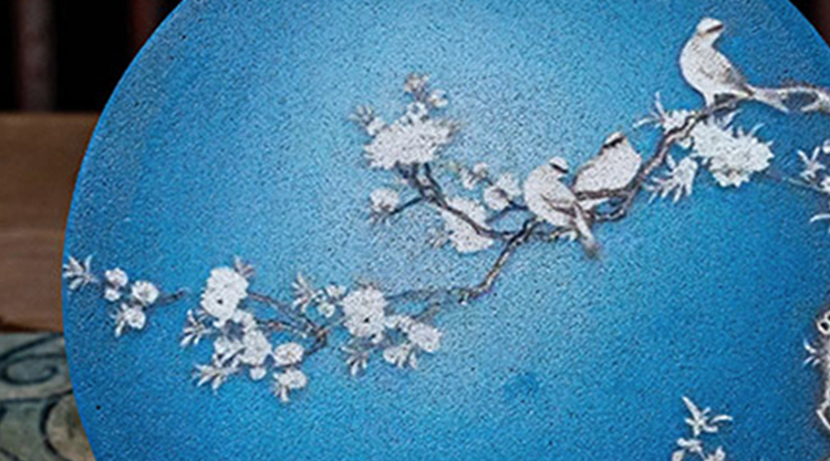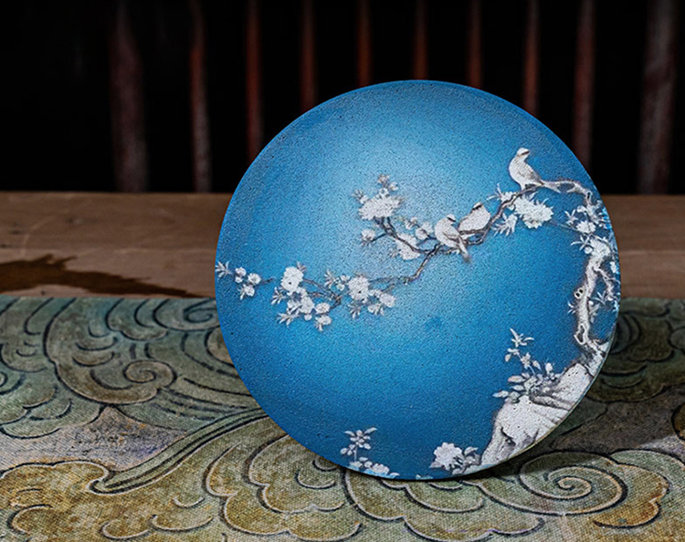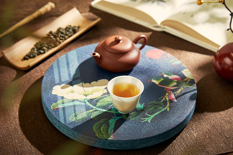 这一款茶承沿用中国画中的蓝调画法,以大片大片的湛蓝为背景,喜鹊鸟儿立枝头,鲜花怒放,生机盎然。