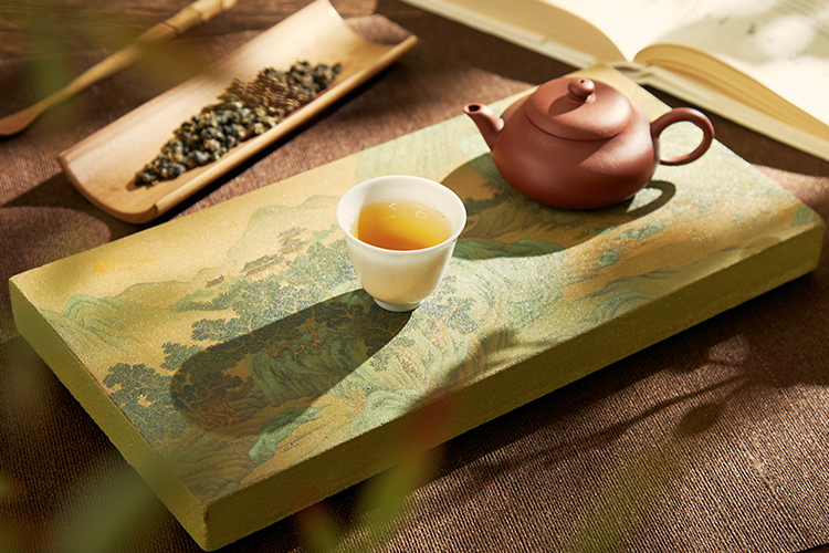 将华夏山河展现在方寸茶承间,青山绿水显豪迈气势,品茶赏之,如畅游深山密林之间,快意无比。