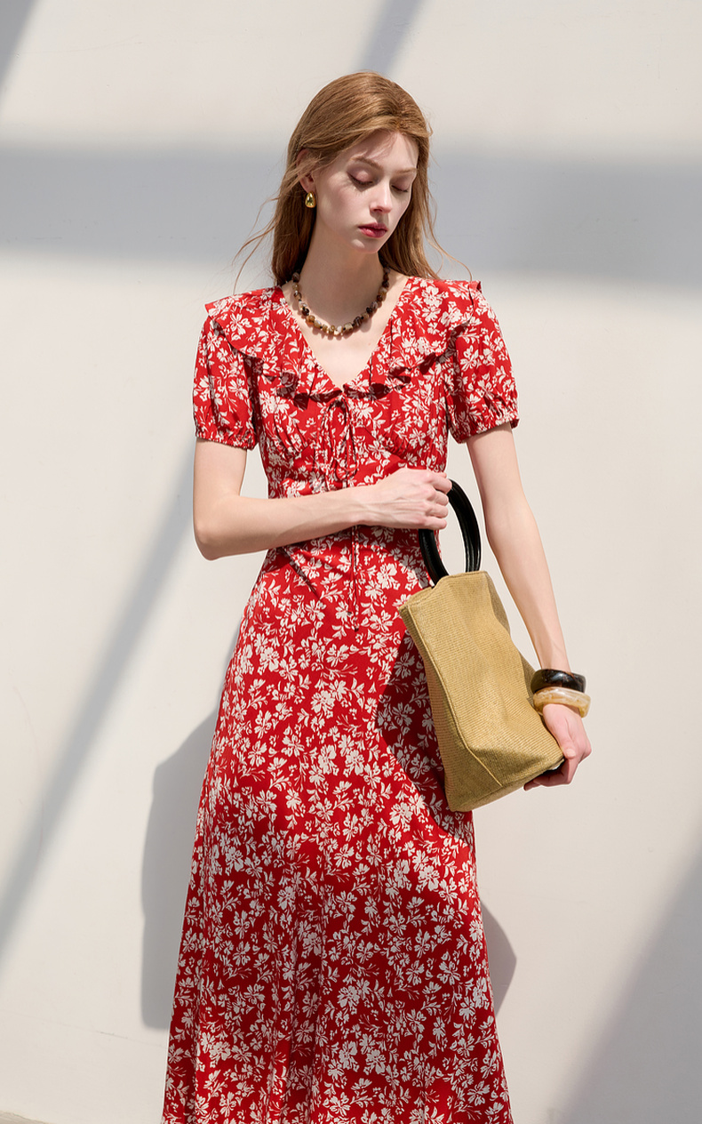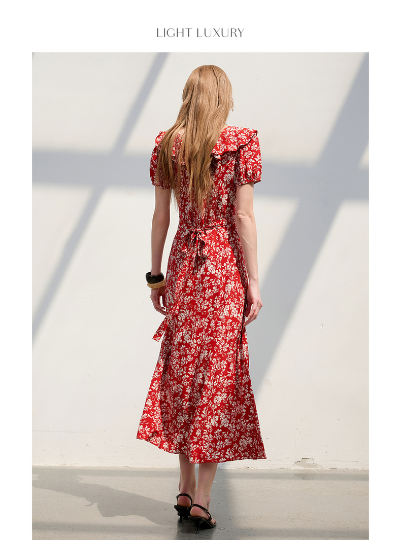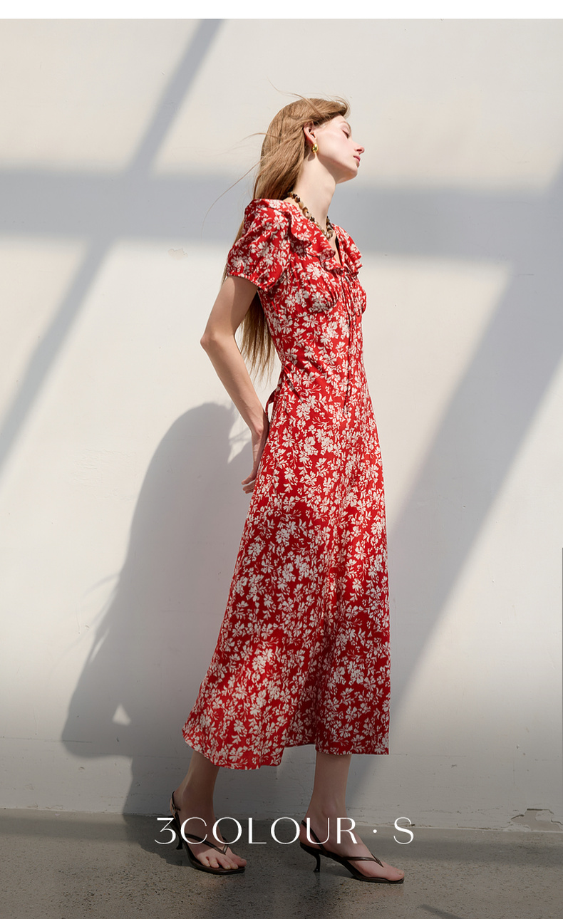 【仙女裙】三彩2025夏季新款荷叶边碎花裙法式收腰A字裙长裙系带优雅S