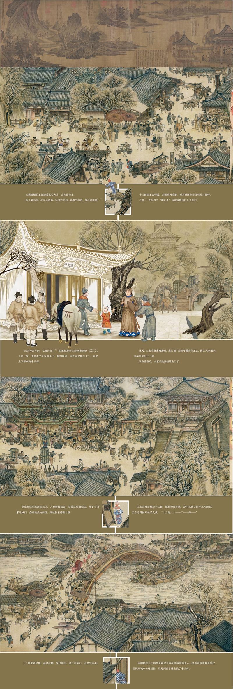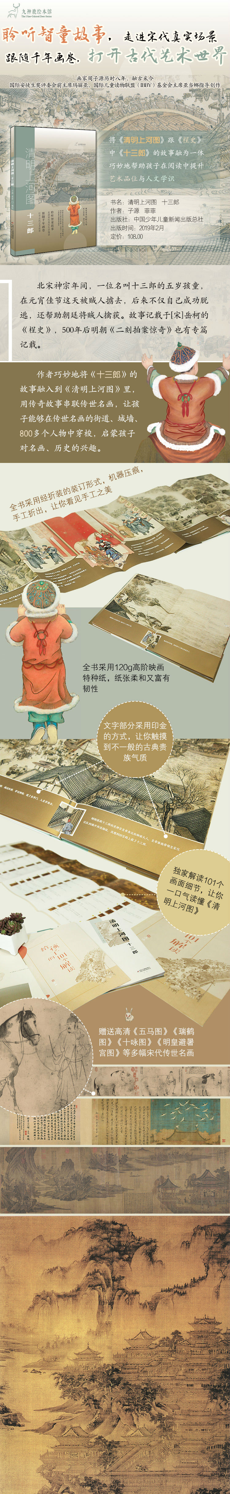 此书*的创意是将北宋名画《清明上河图》跟《桯史》中《十三郎》的故事巧妙地融到一起,让孩子能够在传世名画的街道、城墙、800多个人物中穿梭,启蒙孩子对名画的兴趣,潜移默化中提升孩子的艺术品位与人文学识。