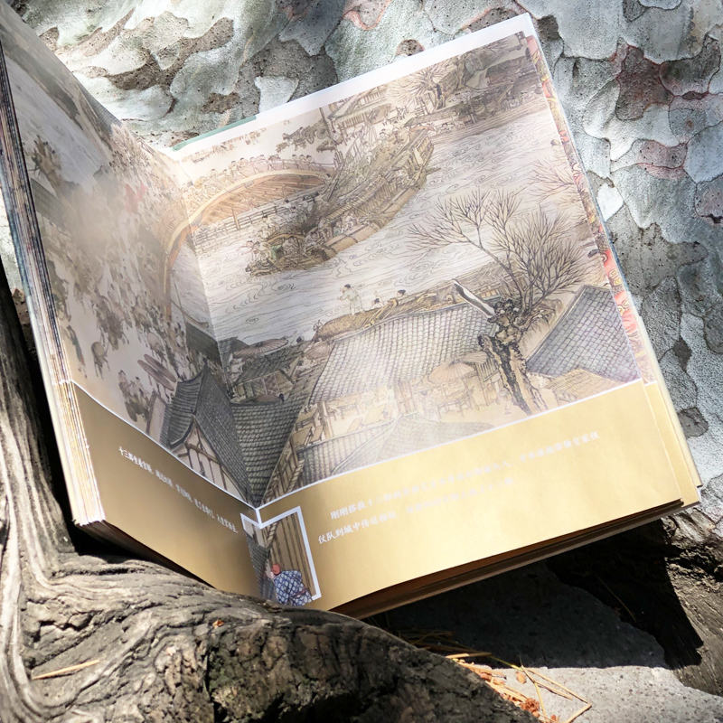 绘画主线是《清明上河图》,绘本首次将完整的《清明上河图》跟历史故事结合起来,不知不觉中帮助孩子理解清明上河图所呈现的时代、生活和人文内涵。同时为了更好的传播中国国画的独特魅力,激发孩子对千年文化中人文、艺术的兴趣,作者还在书中融入一些传世宋画中的代表元素或经典人物形象,进行艺术的再创作。这其中不仅包括李公麟的《五马图》《行笈图》、赵佶《祥瑞图》、郭忠恕《明皇避暑宫图》、张先《十咏图》等大家名作,还包括一些无名人士创作的宋代独有的一些极具代表性的艺术形象,如卖眼药膏的人等。