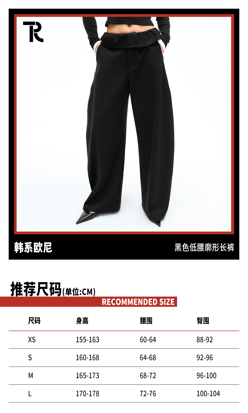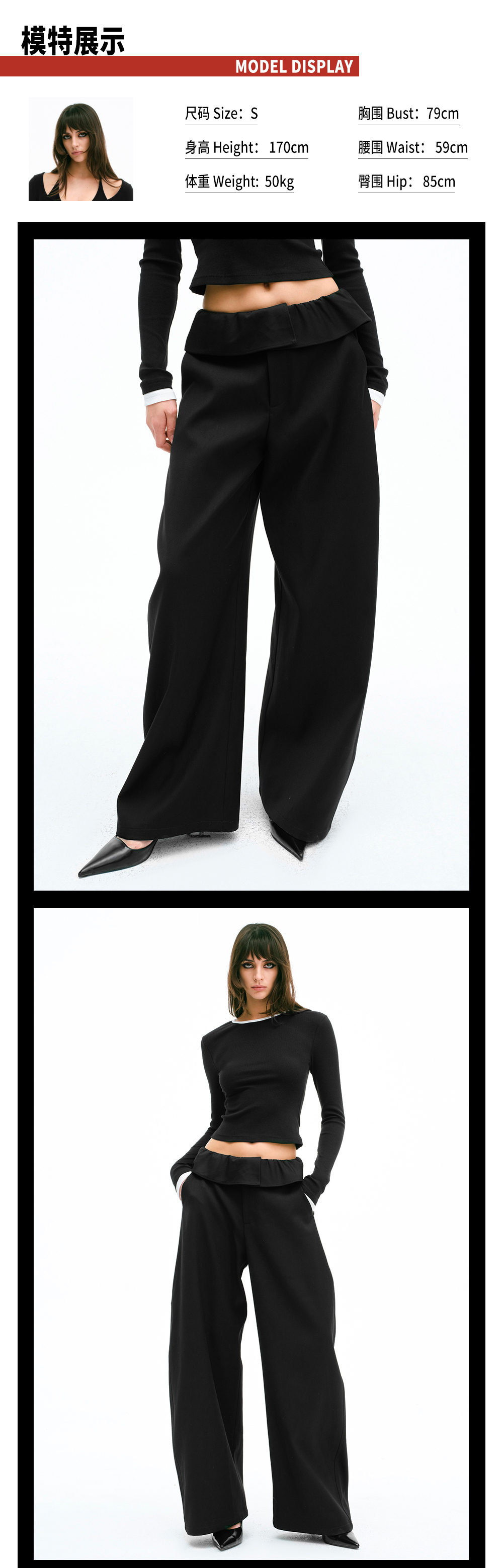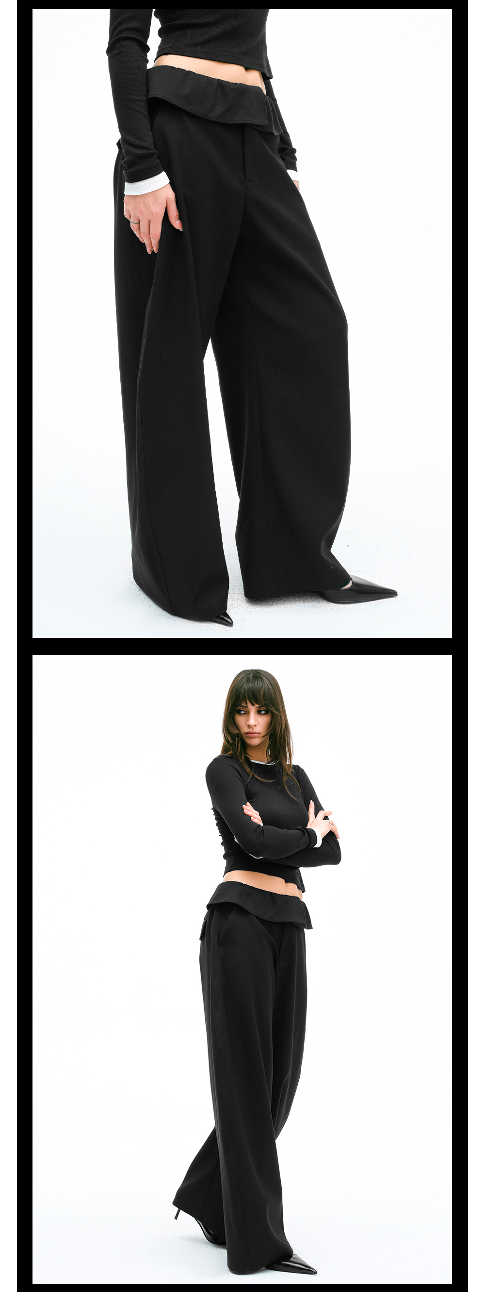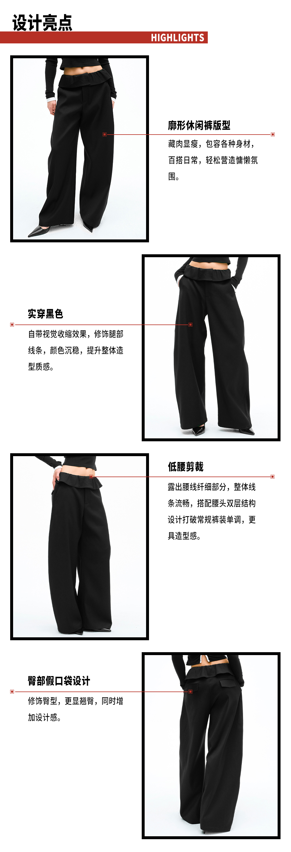 TR她热 韩系欧尼 黑色翻腰设计感显瘦百搭低腰廓形休闲裤长裤