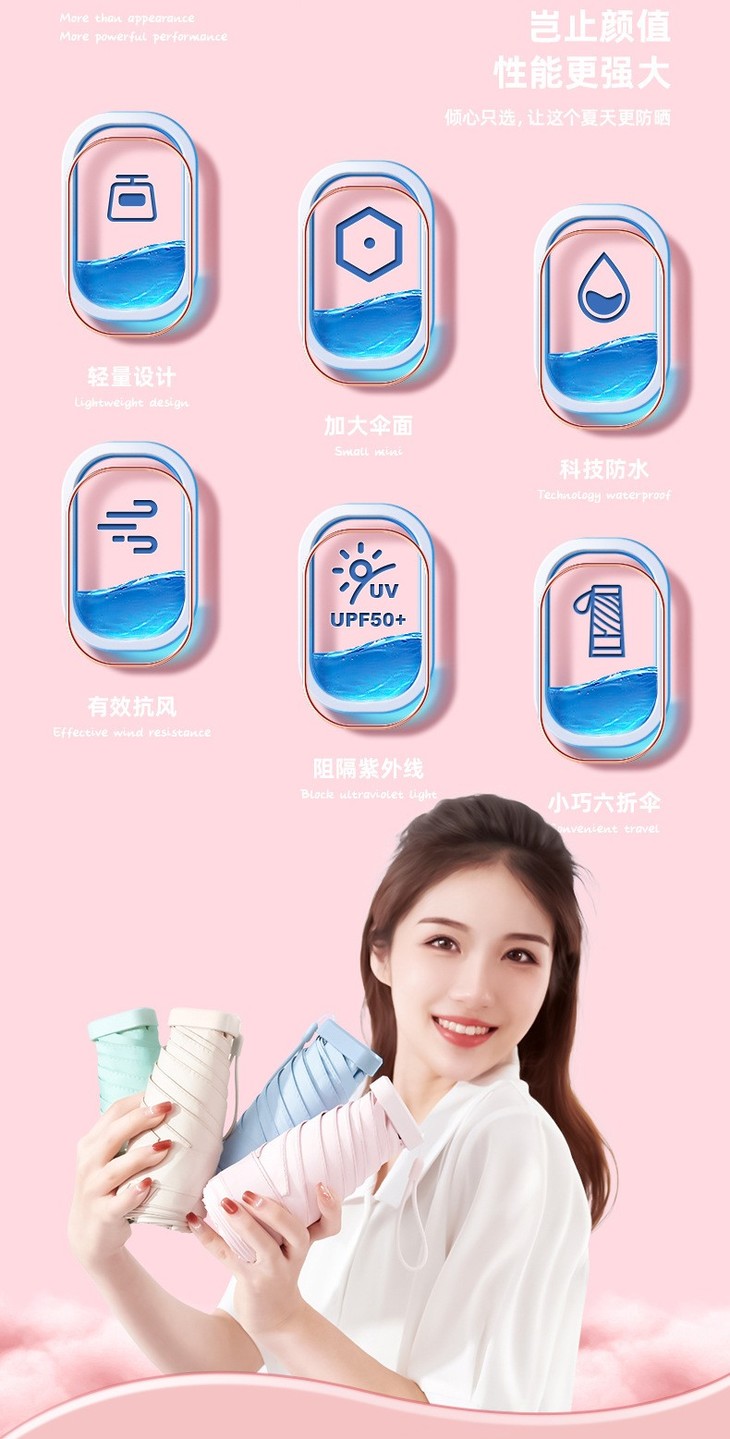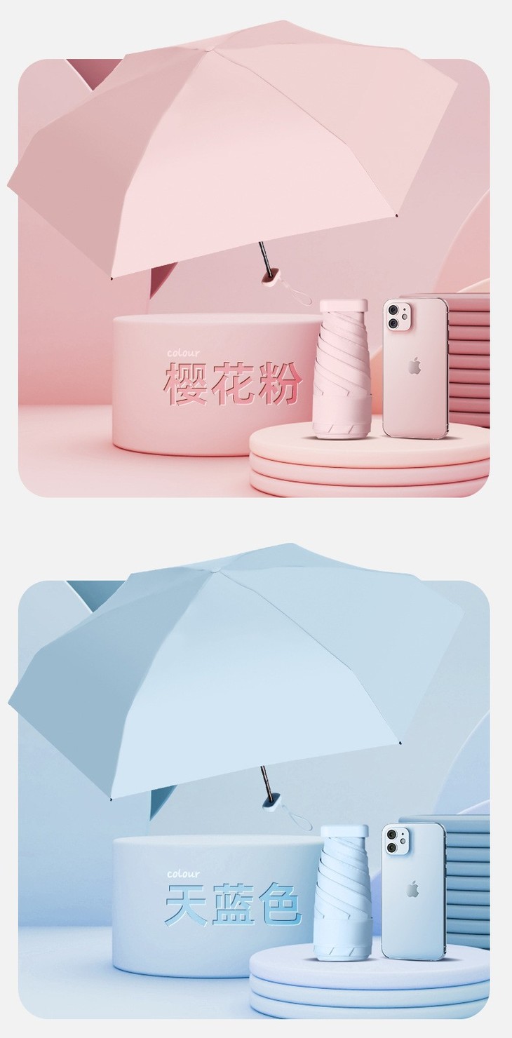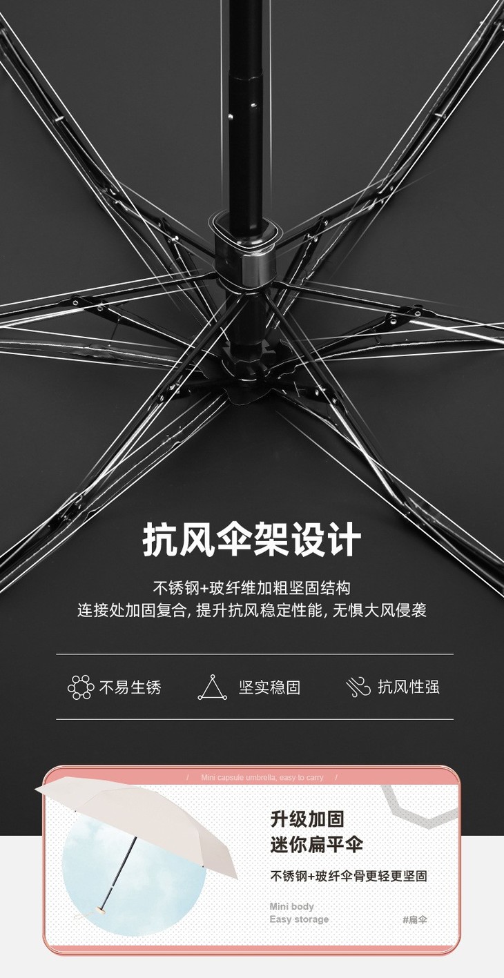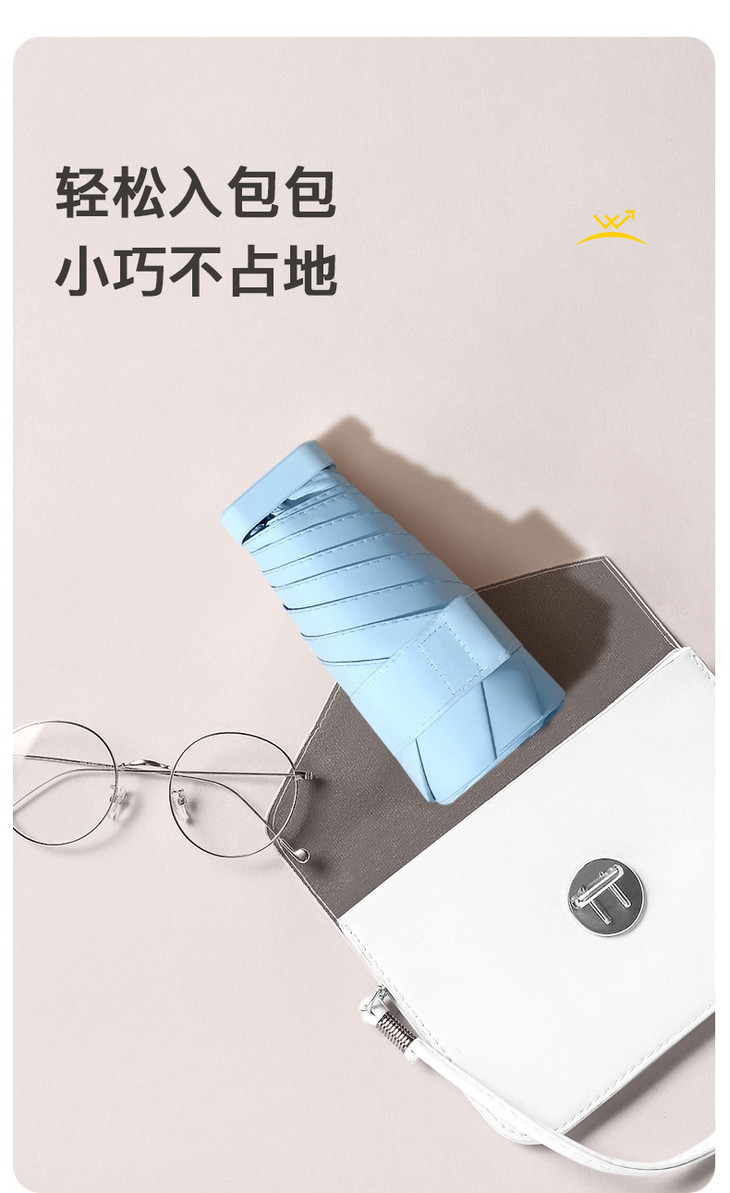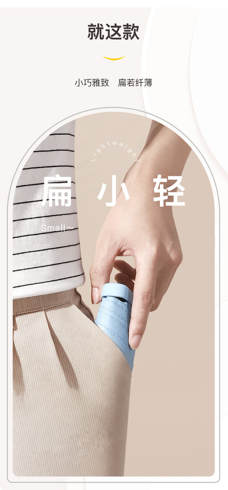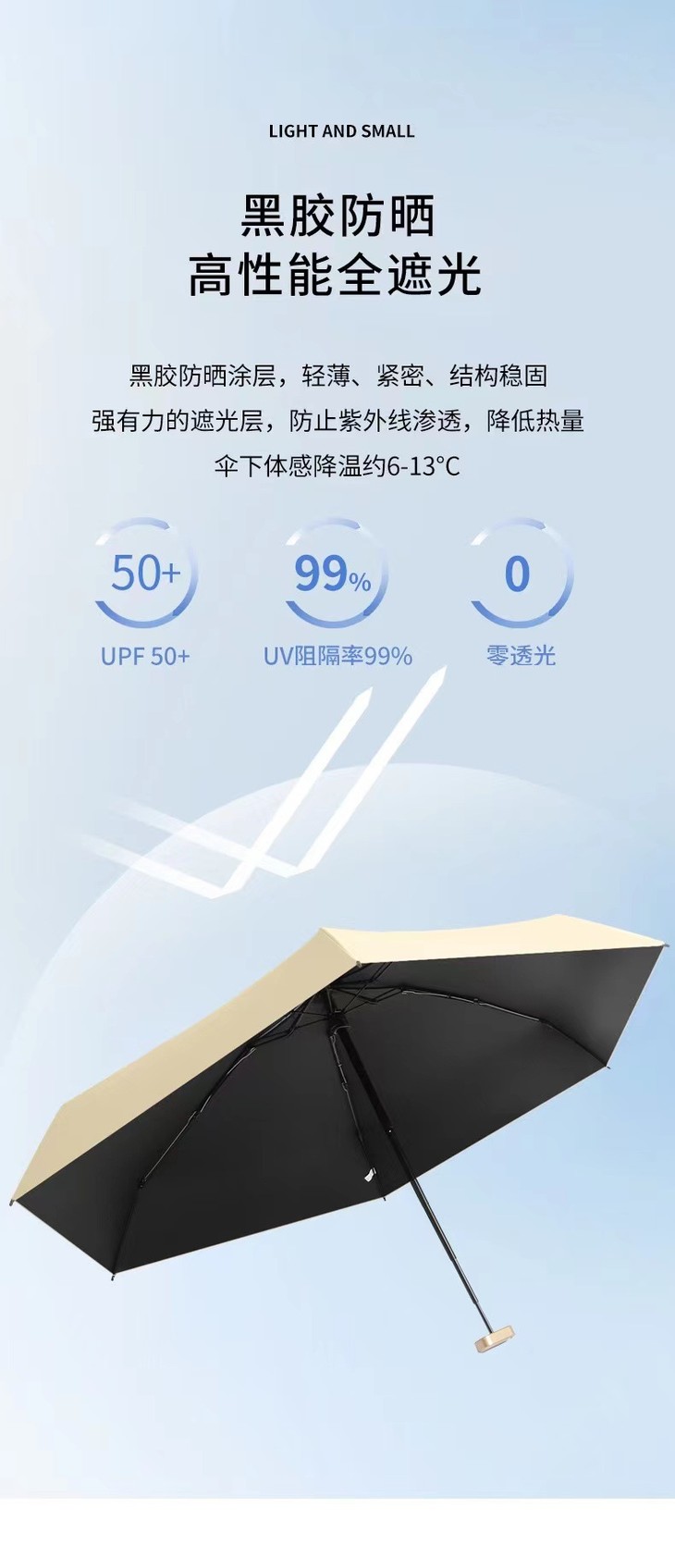 迷你六折全遮光黑胶防晒伞,袖珍口袋遮阳伞扁伞,晴雨两用太阳伞! +配套伞盒