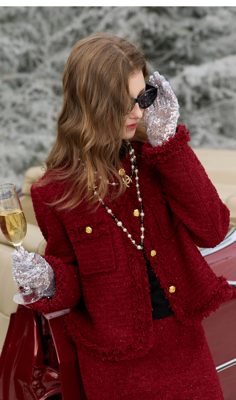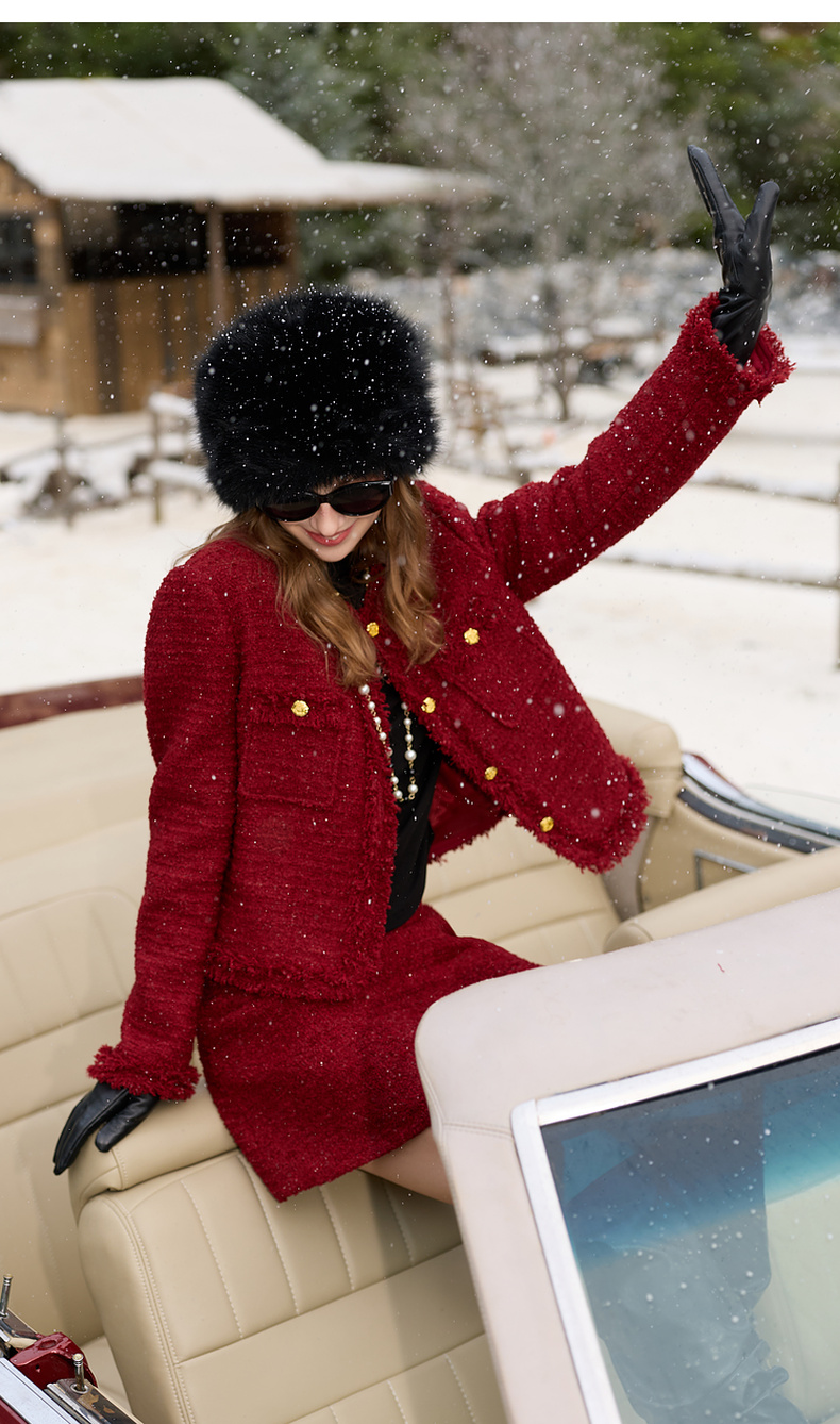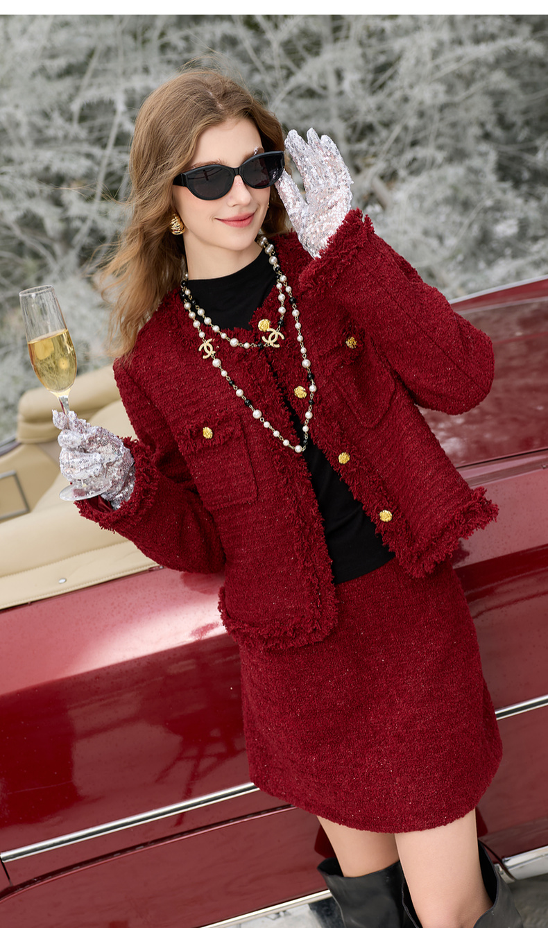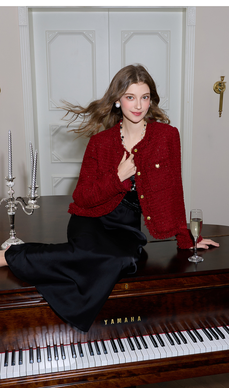 三彩2026春季新款轻奢小香外套粗花呢毛边短款圆领开衫单排扣M
