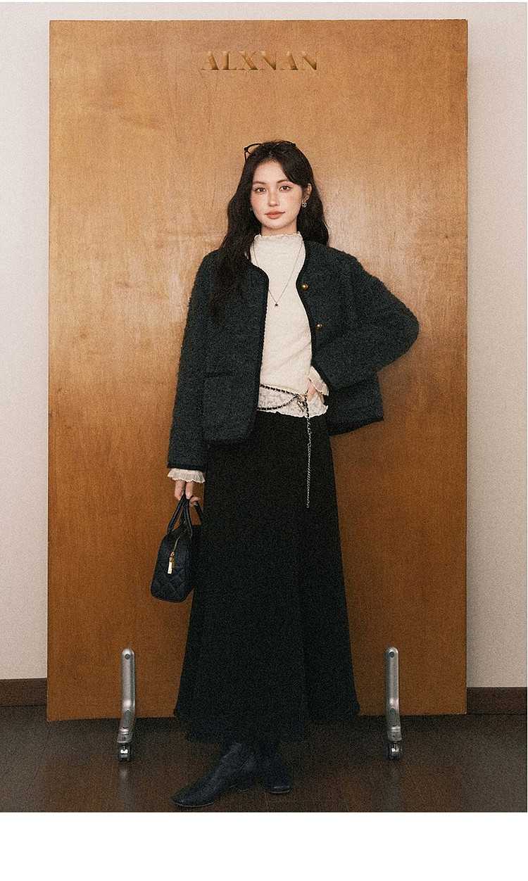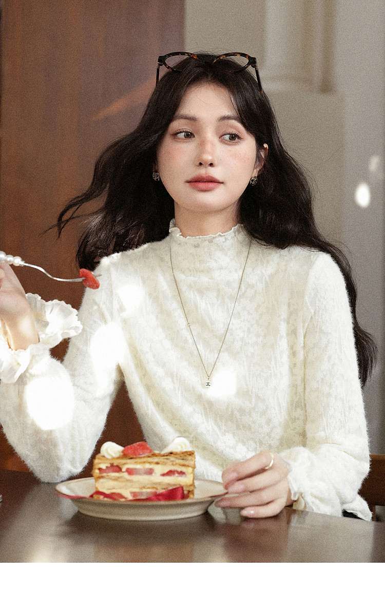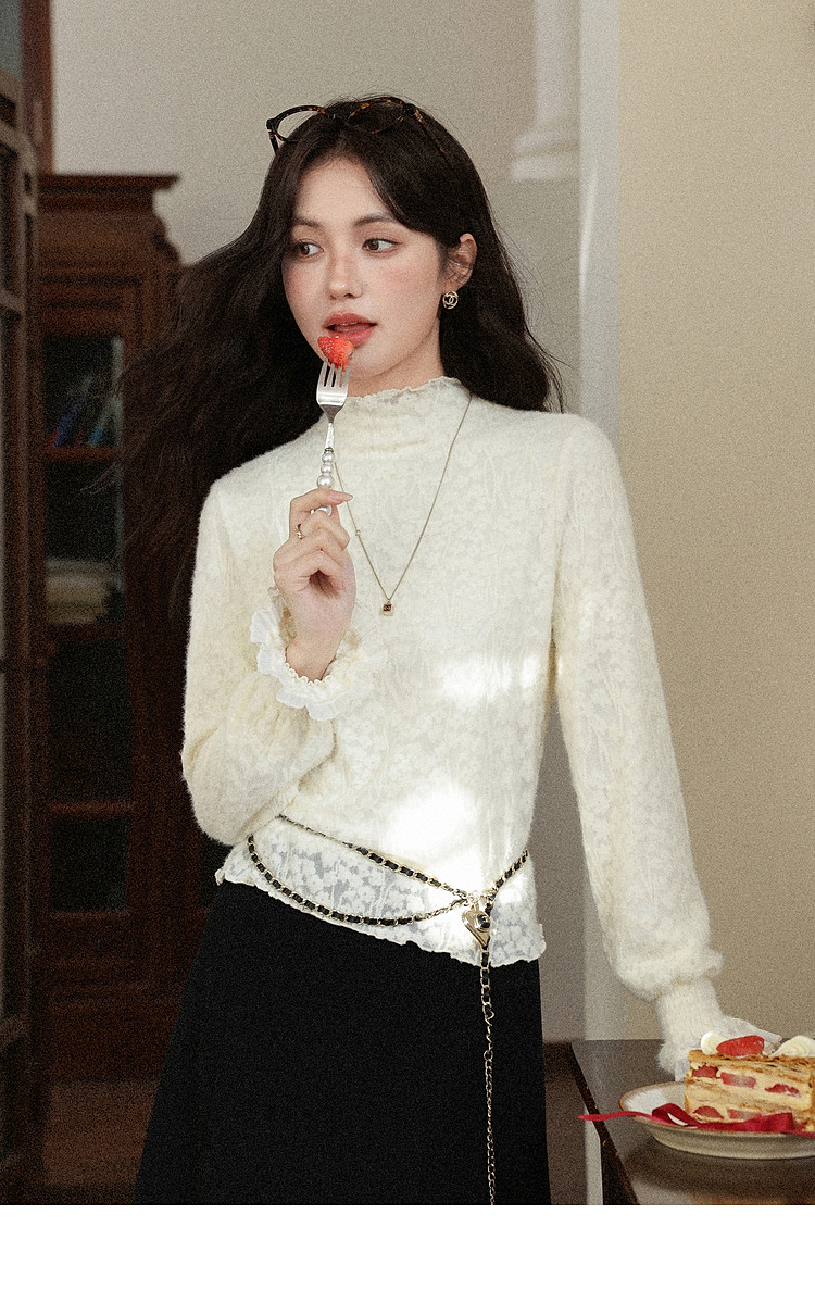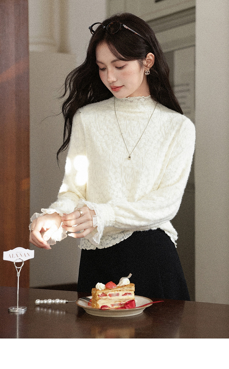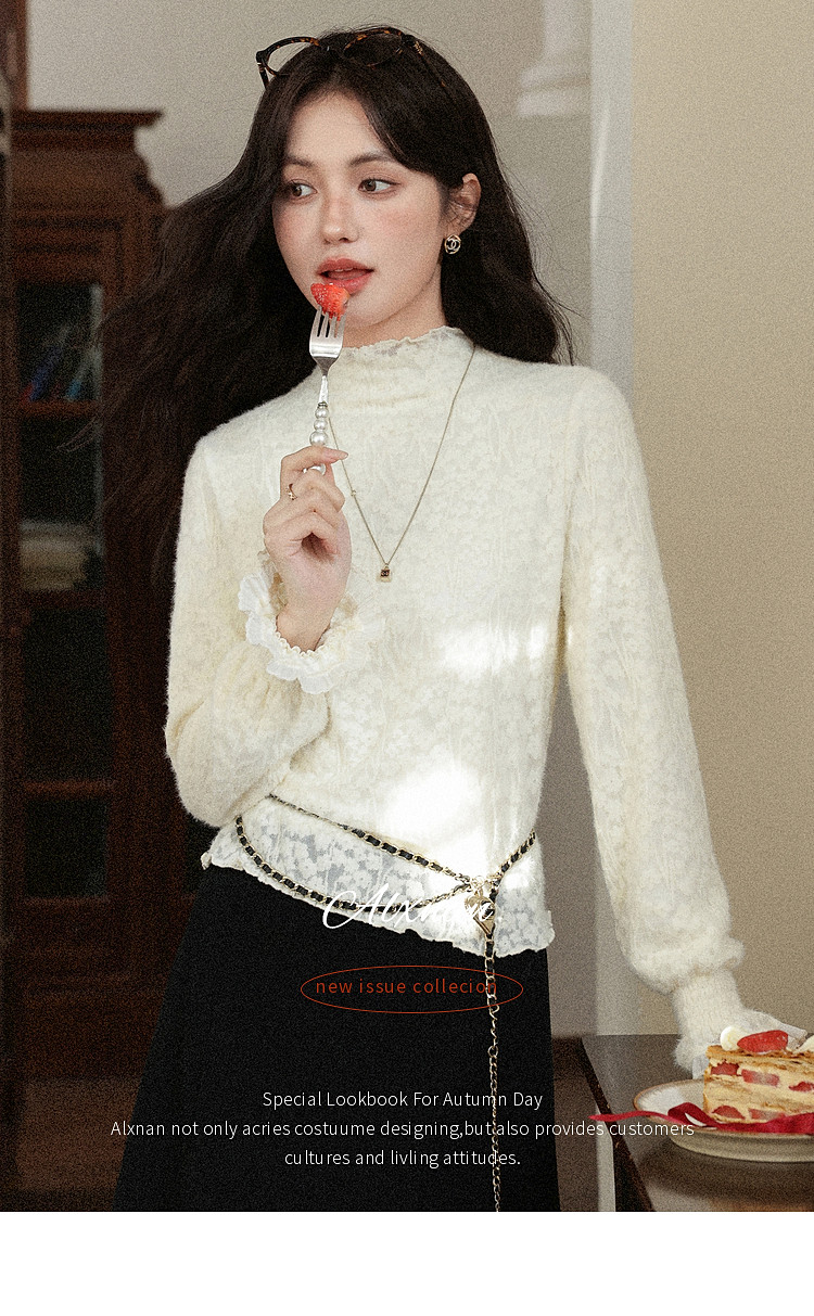 鹿向南「雪顶泡芙」法式杏色内搭花边半高领蕾丝衫女冬打底衫上衣