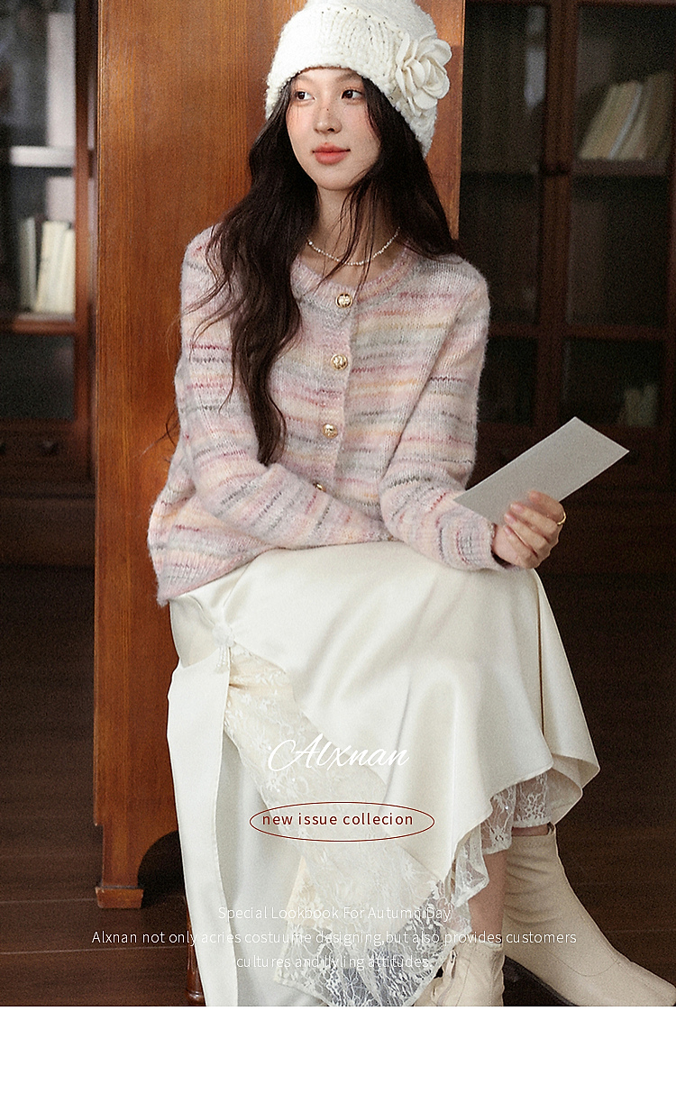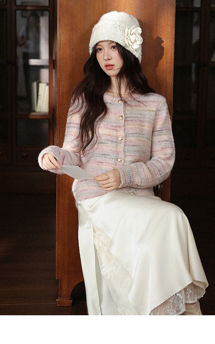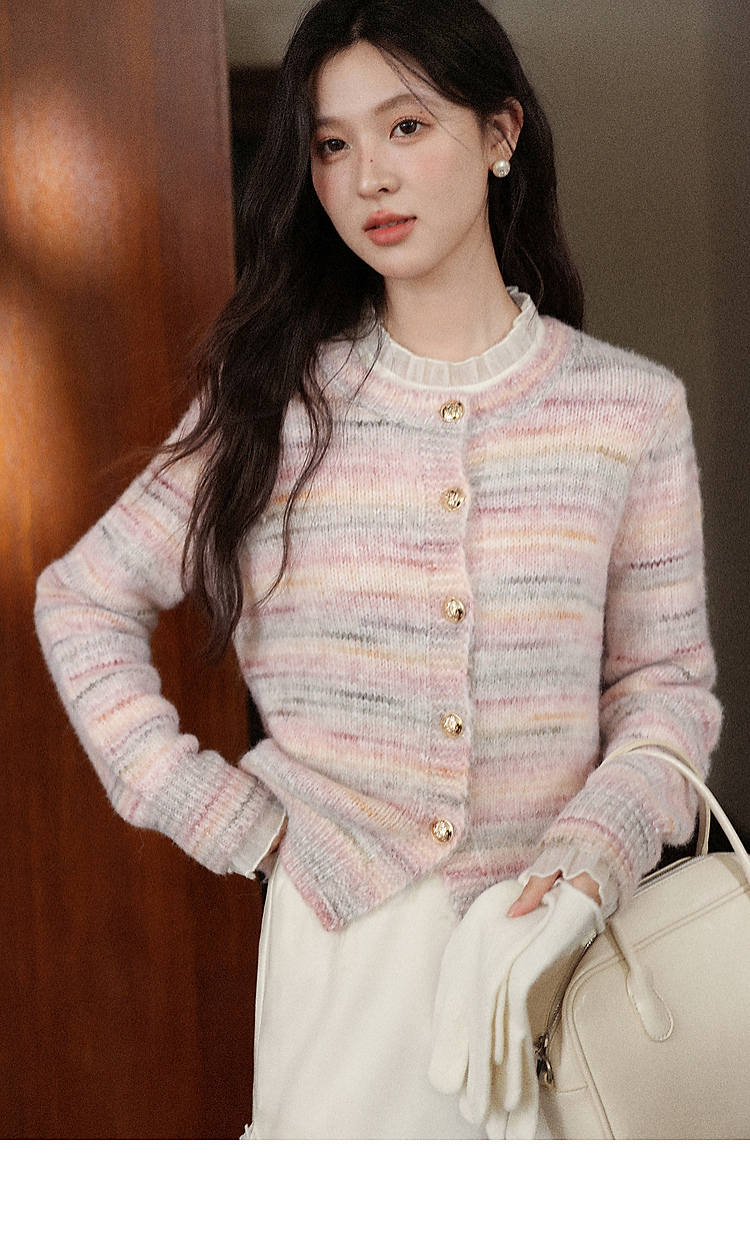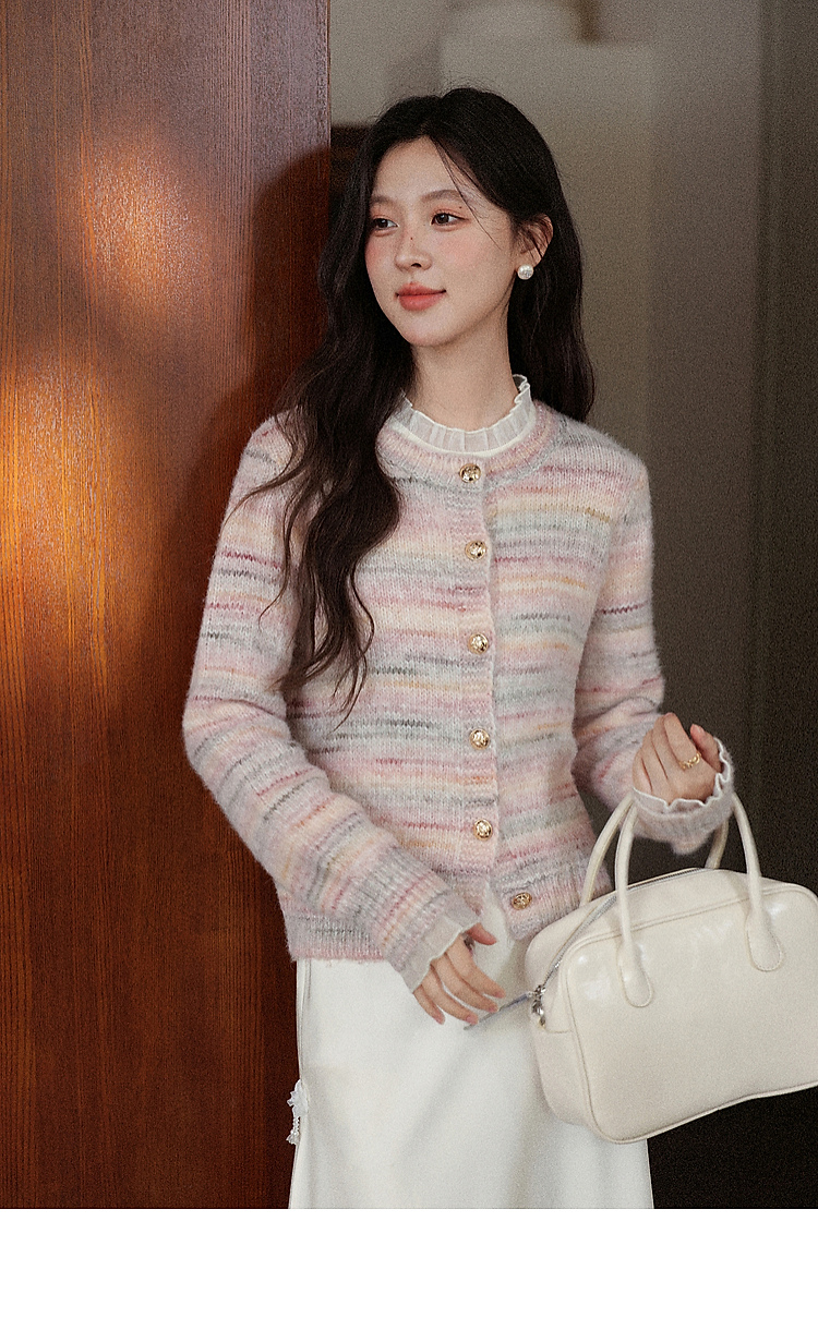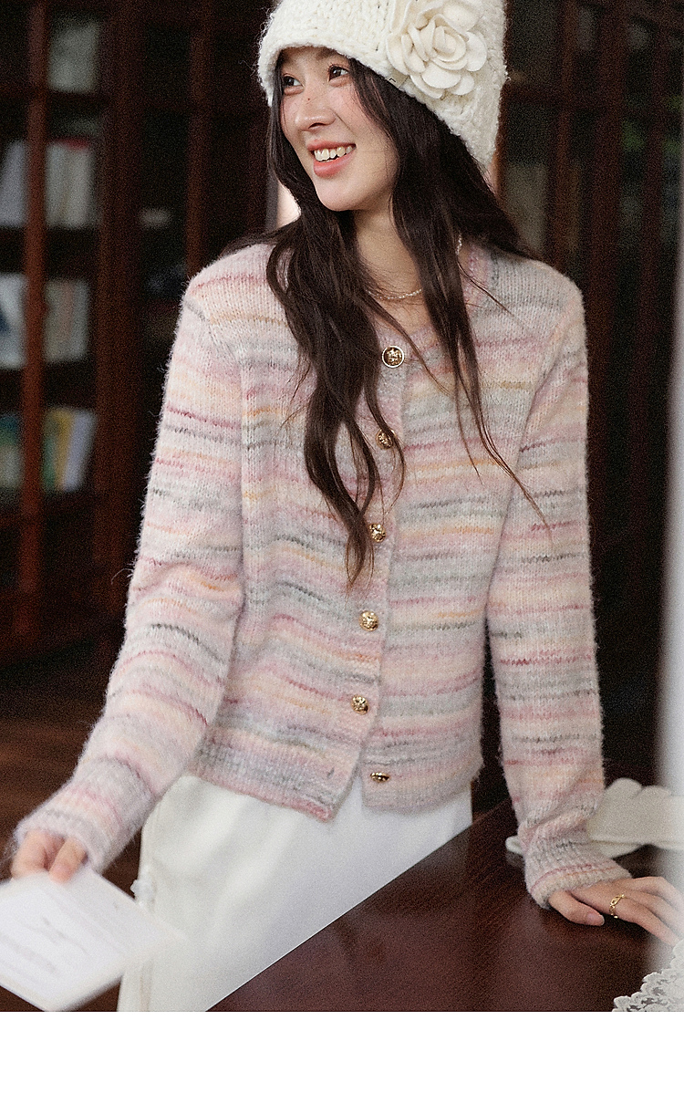 【6折秒杀】鹿向南「温暖左岸」小香风粉色条纹圆领短款针织毛衣开衫上衣女秋L58807