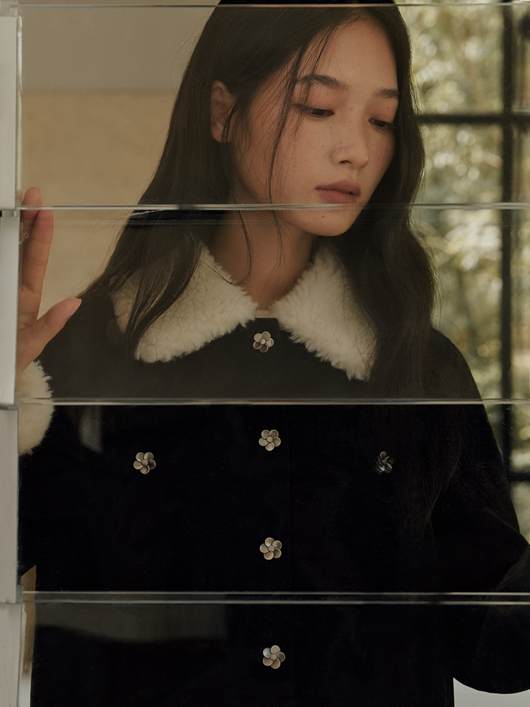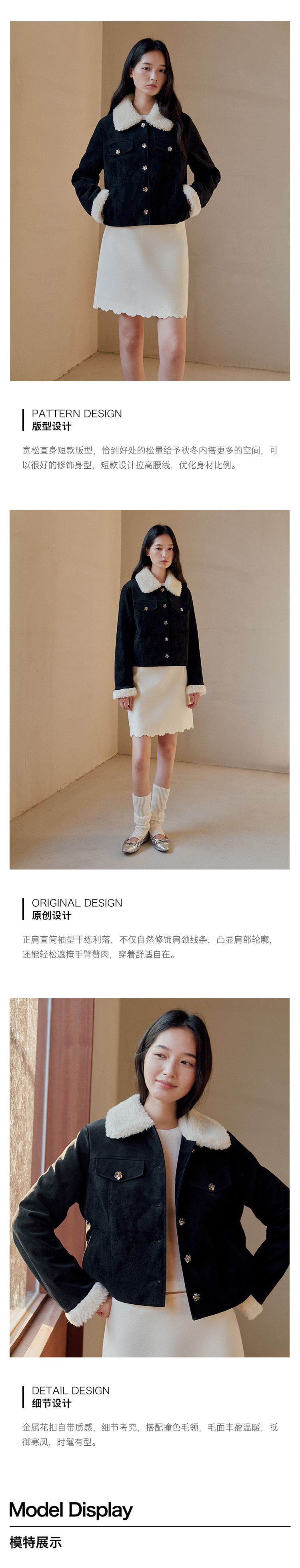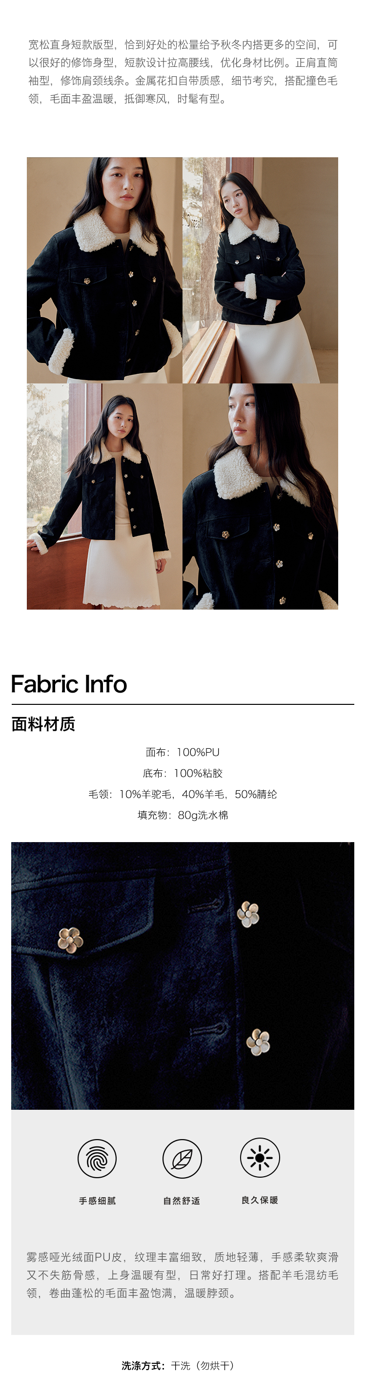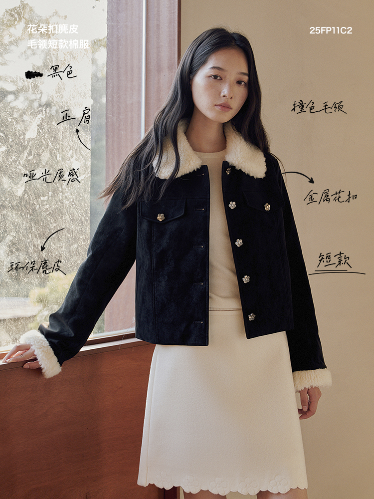 ForPoem 现货 25/FW原创设计花朵扣麂皮羊驼羊毛领子休闲短款棉服外套