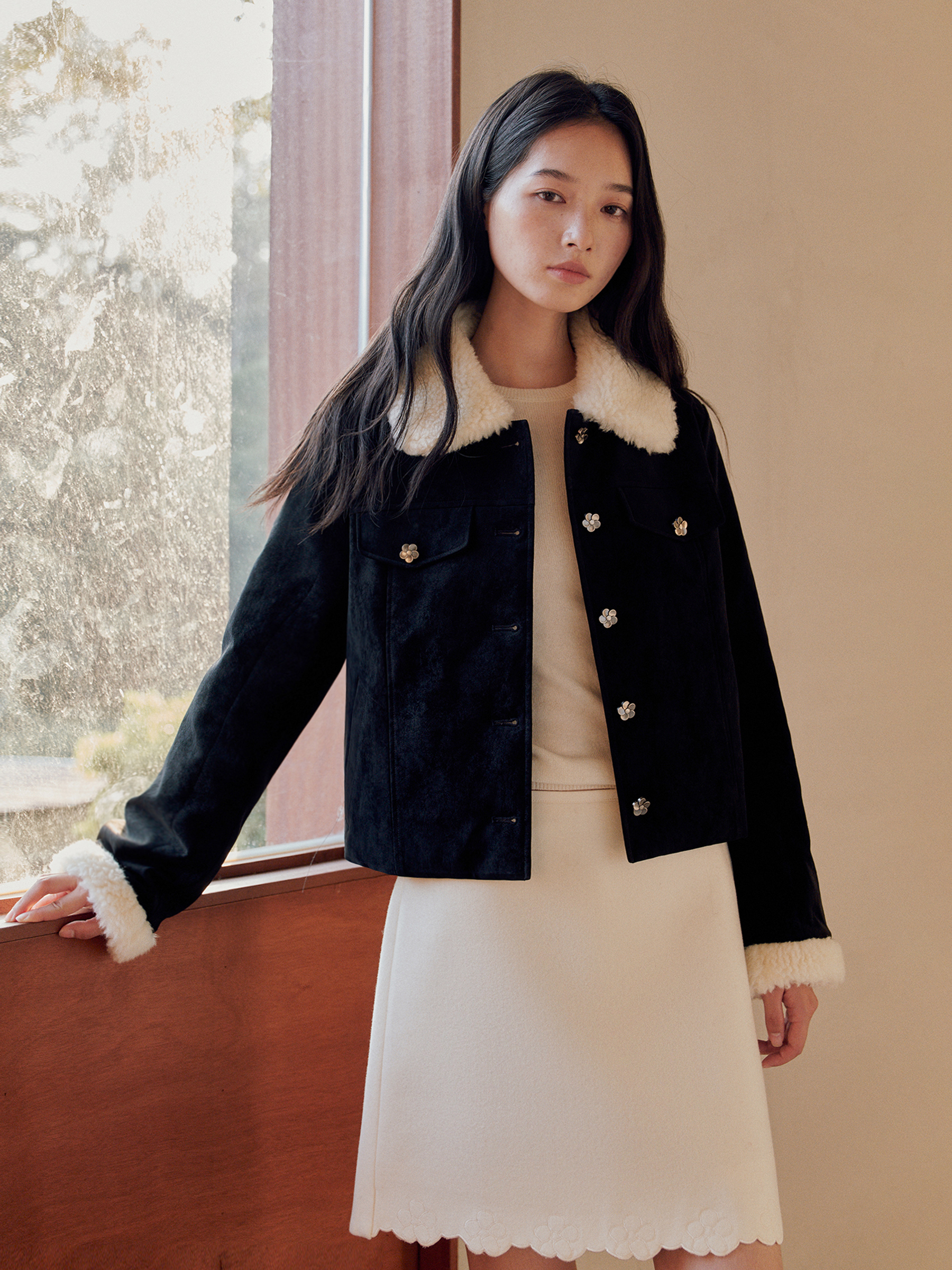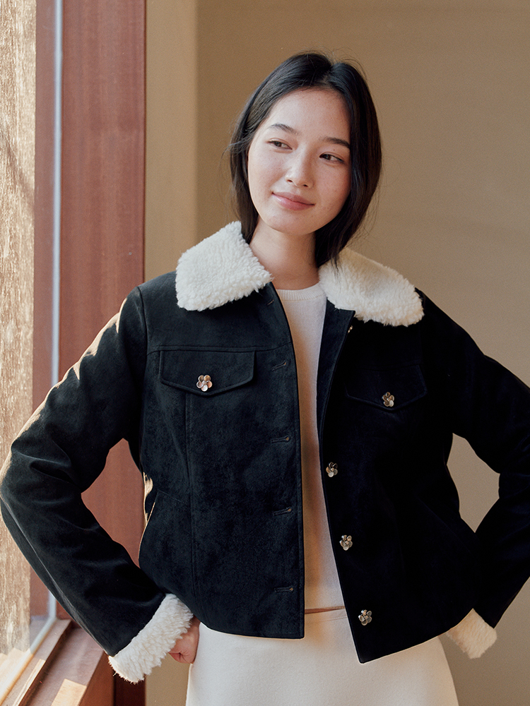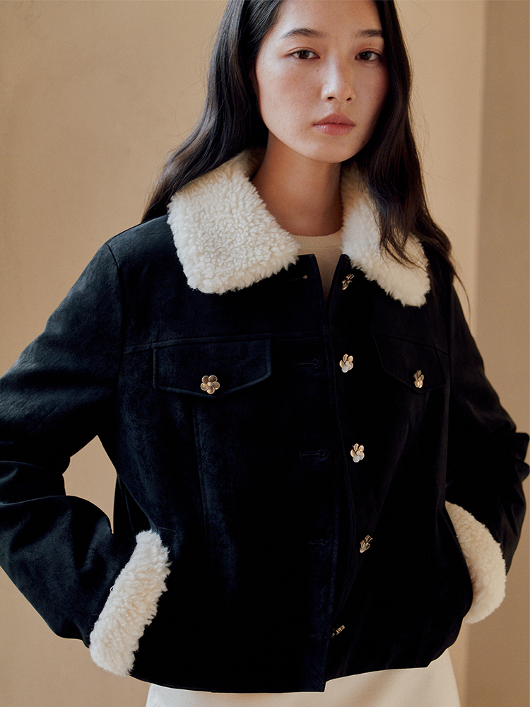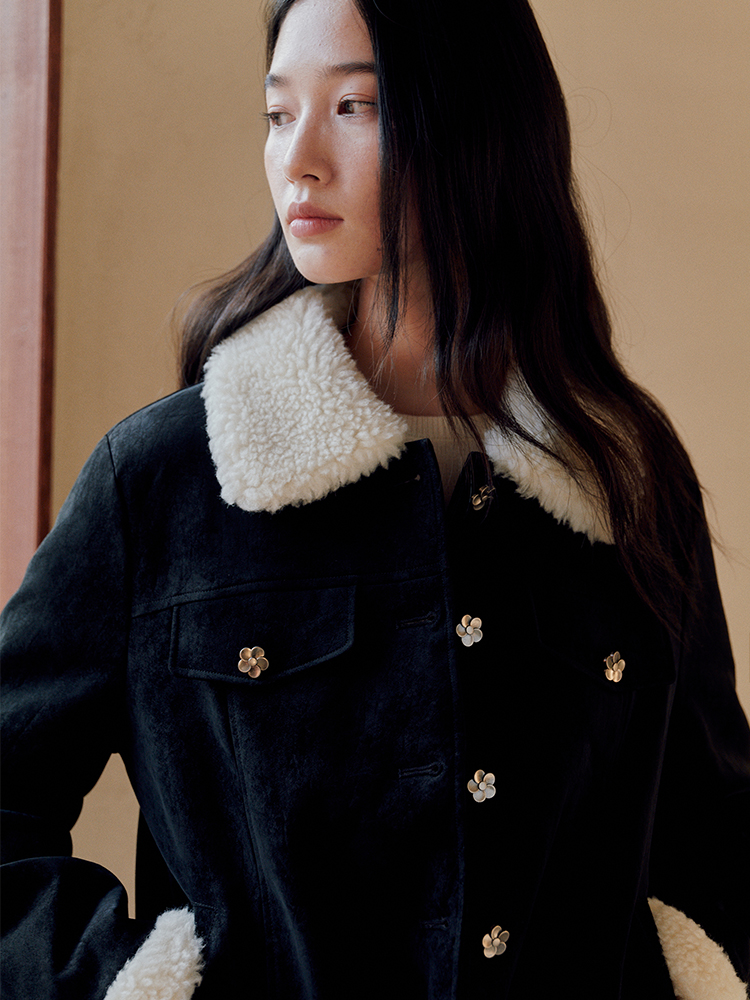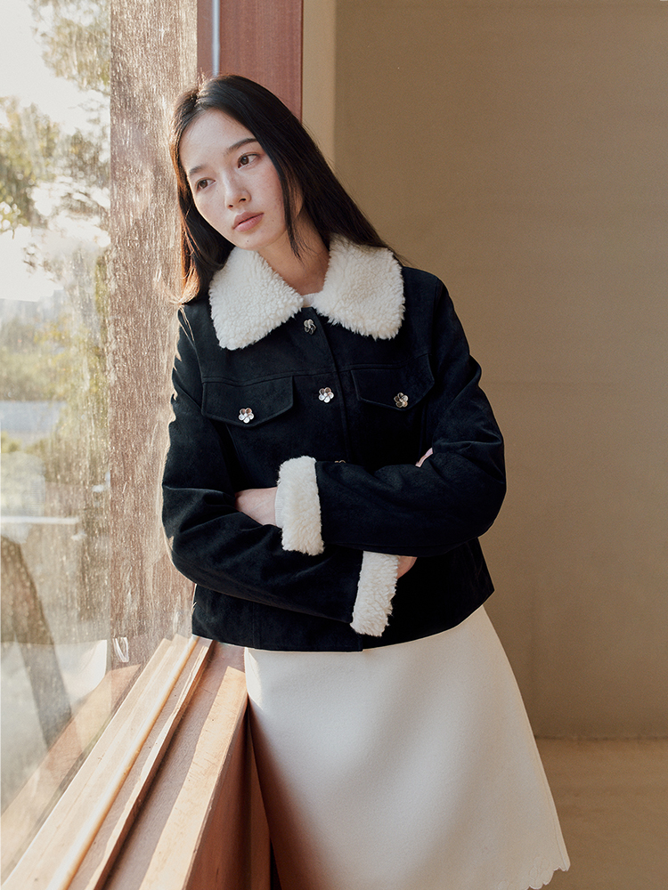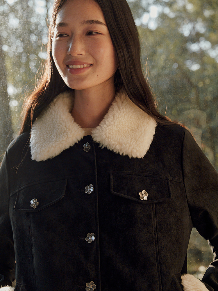 ForPoem 现货 25/FW原创设计花朵扣麂皮羊驼羊毛领子休闲短款棉服外套