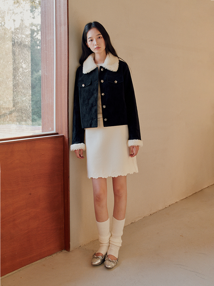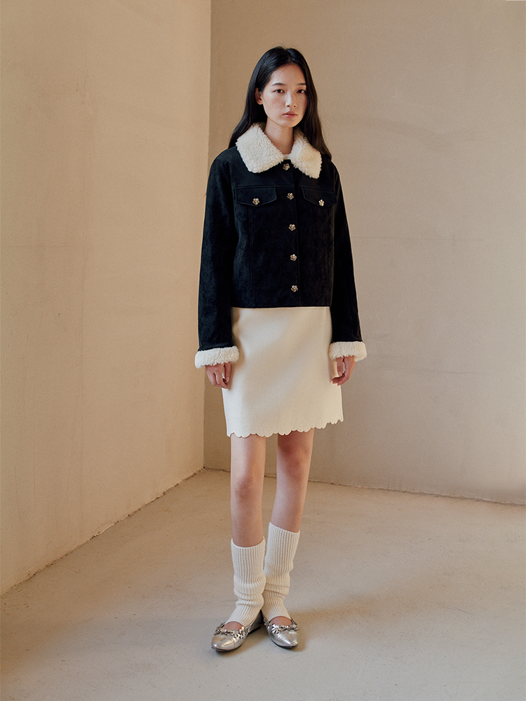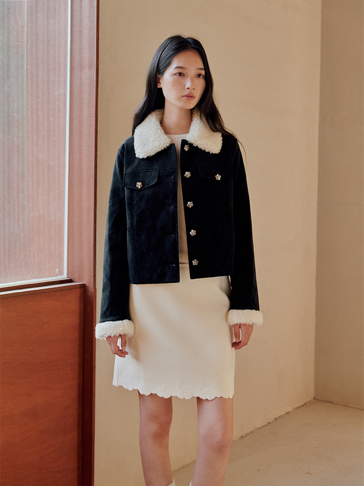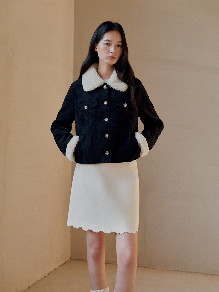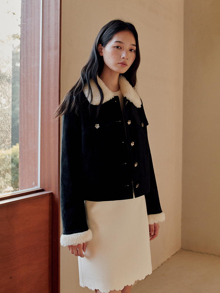 ForPoem 现货 25/FW原创设计花朵扣麂皮羊驼羊毛领子休闲短款棉服外套