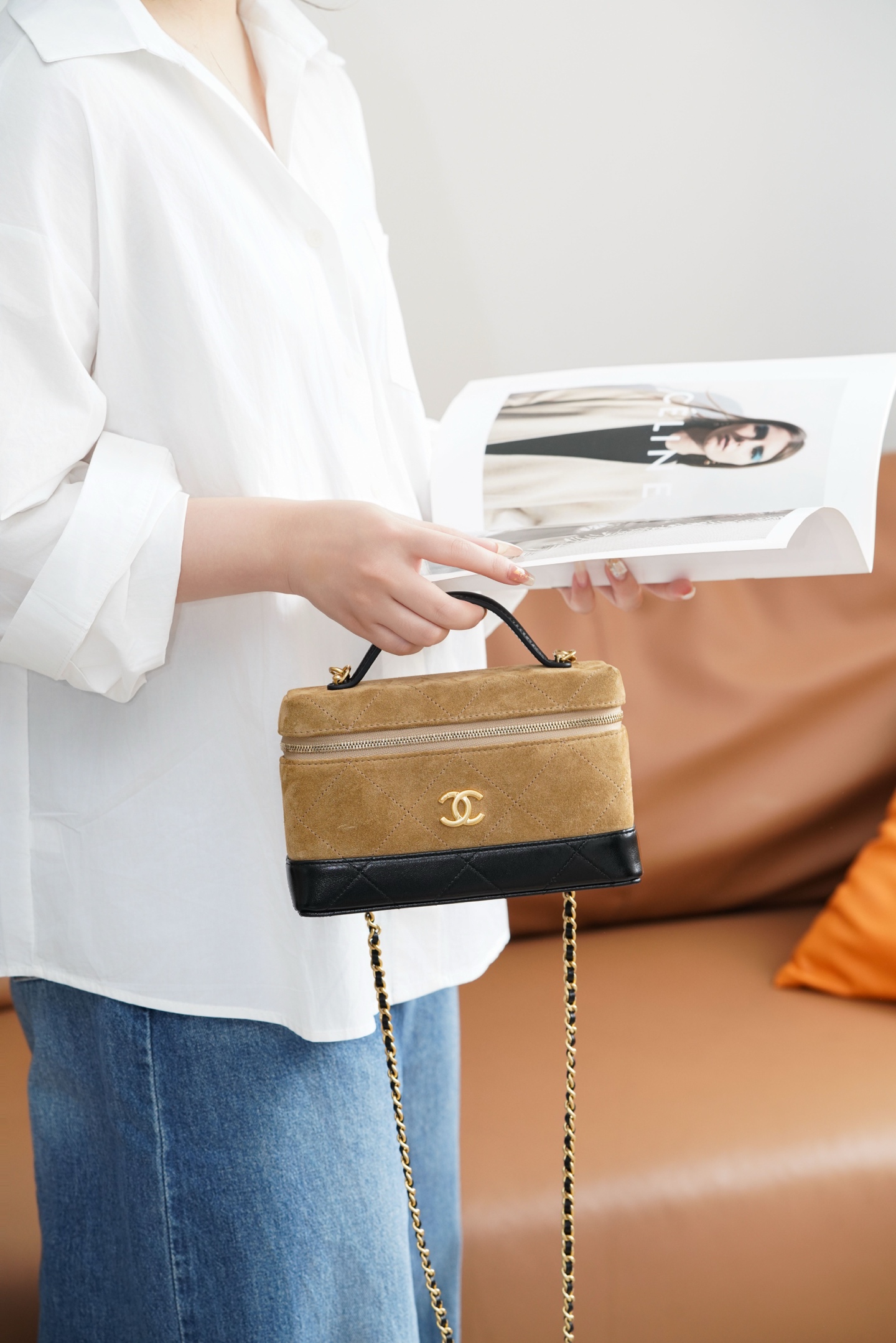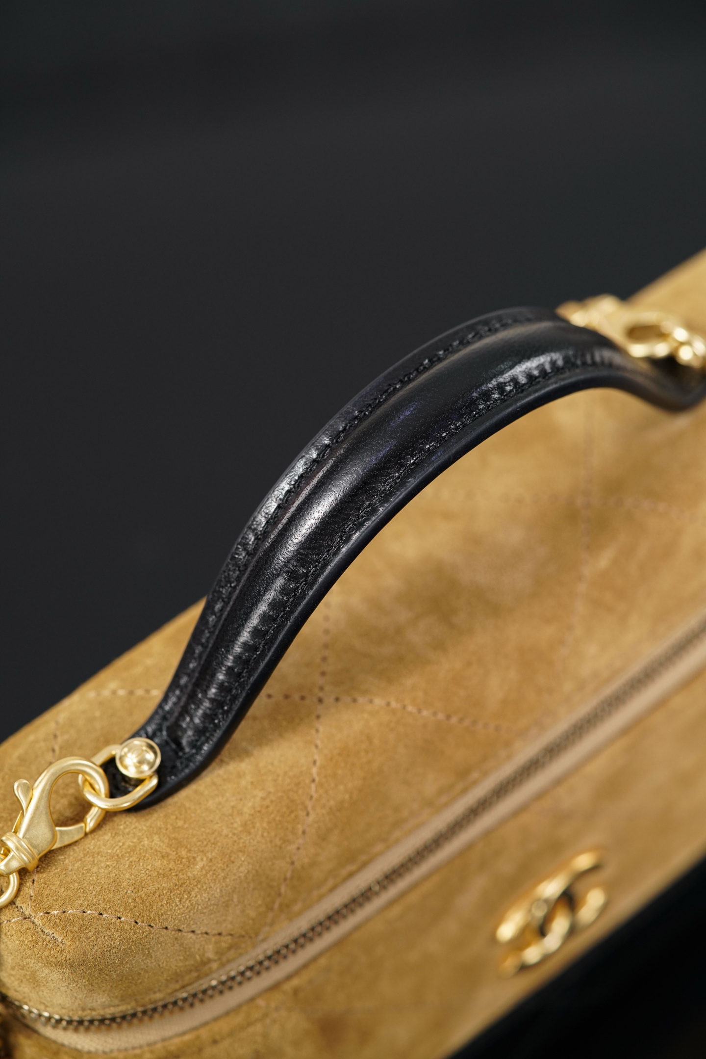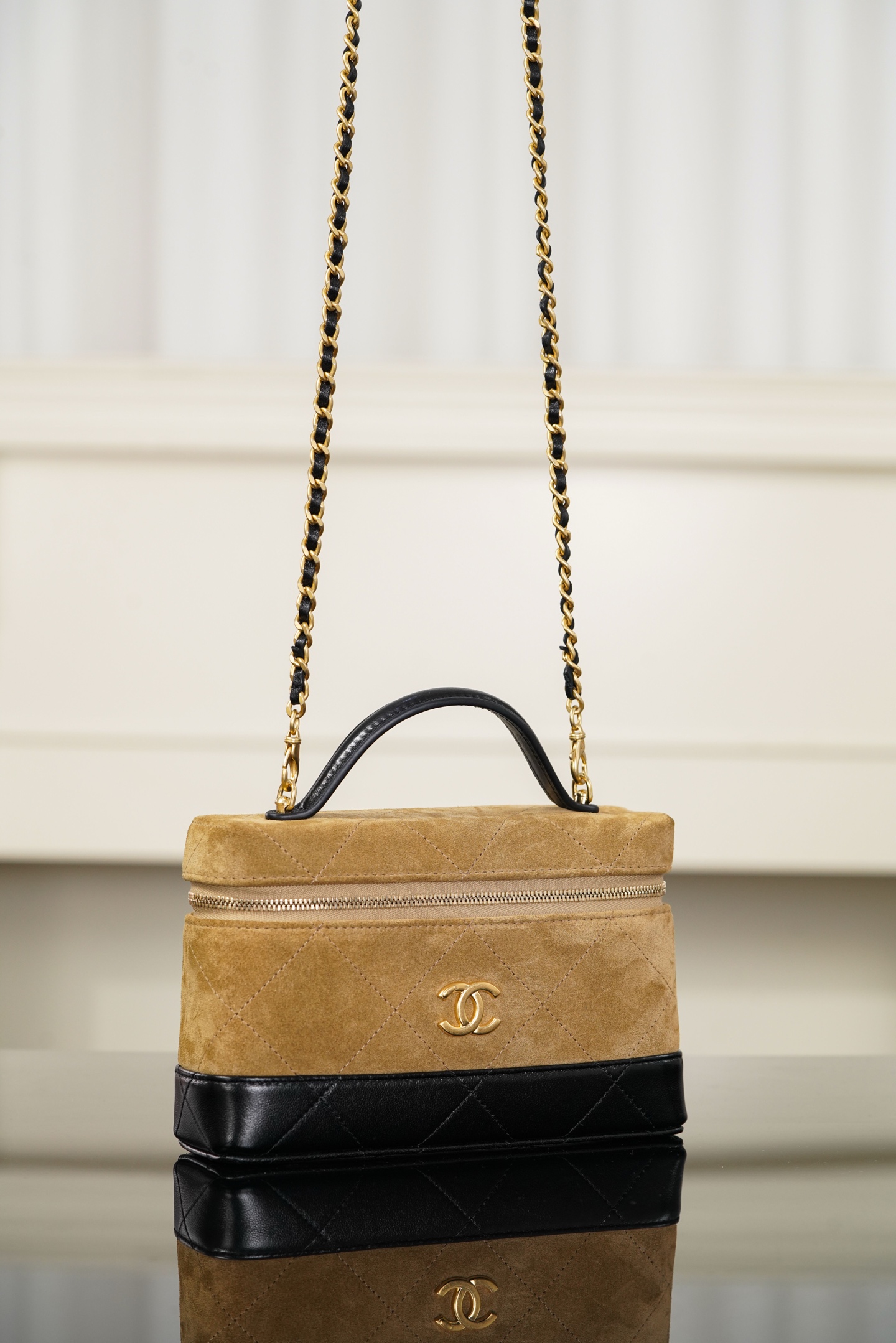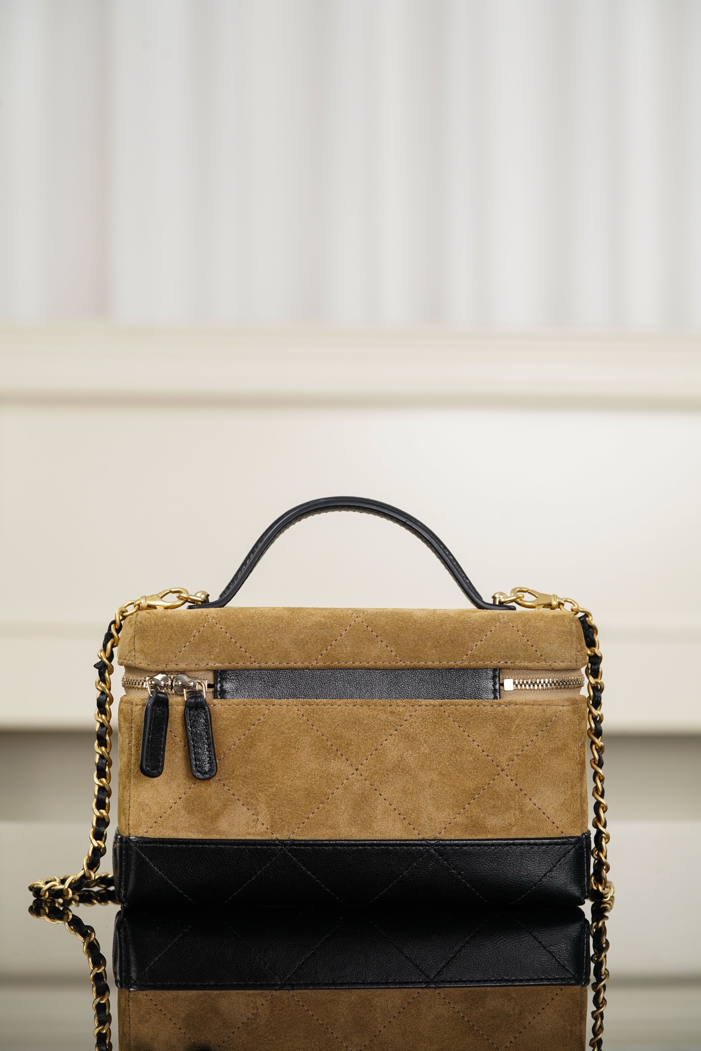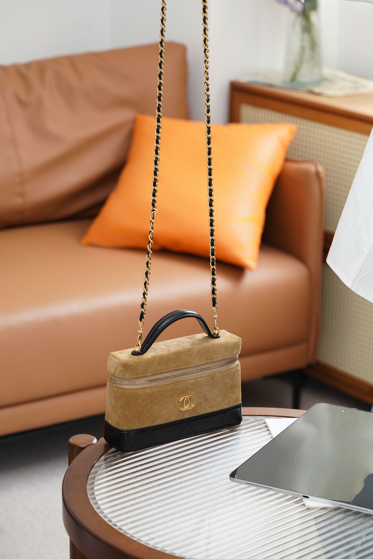 暖调麂皮与黑皮革的碰撞 自带复古滤镜的配色;方正挺括的包型自带“盒子包”辨识度‼️ 延续香奈儿标志性菱格缝线 针脚细腻立体,进口麂皮绒面细腻柔软,包底与手柄采用光滑小牛皮 纹理紧实耐磨🐂 哑光做旧五金内敛自带柔光感~ 链条🉑拆卸;