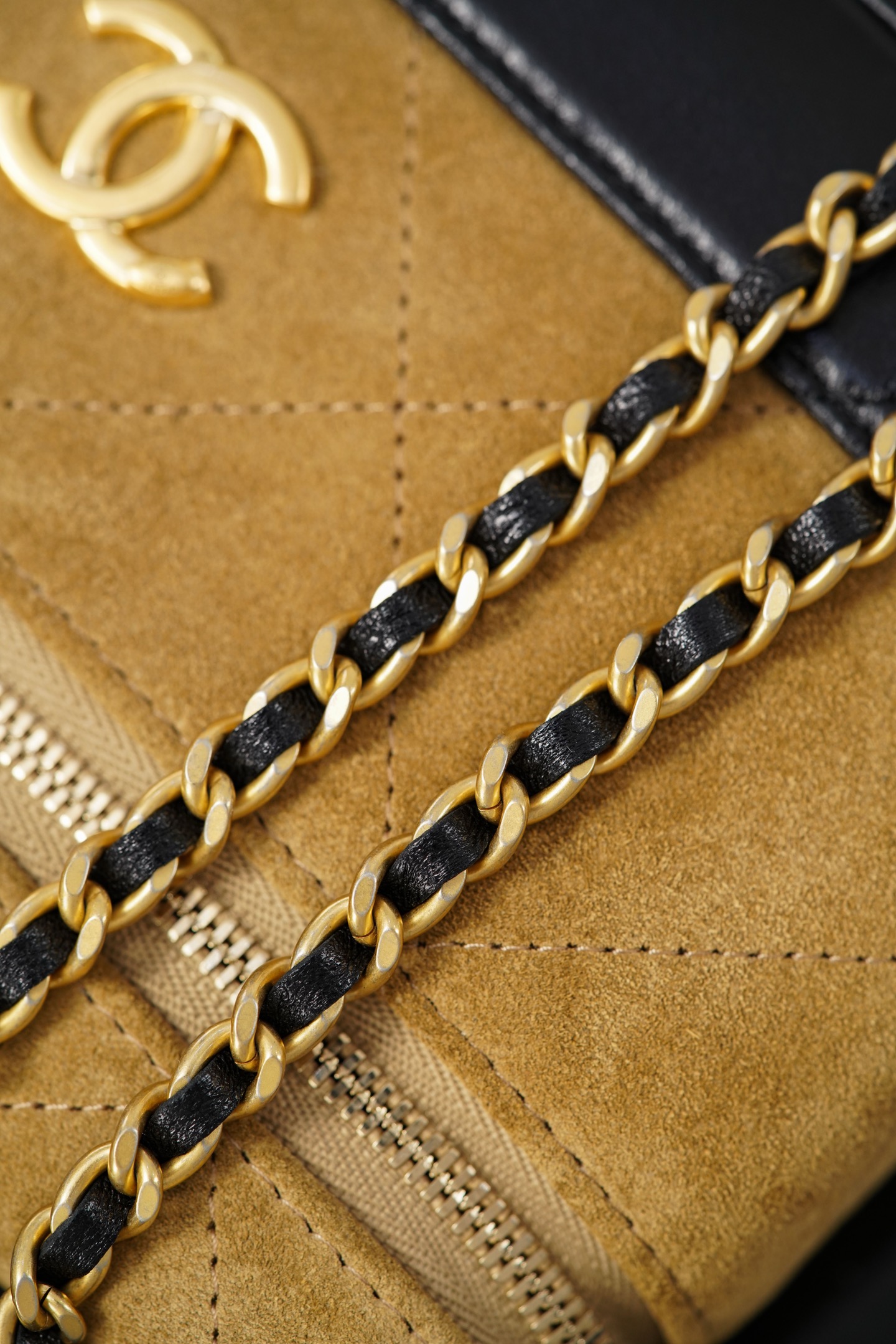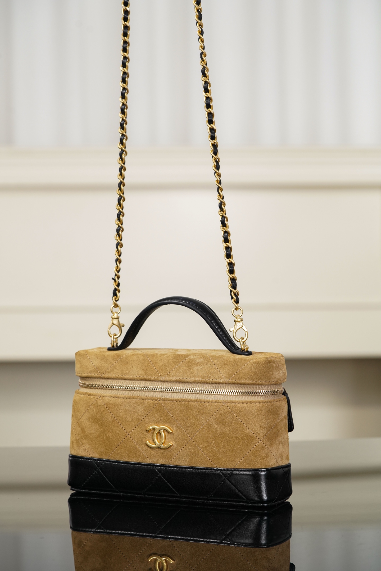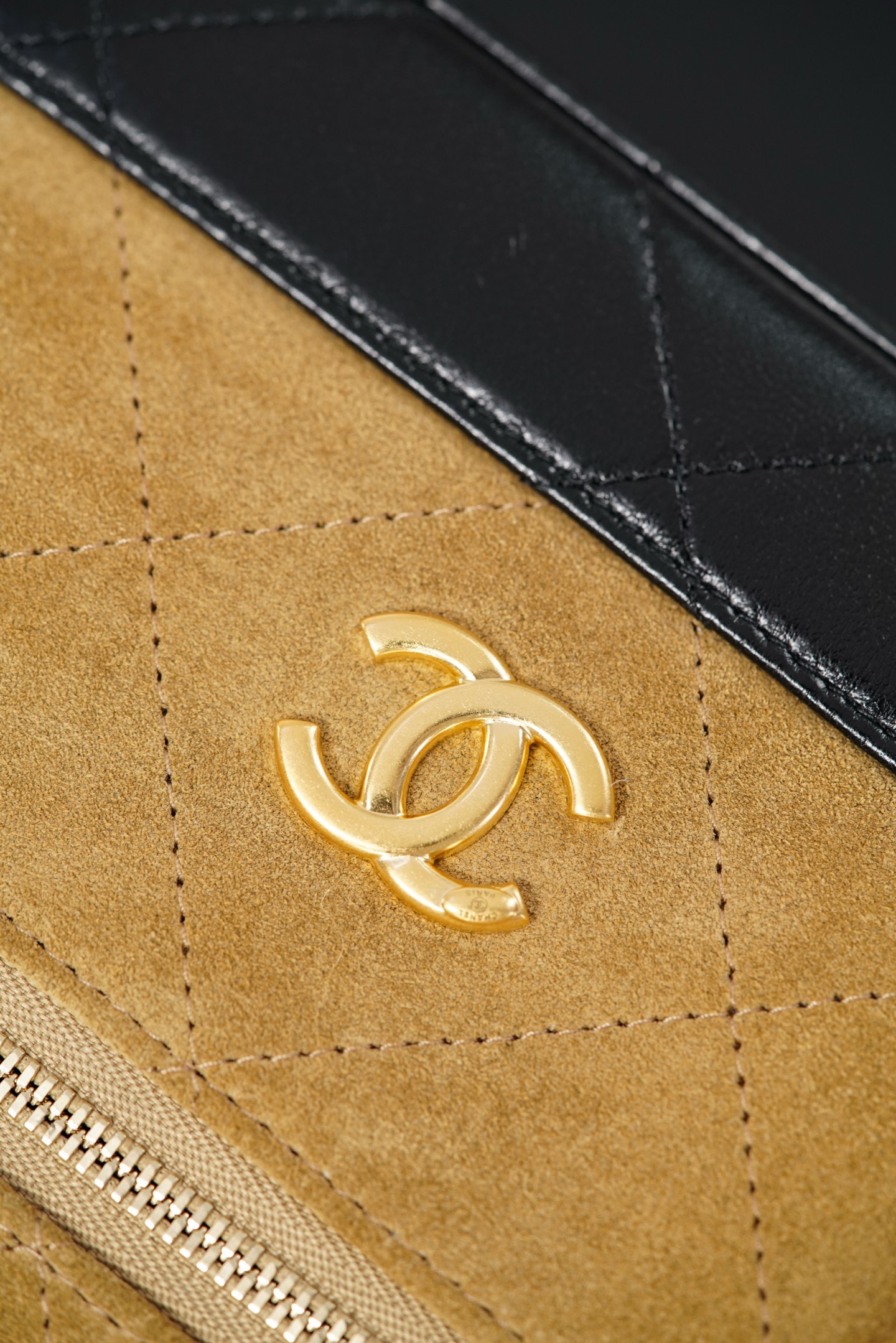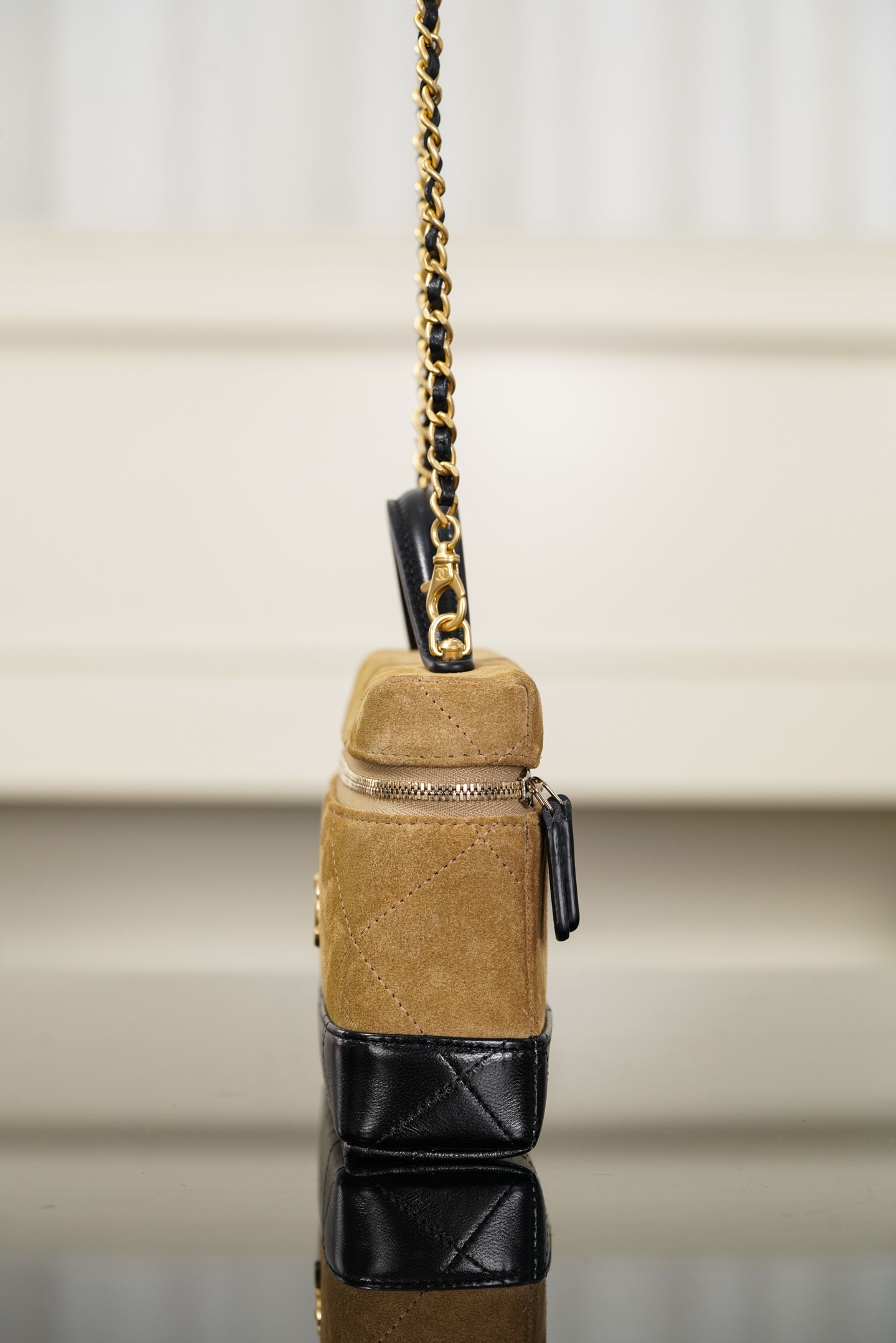 暖调麂皮与黑皮革的碰撞 自带复古滤镜的配色;方正挺括的包型自带“盒子包”辨识度‼️ 延续香奈儿标志性菱格缝线 针脚细腻立体,进口麂皮绒面细腻柔软,包底与手柄采用光滑小牛皮 纹理紧实耐磨🐂 哑光做旧五金内敛自带柔光感~ 链条🉑拆卸;