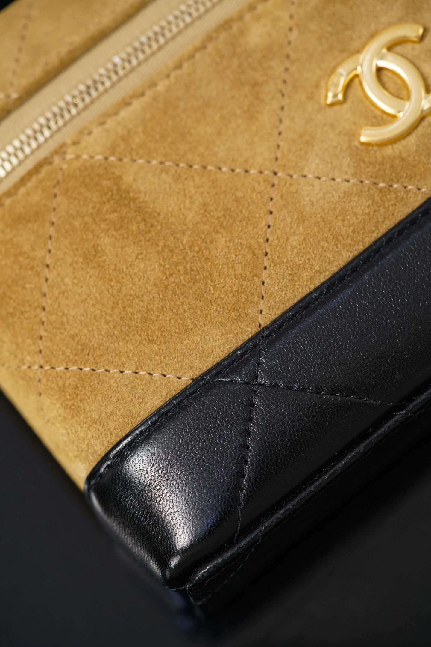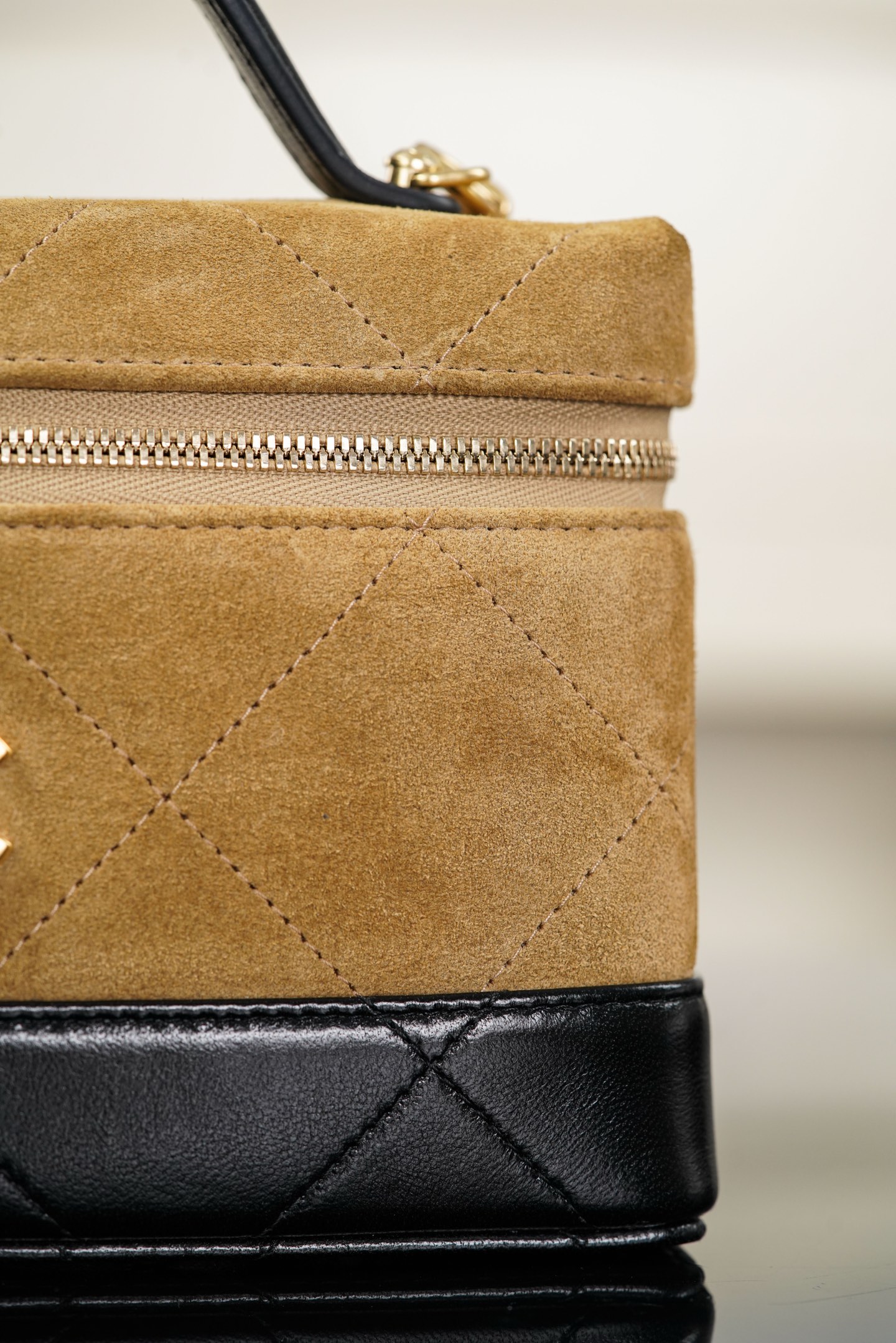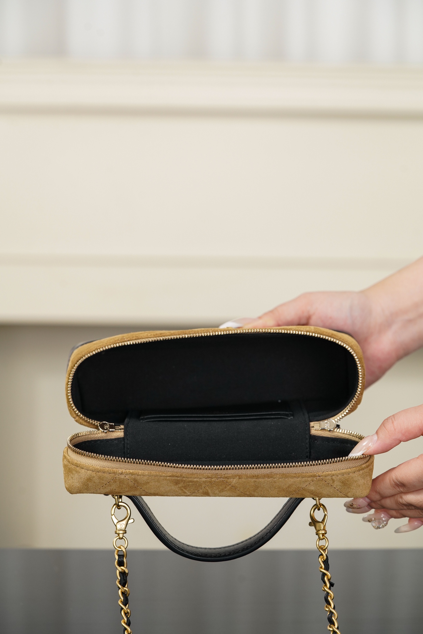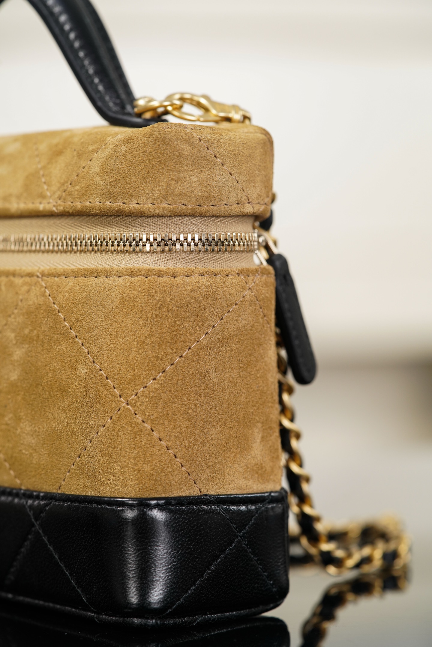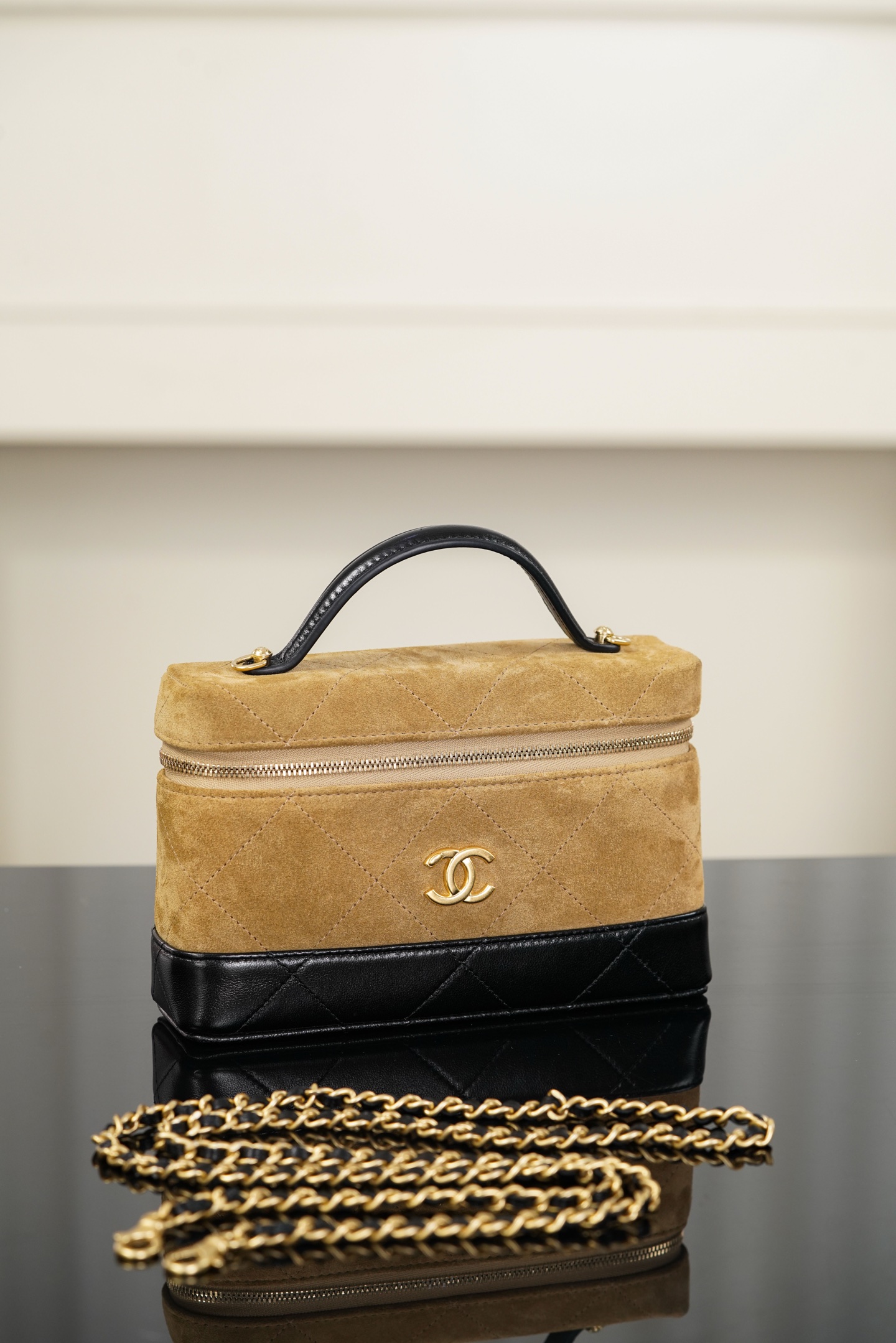 暖调麂皮与黑皮革的碰撞 自带复古滤镜的配色;方正挺括的包型自带“盒子包”辨识度‼️ 延续香奈儿标志性菱格缝线 针脚细腻立体,进口麂皮绒面细腻柔软,包底与手柄采用光滑小牛皮 纹理紧实耐磨🐂 哑光做旧五金内敛自带柔光感~ 链条🉑拆卸;