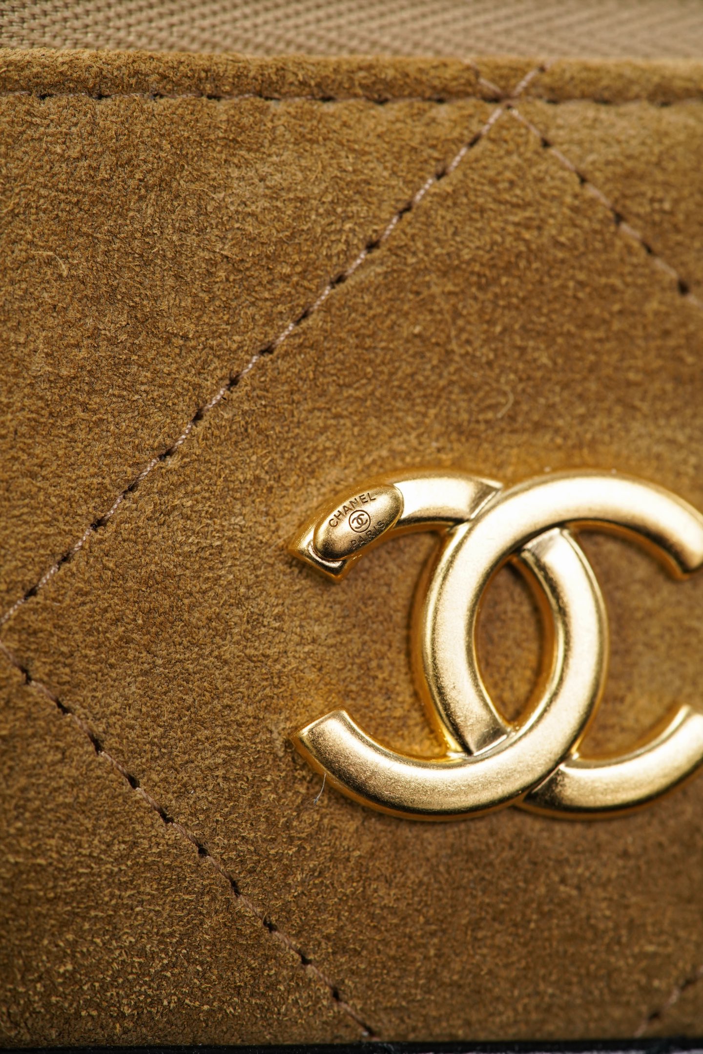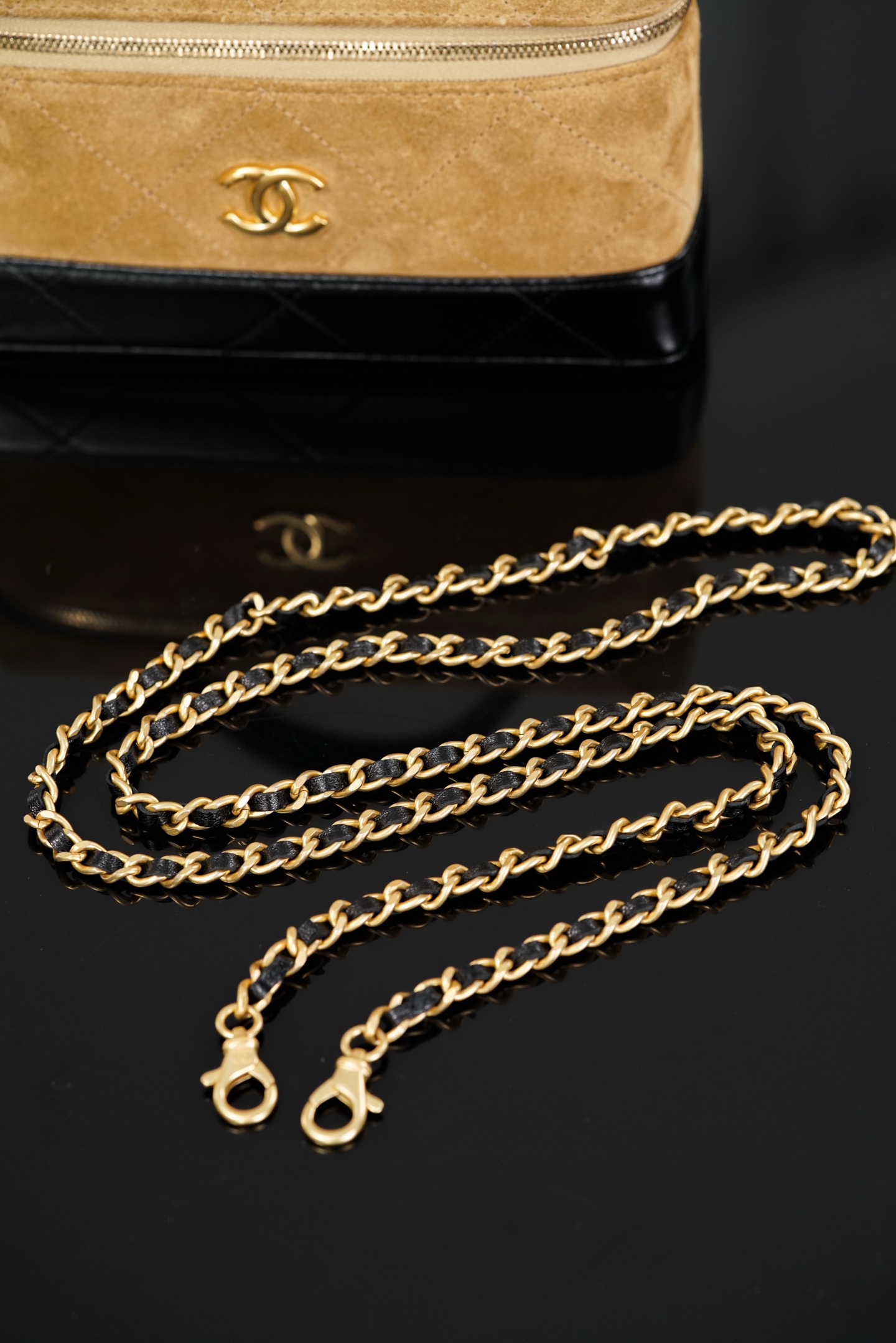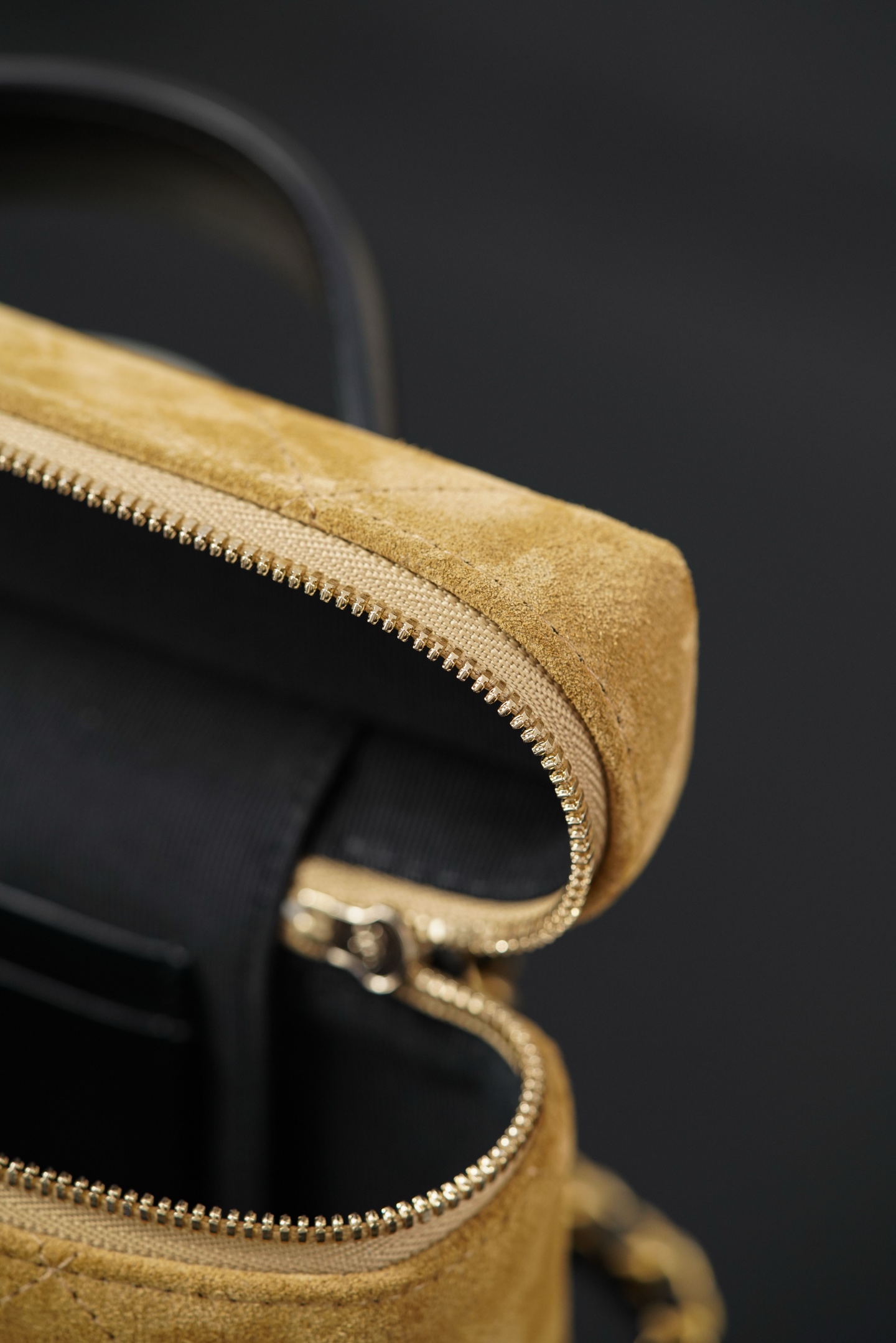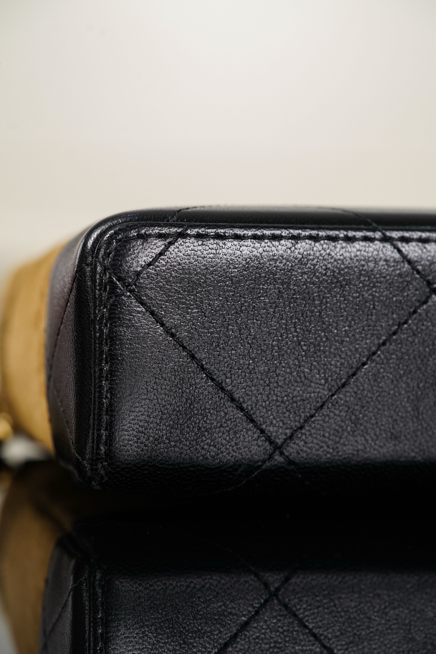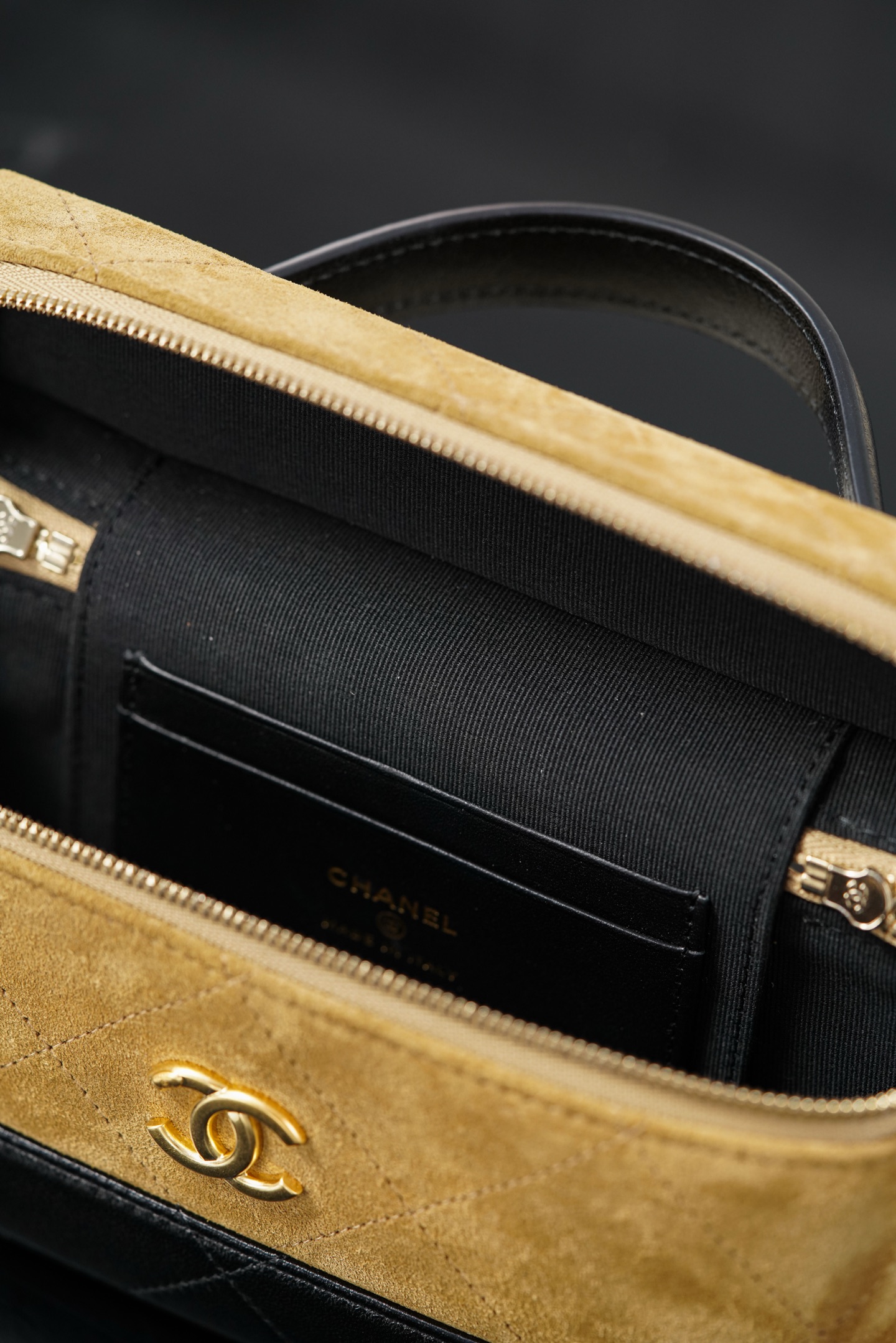 暖调麂皮与黑皮革的碰撞 自带复古滤镜的配色;方正挺括的包型自带“盒子包”辨识度‼️ 延续香奈儿标志性菱格缝线 针脚细腻立体,进口麂皮绒面细腻柔软,包底与手柄采用光滑小牛皮 纹理紧实耐磨🐂 哑光做旧五金内敛自带柔光感~ 链条🉑拆卸;