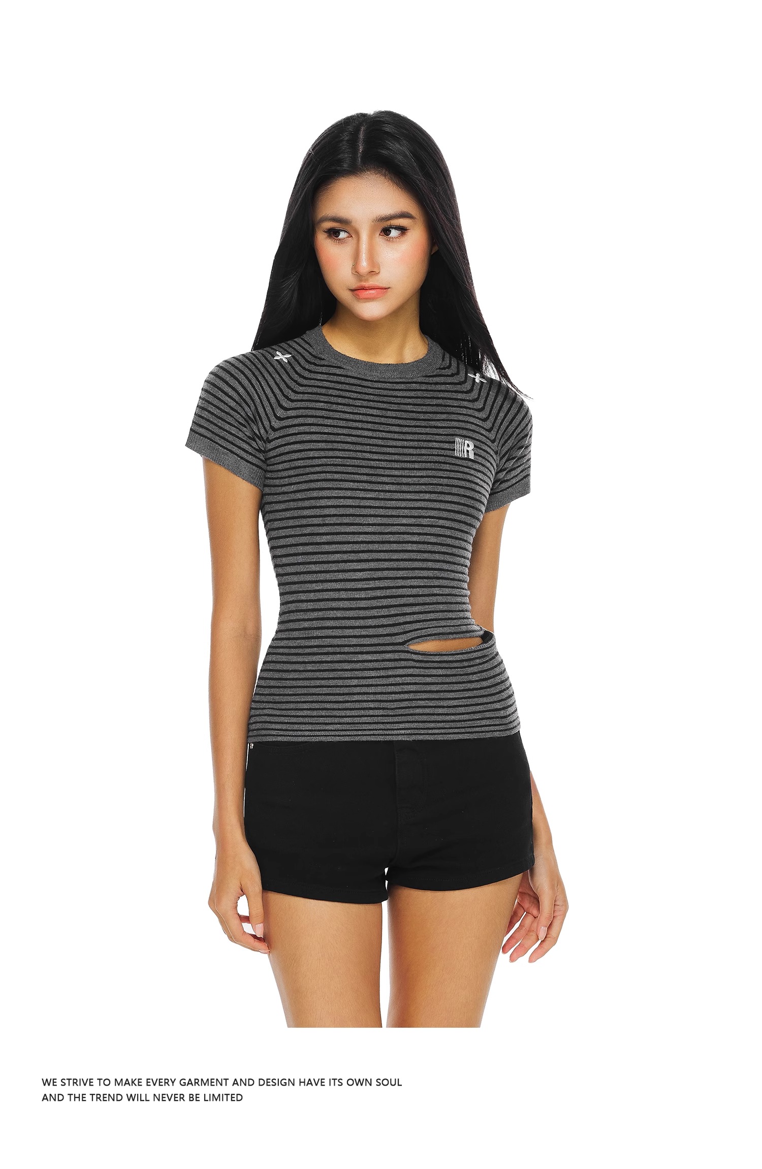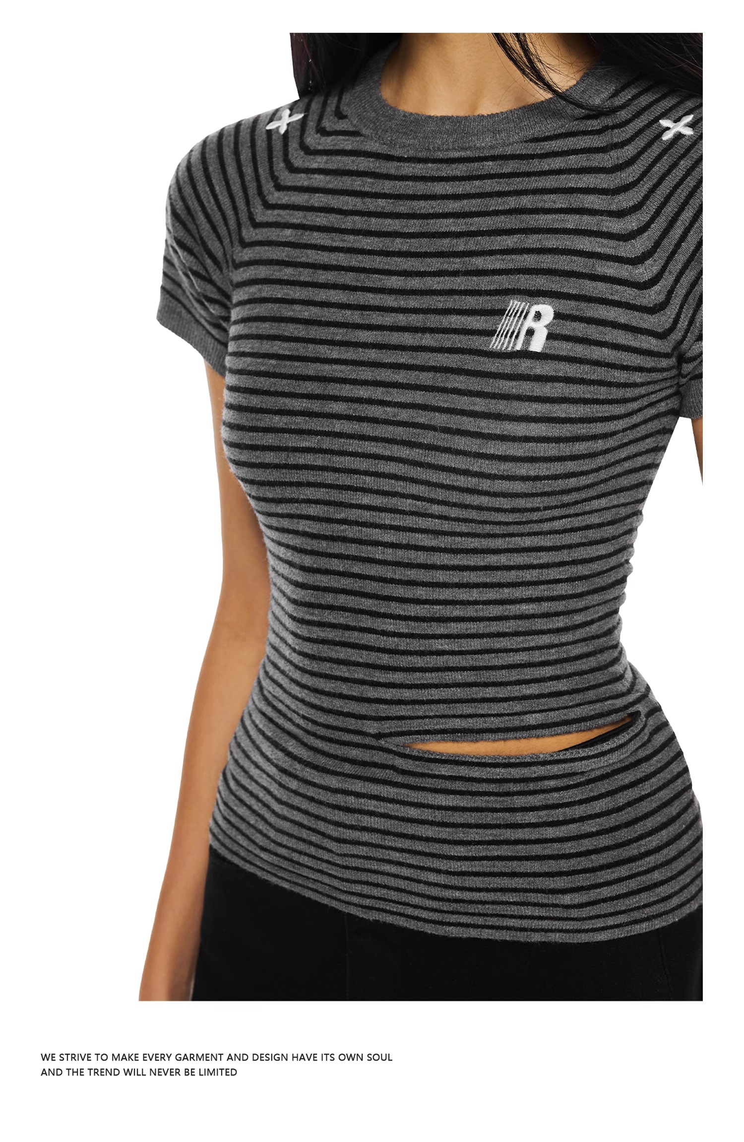 FDR官方店 辣妹圆领条纹T恤女夏季新款修身显瘦体恤上衣