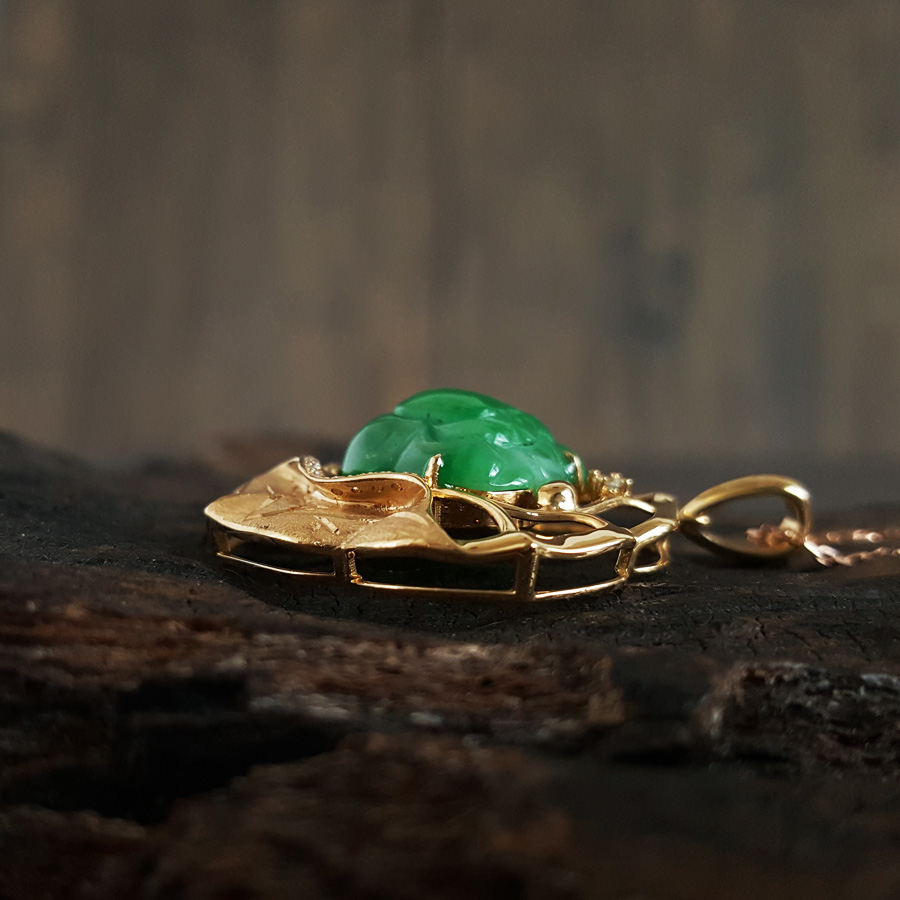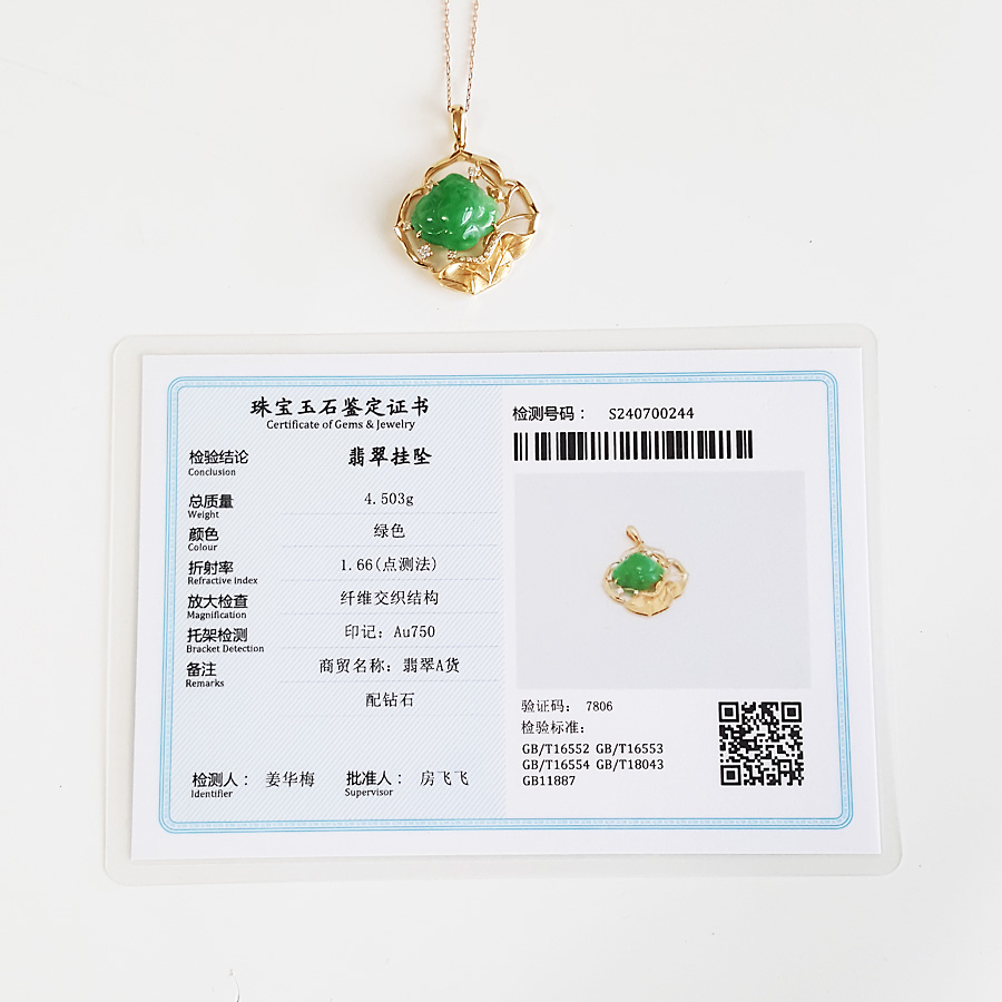 【天然正品】AU750黄金镶钻镶天然糯种满绿色荷花翡翠(高贵、廉洁)吊坠项链040724NJM07
