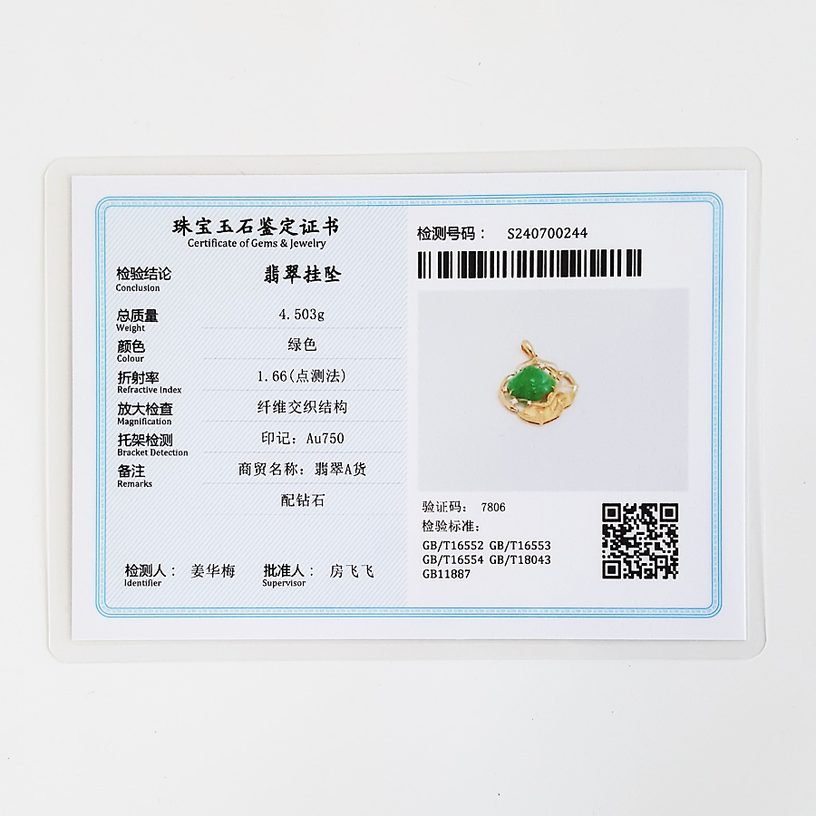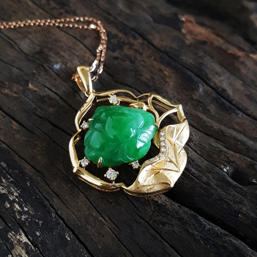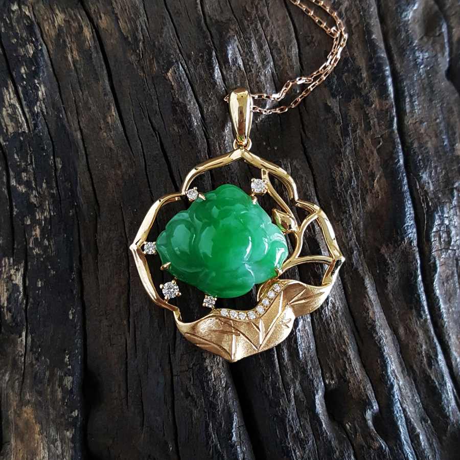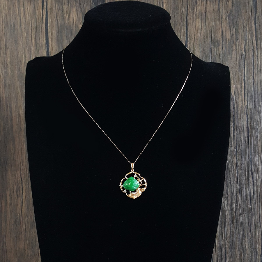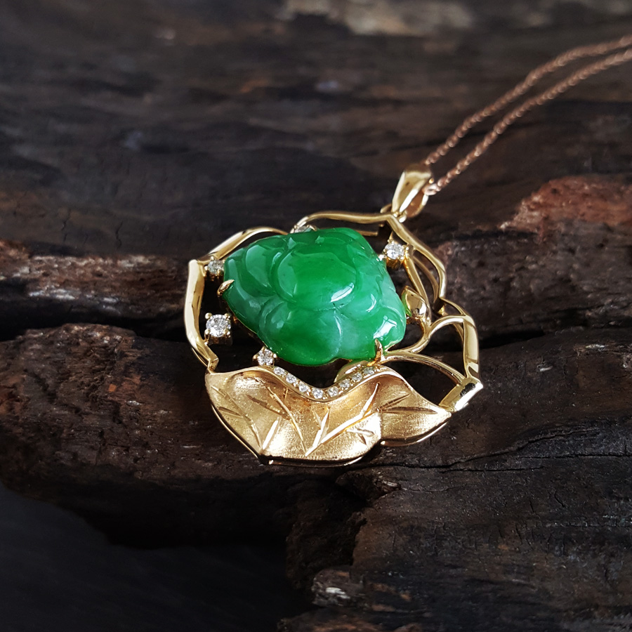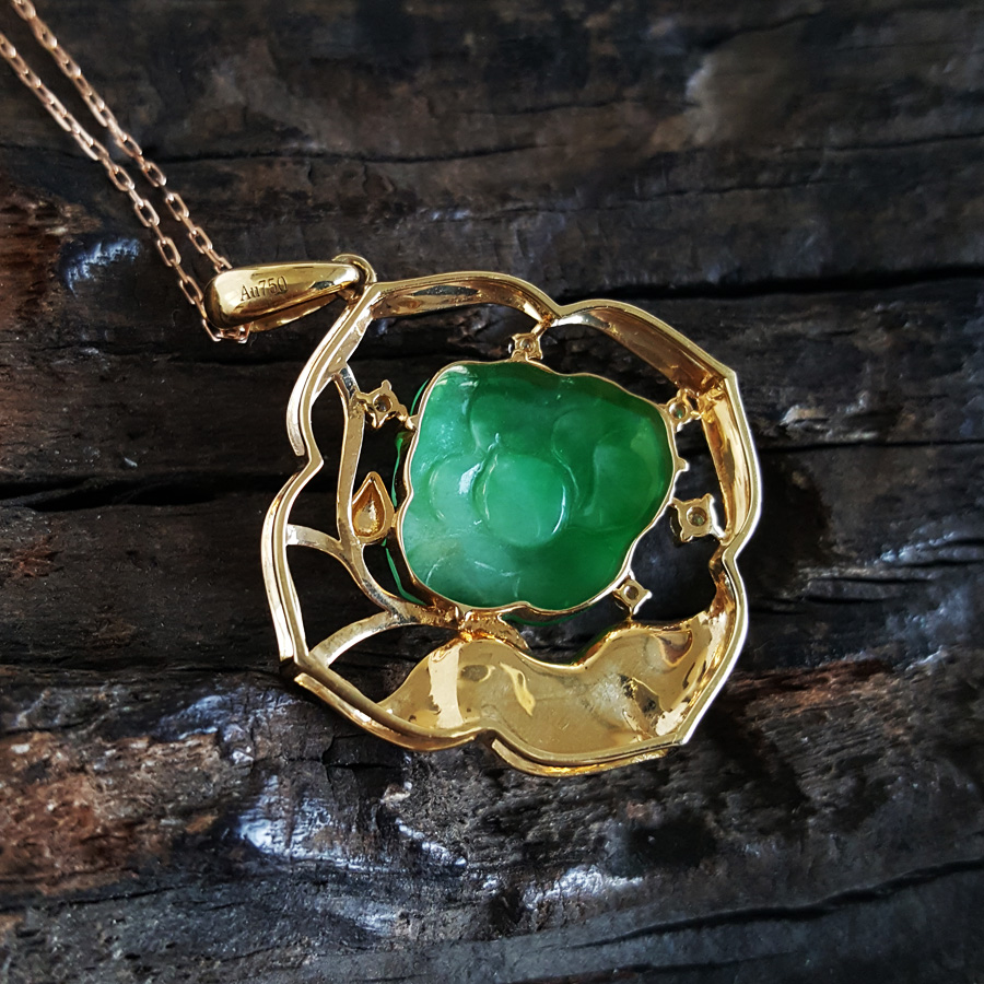 名称 | AU750黄金镶钻镶天然糯种满绿色荷花翡翠(高贵、廉洁)吊坠项链 |