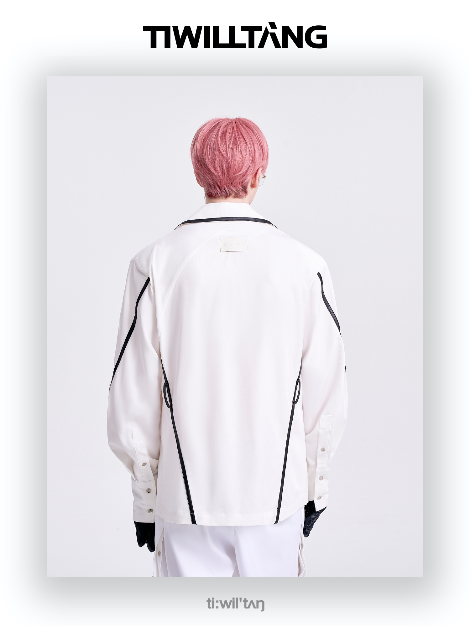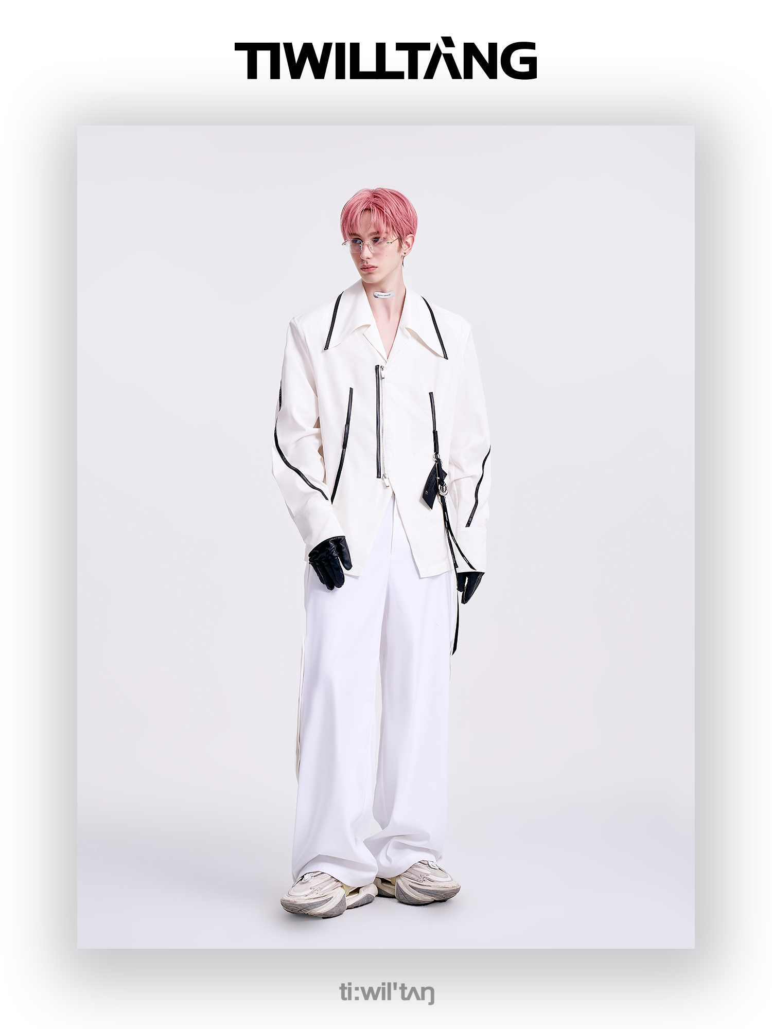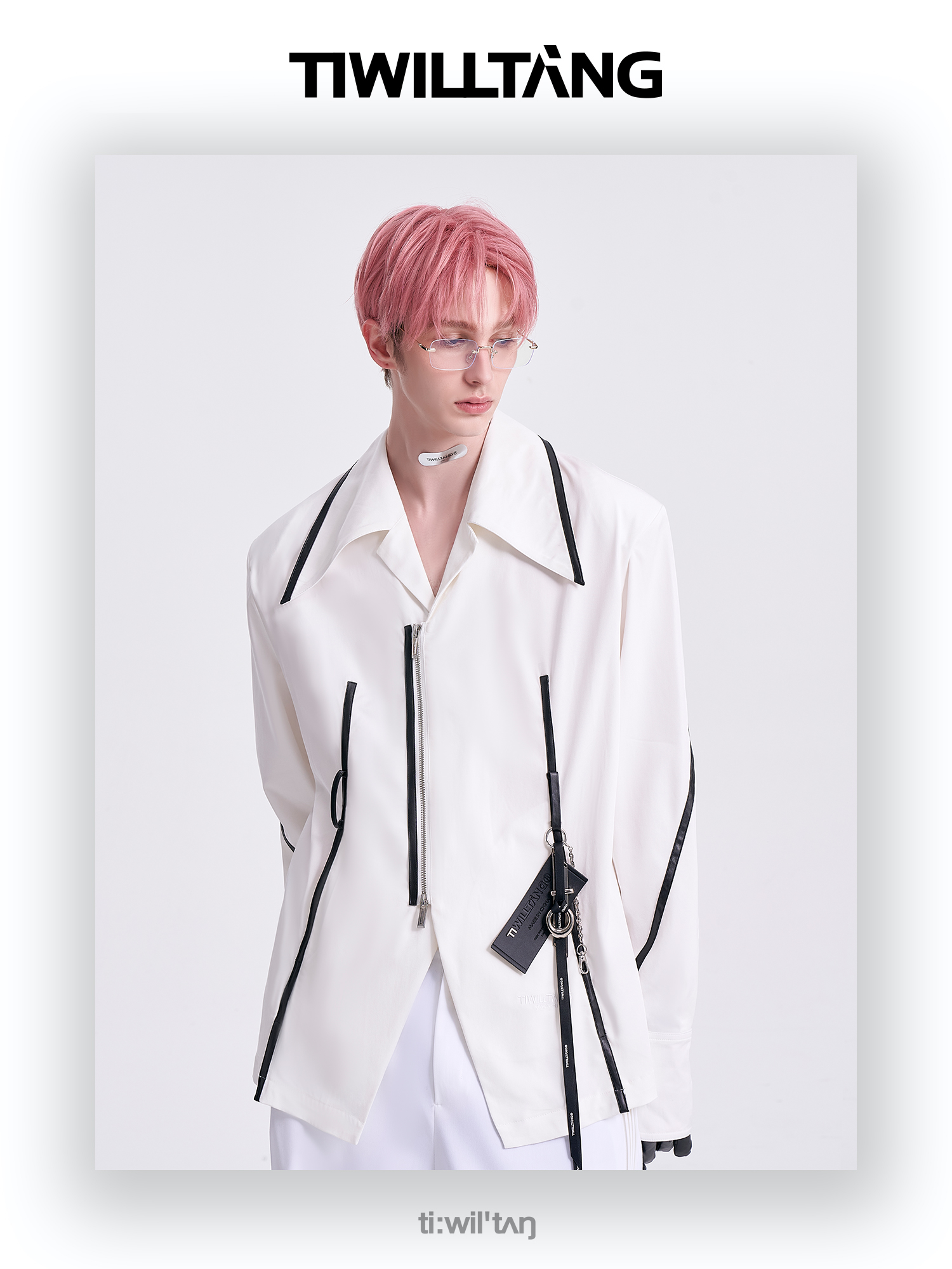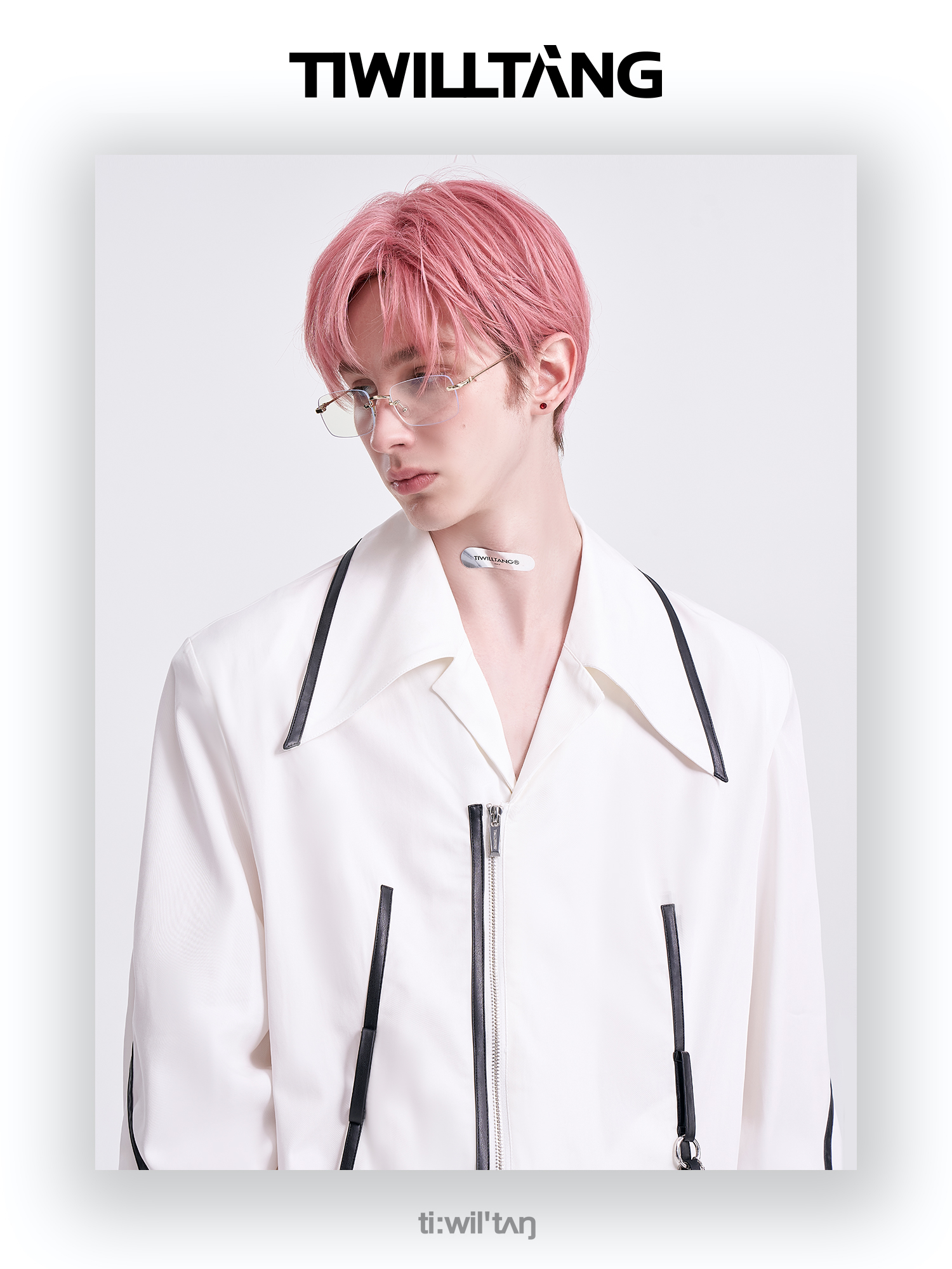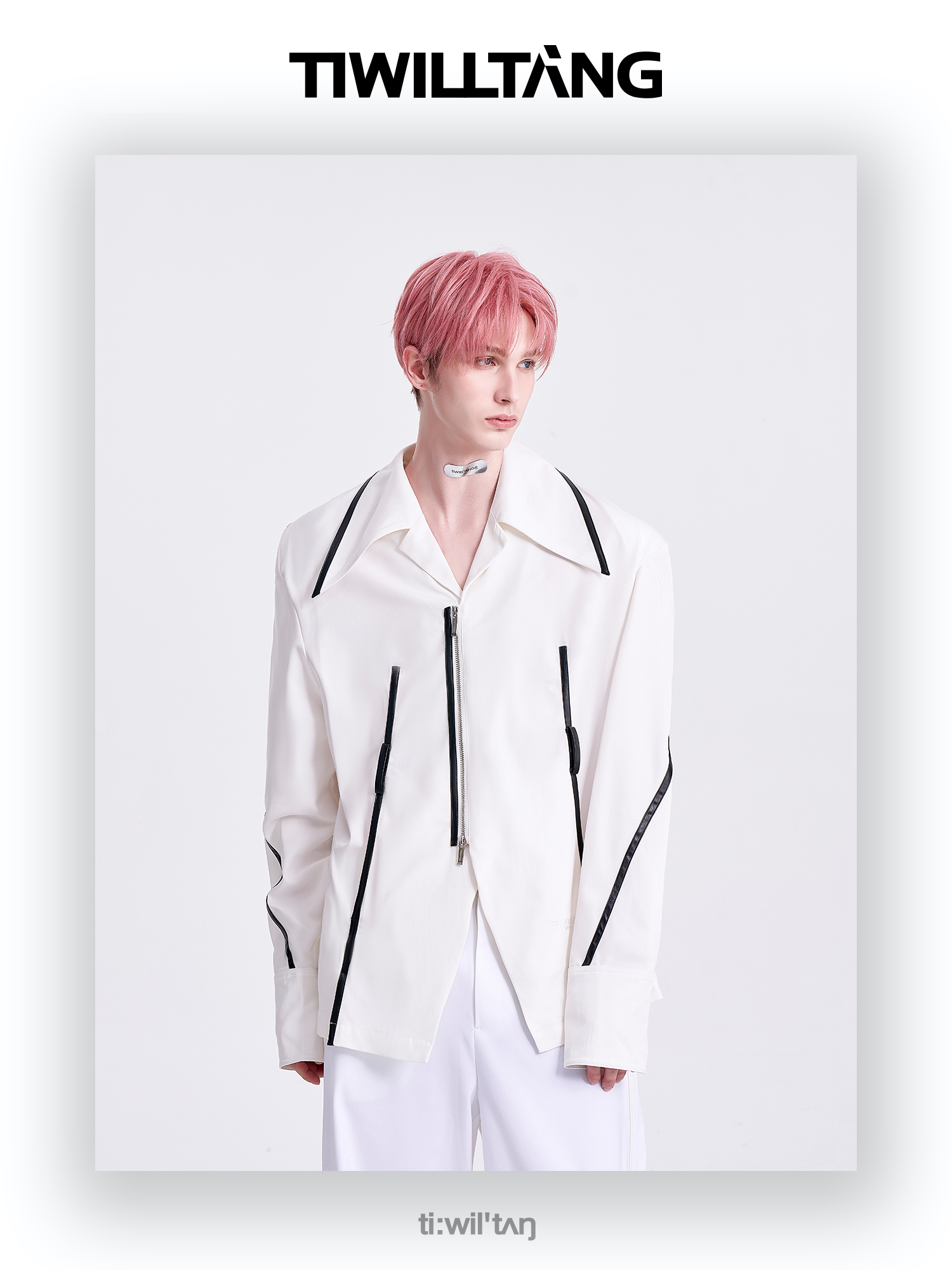 启世录TIWILLTANG“构缘异幕”设计感尖领皮嵌条白色衬衫长袖上衣