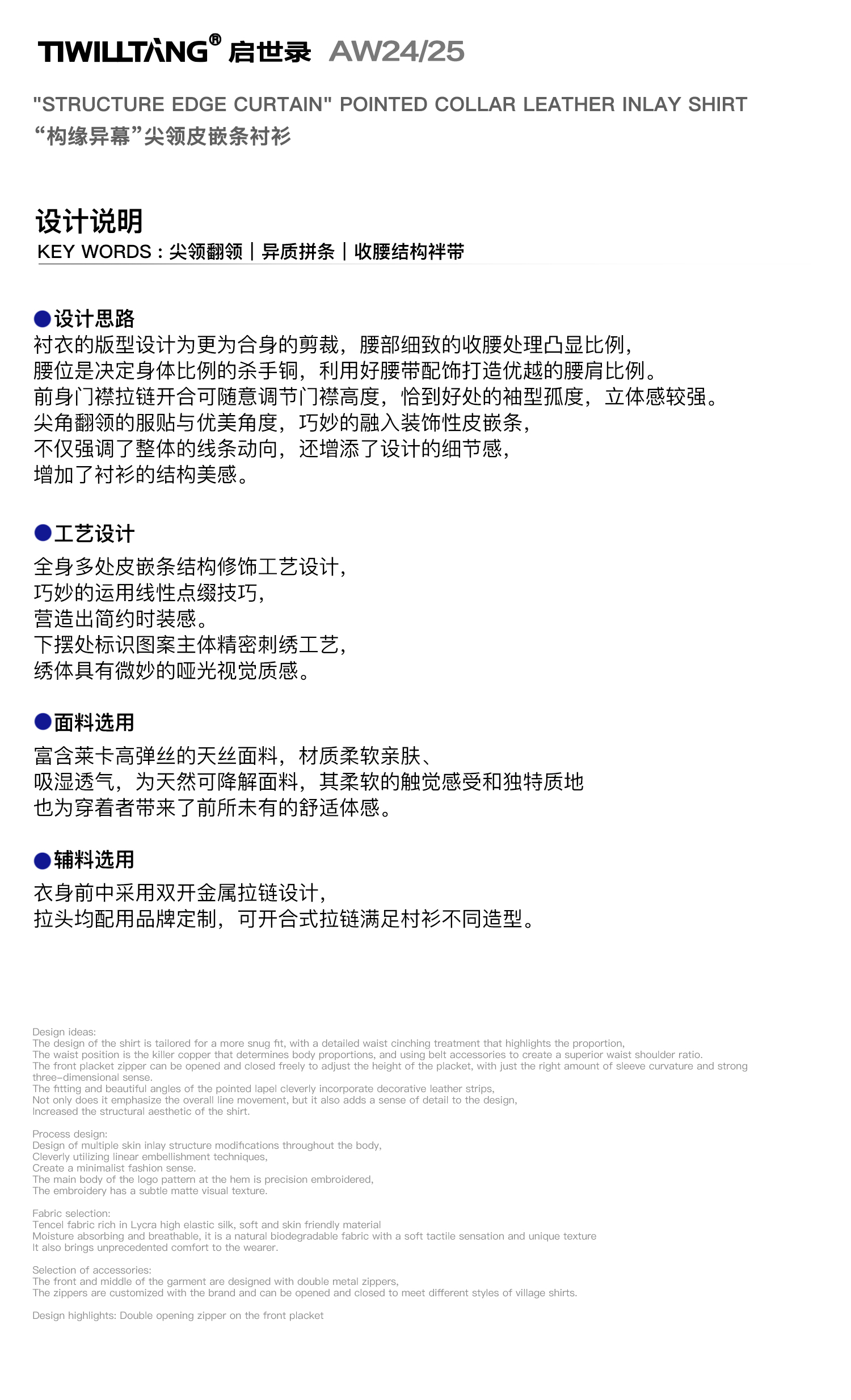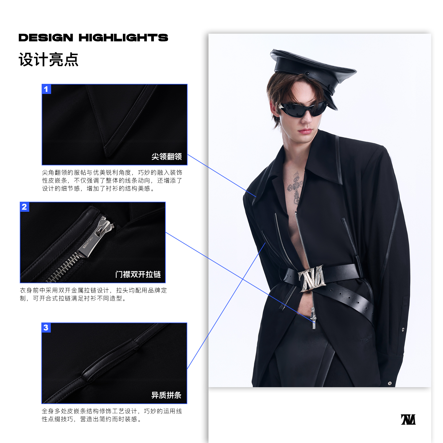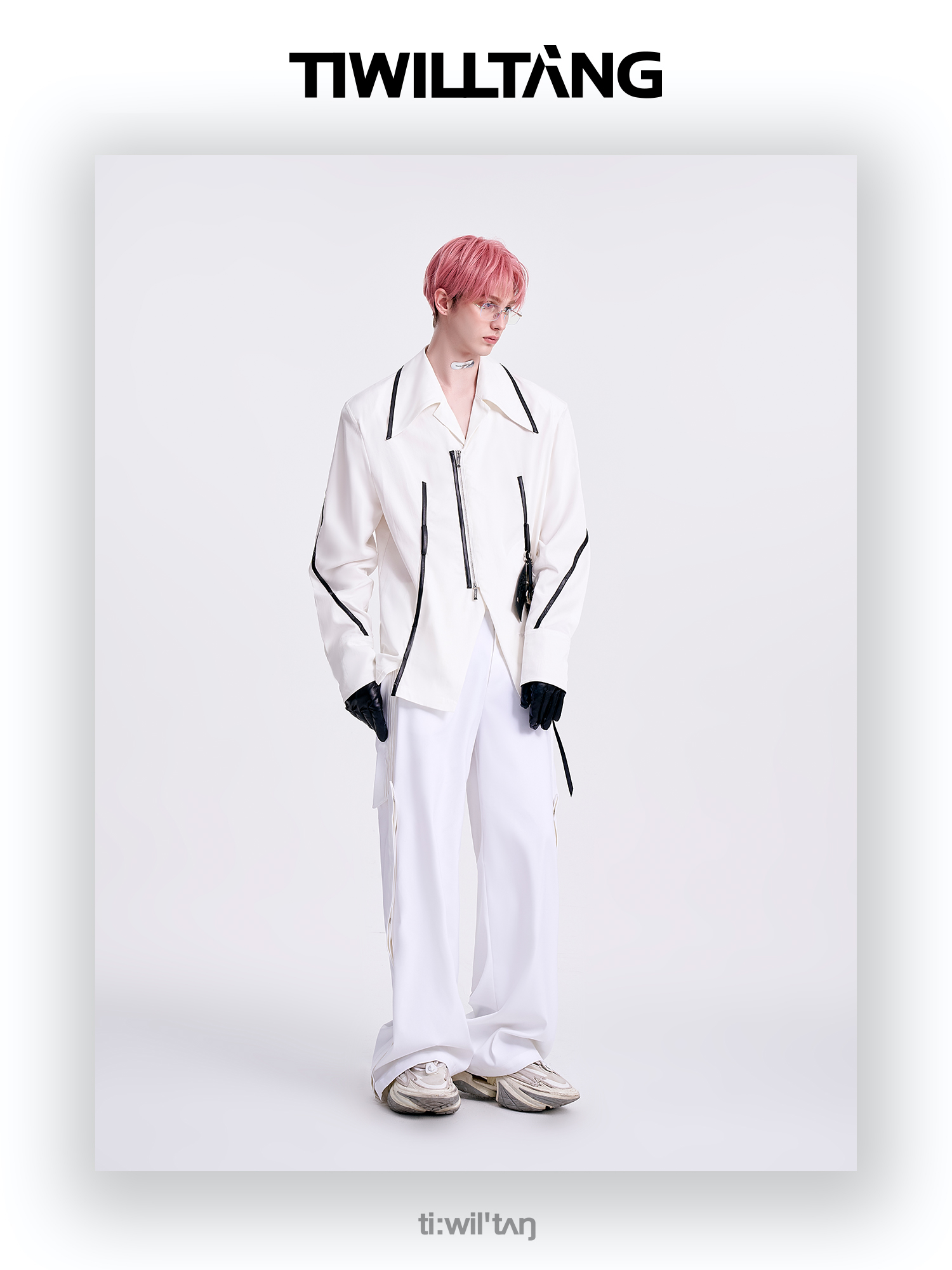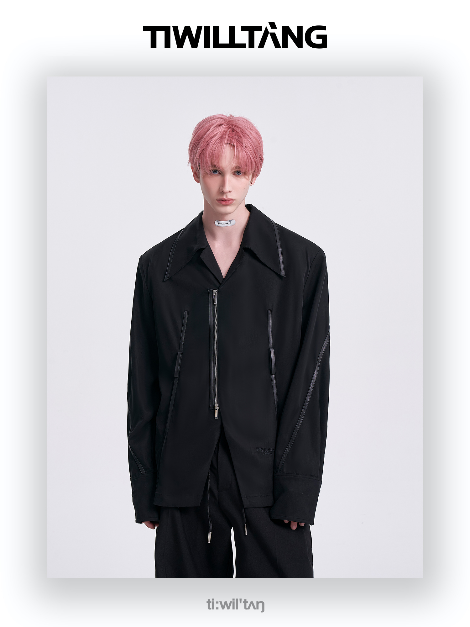启世录TIWILLTANG“构缘异幕”设计感尖领皮嵌条白色衬衫长袖上衣
