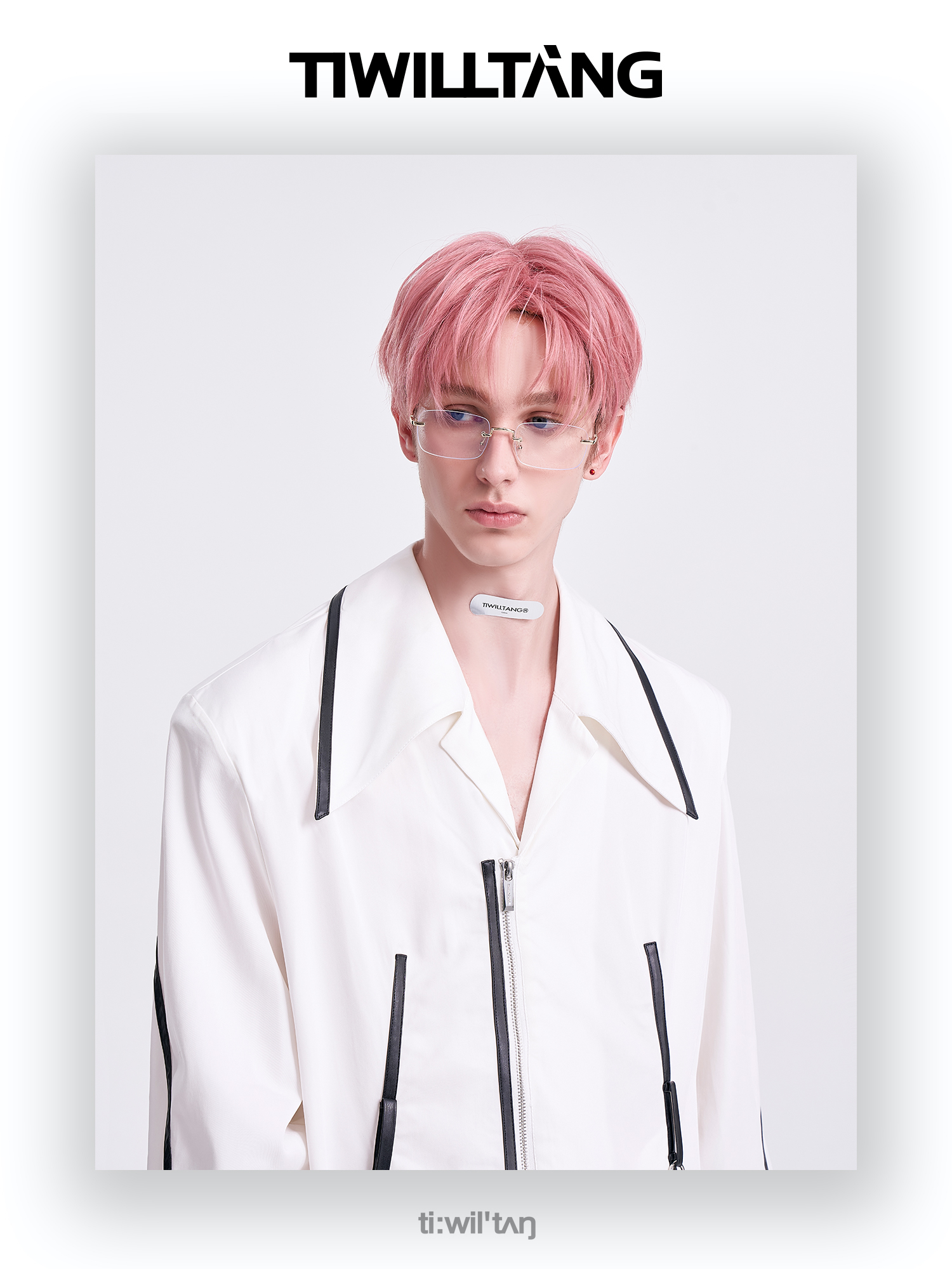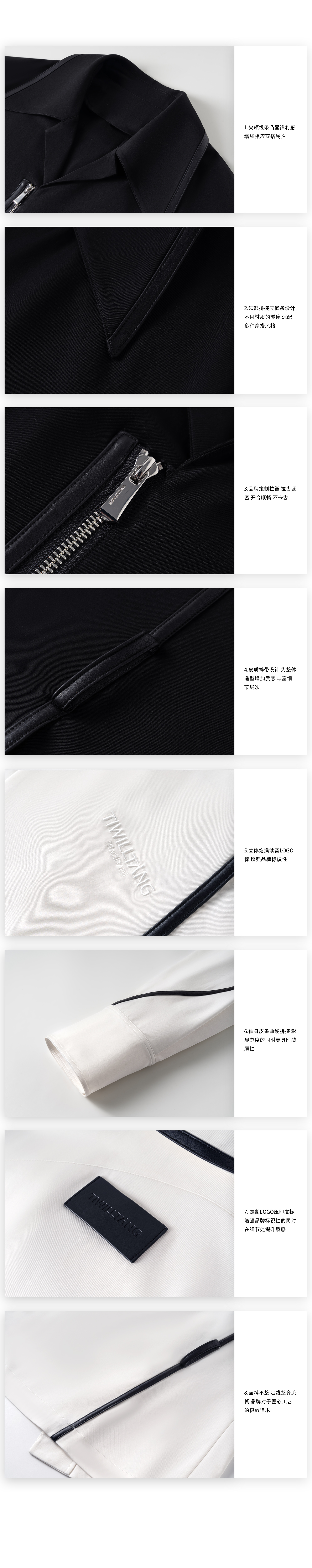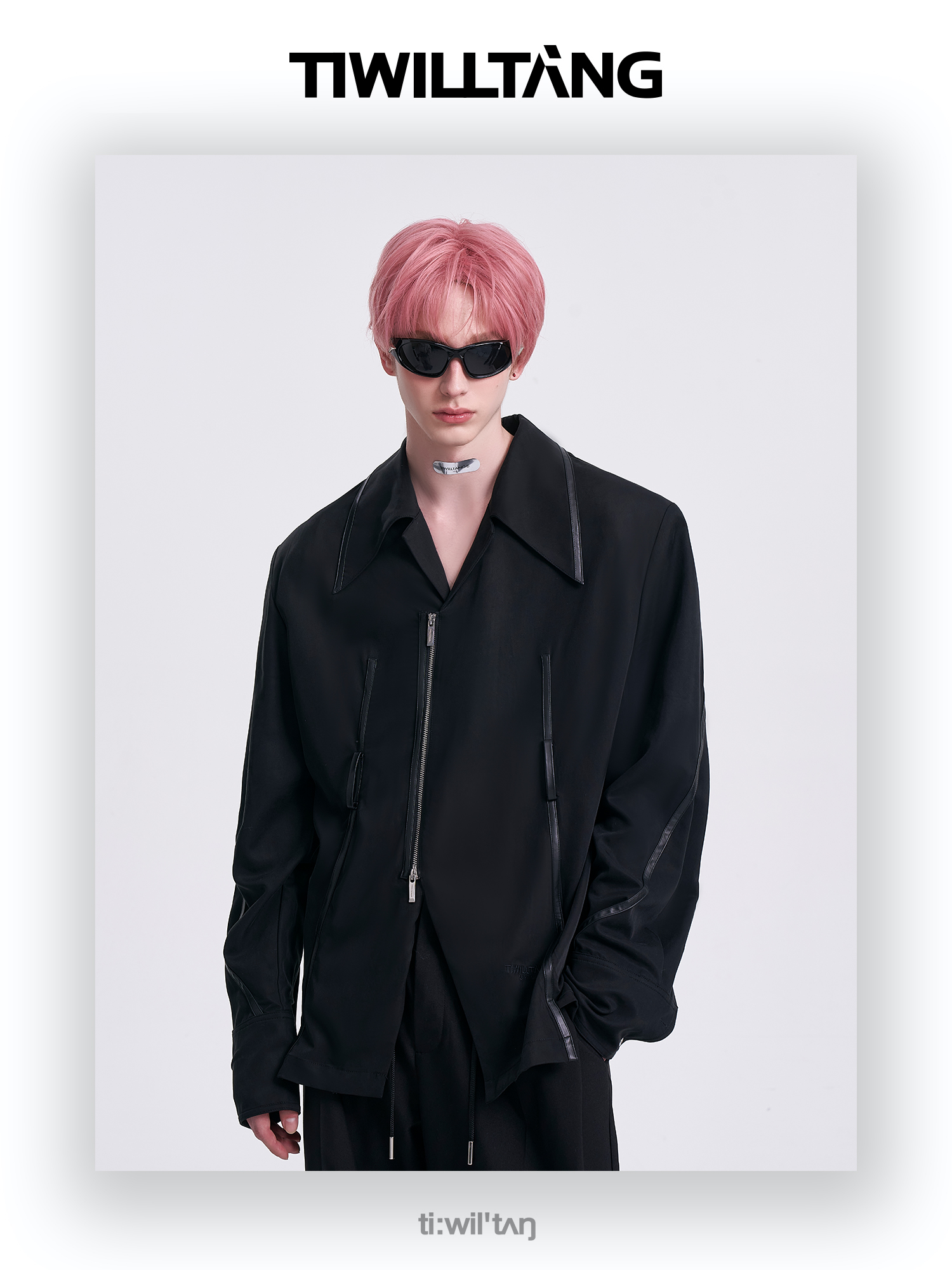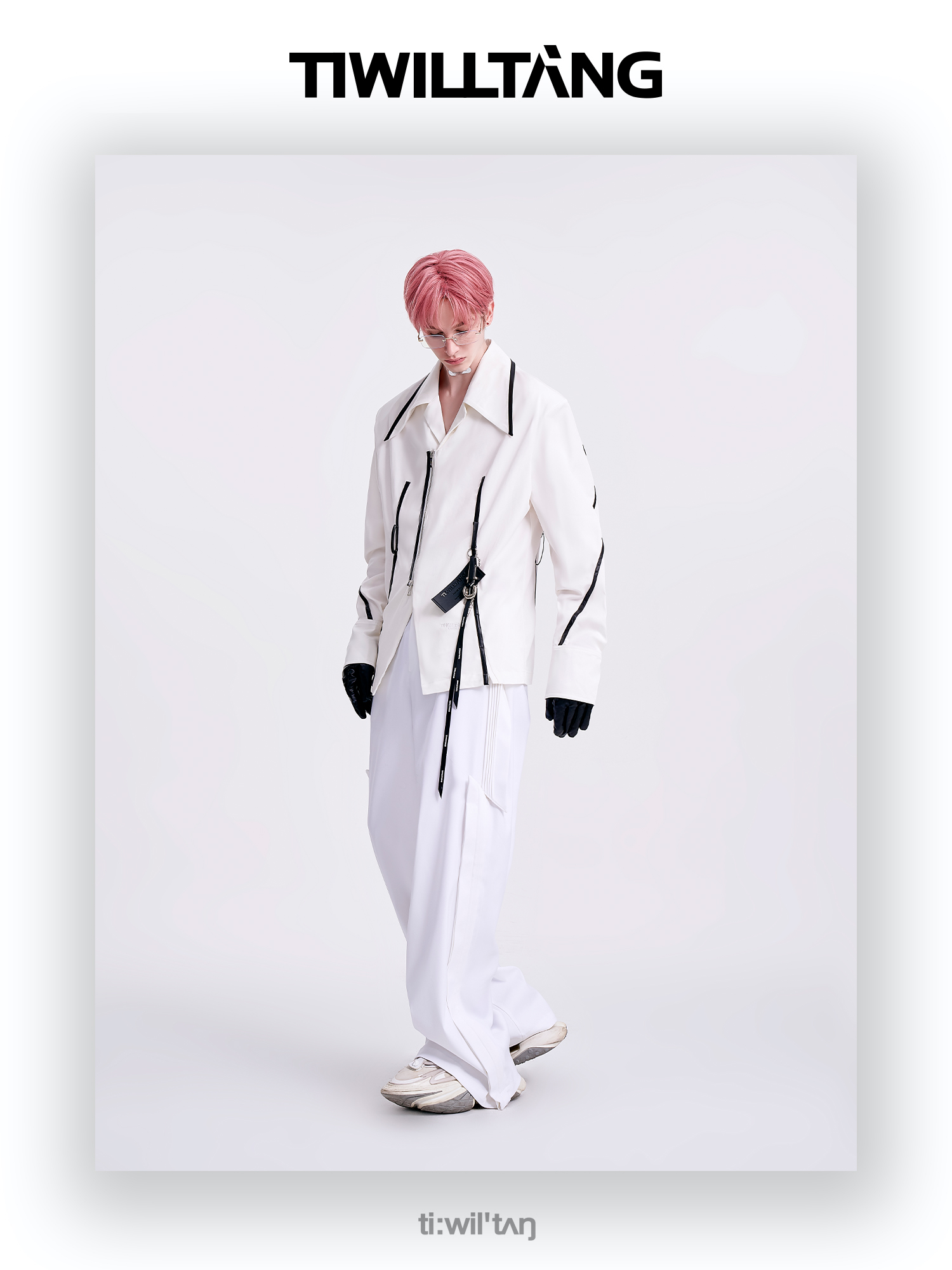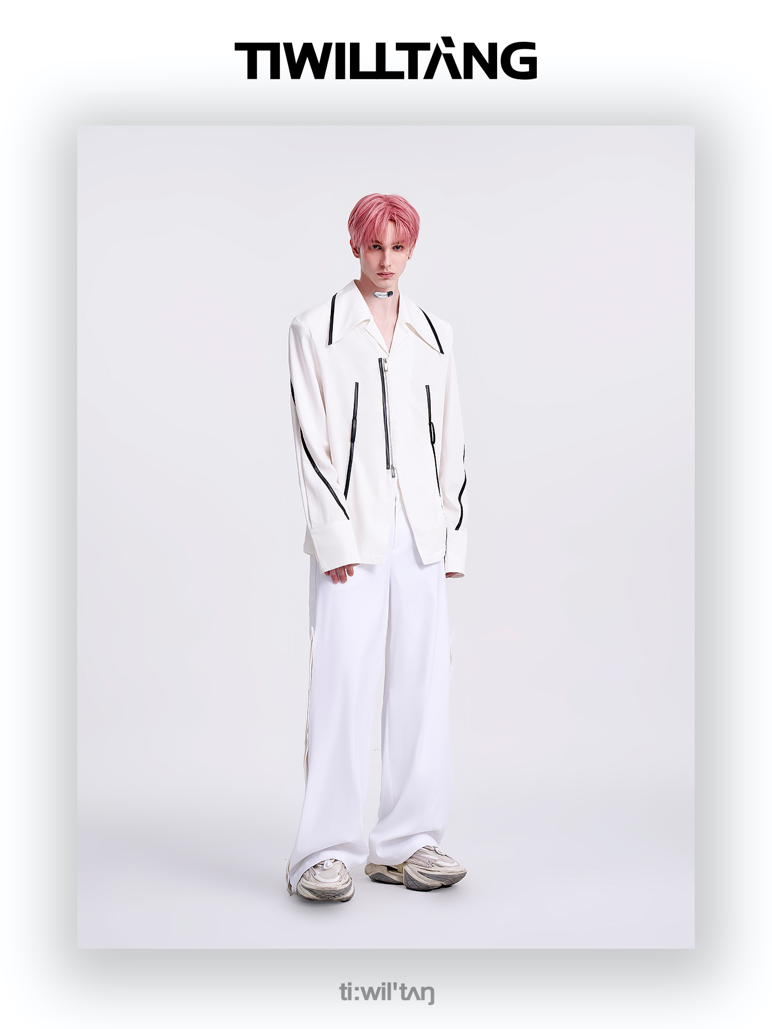 启世录TIWILLTANG“构缘异幕”设计感尖领皮嵌条白色衬衫长袖上衣