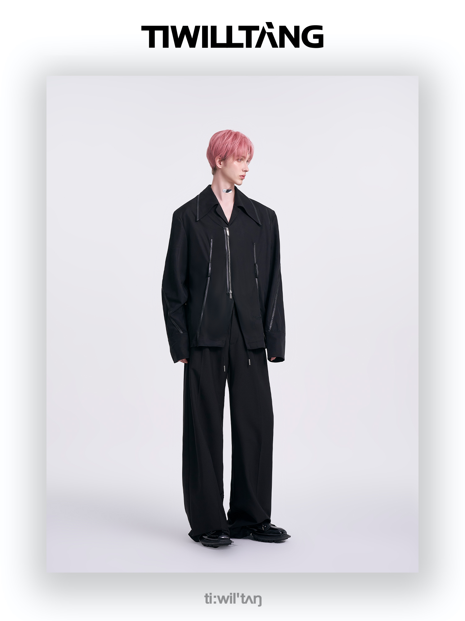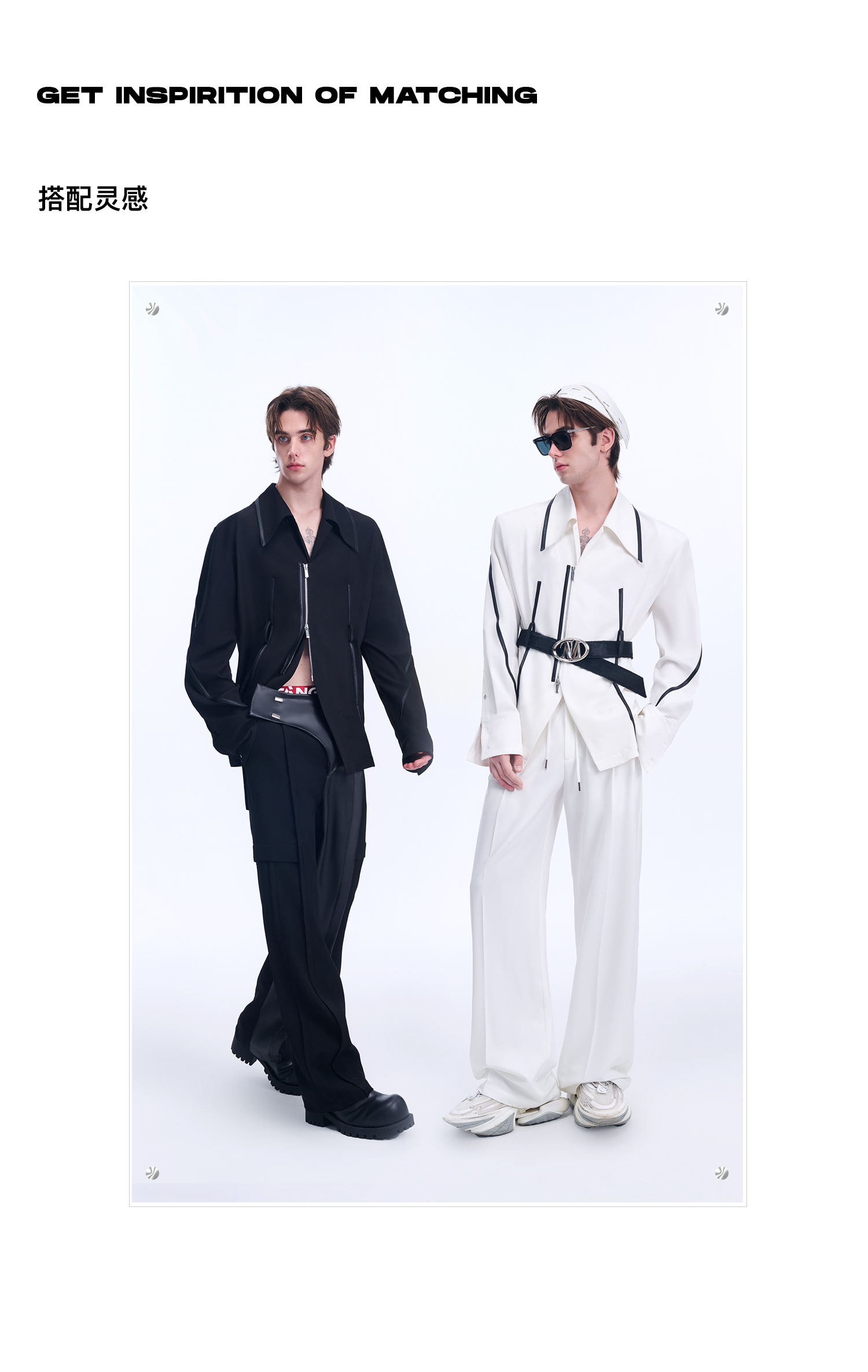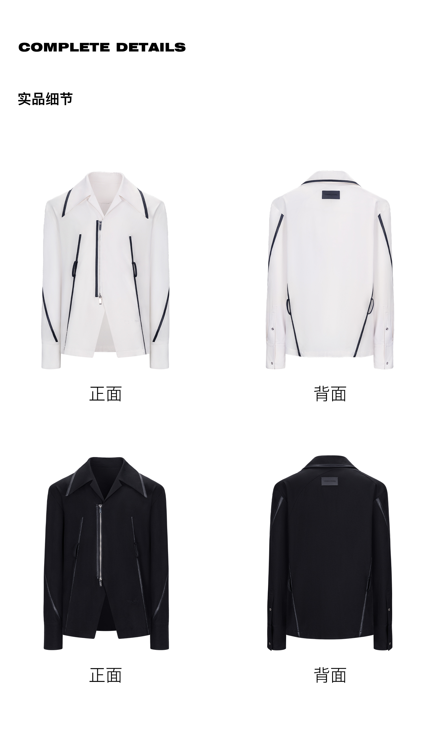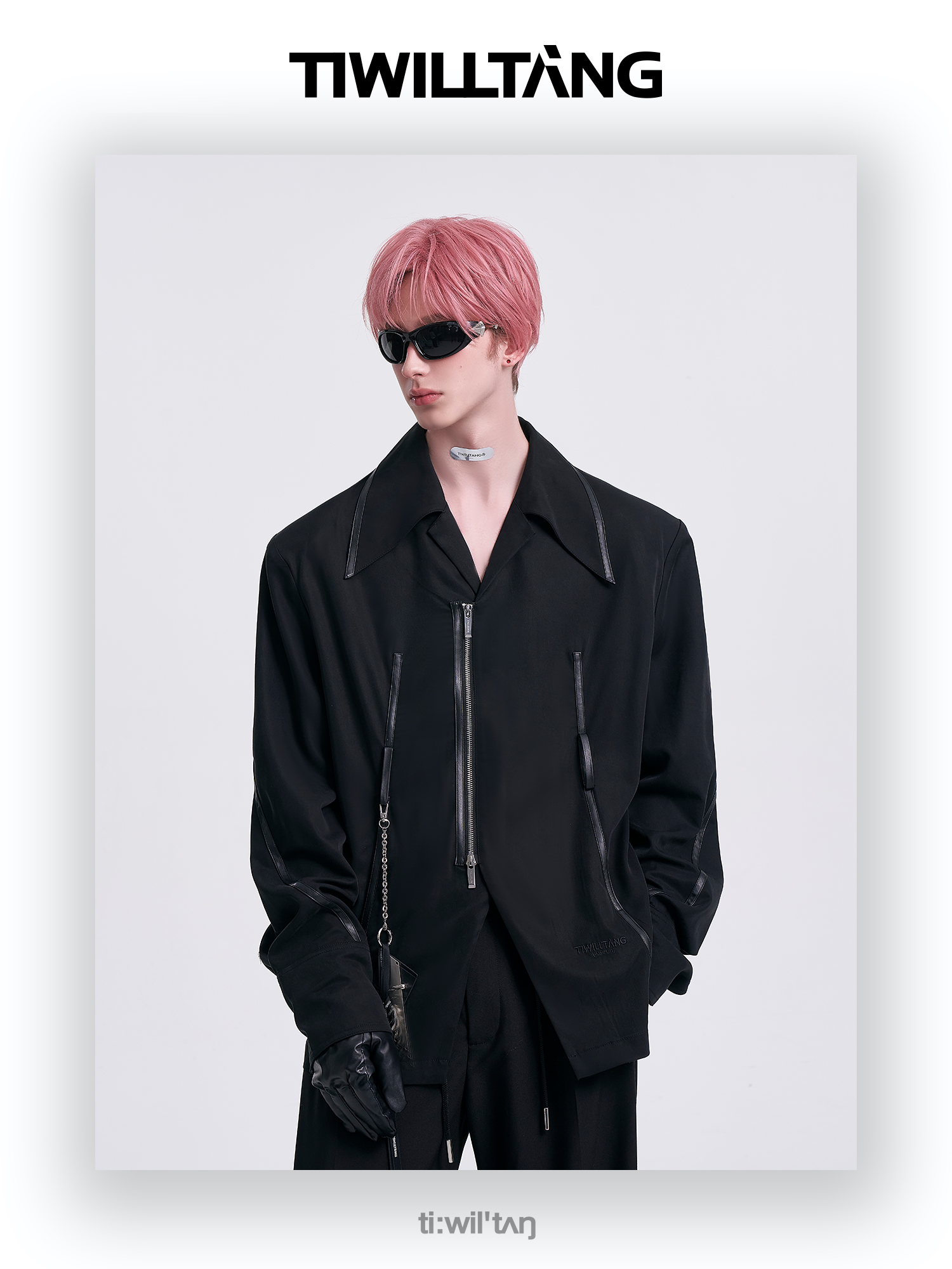 启世录TIWILLTANG“构缘异幕”设计感尖领皮嵌条白色衬衫长袖上衣