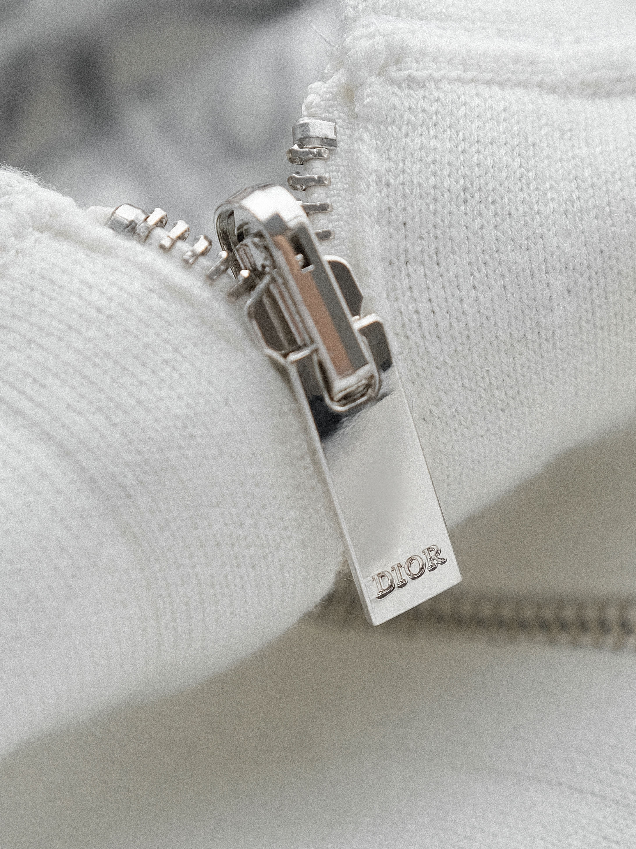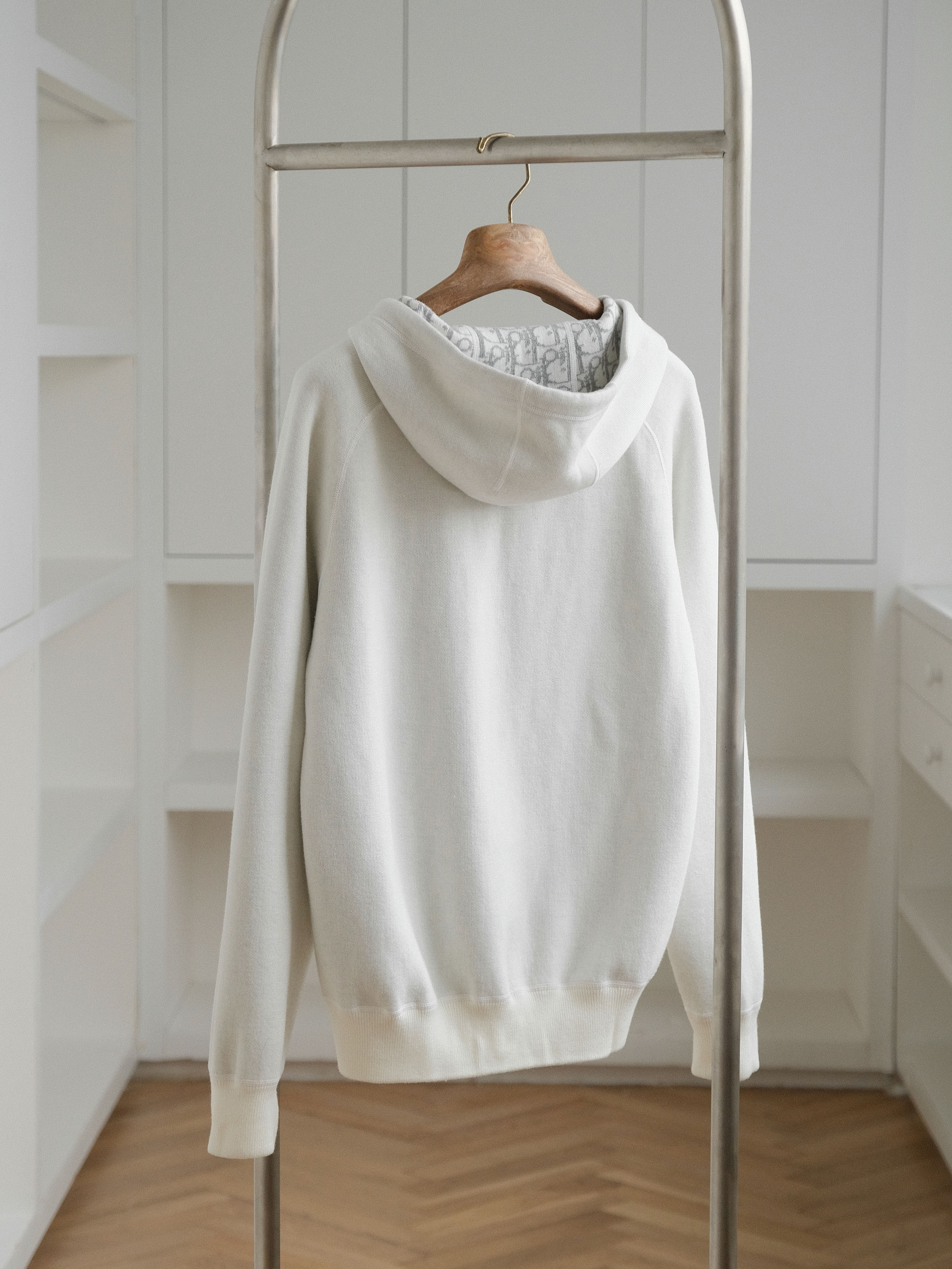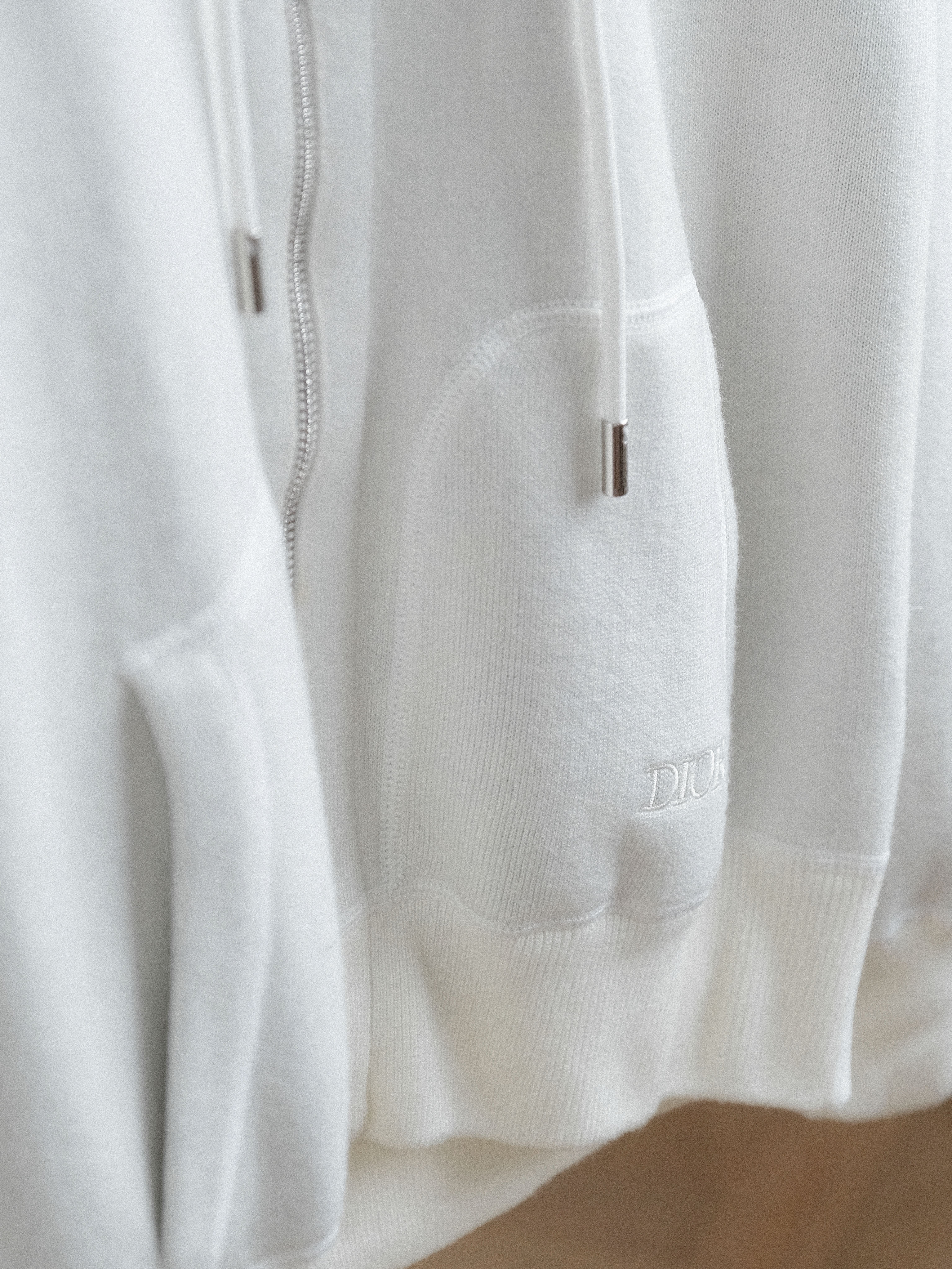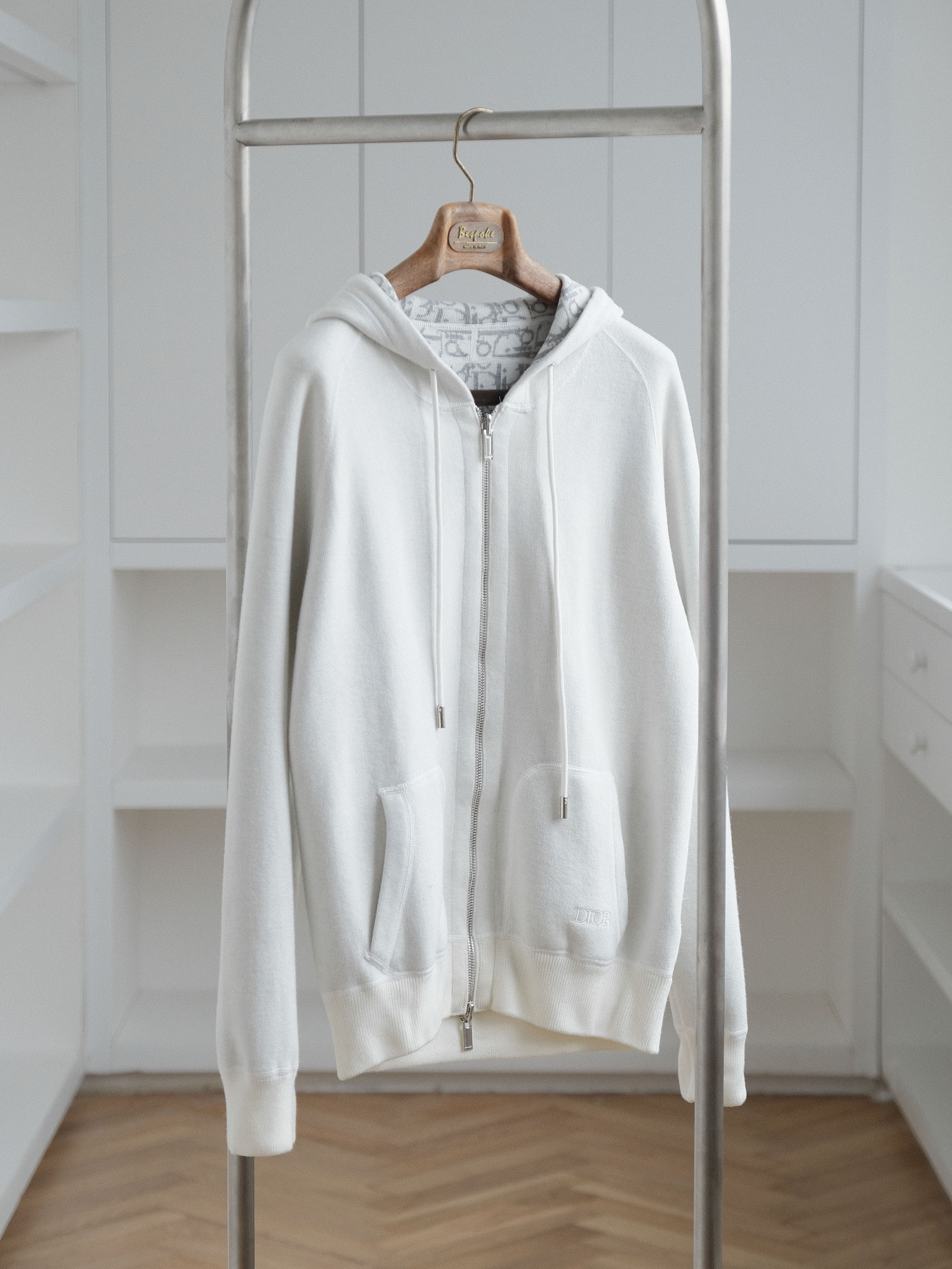原17,500购入,面料采用乳白色棉质和羊绒混纺面料精心制作,成份为91% 棉+9%羊绒,将经典高订韵致融入基本款单品。正面左口袋饰以DR小刺绣,内侧通体饰以Obliqu针织提花。对板定织全棉罗纹,手感厚实且透气。整衣五金辅料全部按照原版开模定做,抽绳风帽搭配刻字金属吊钟,双向拉链紧固件开合,搭配镌刻DR标志的拉链头,采用进口专机锁边明线车缝,男女同款,修身版型。