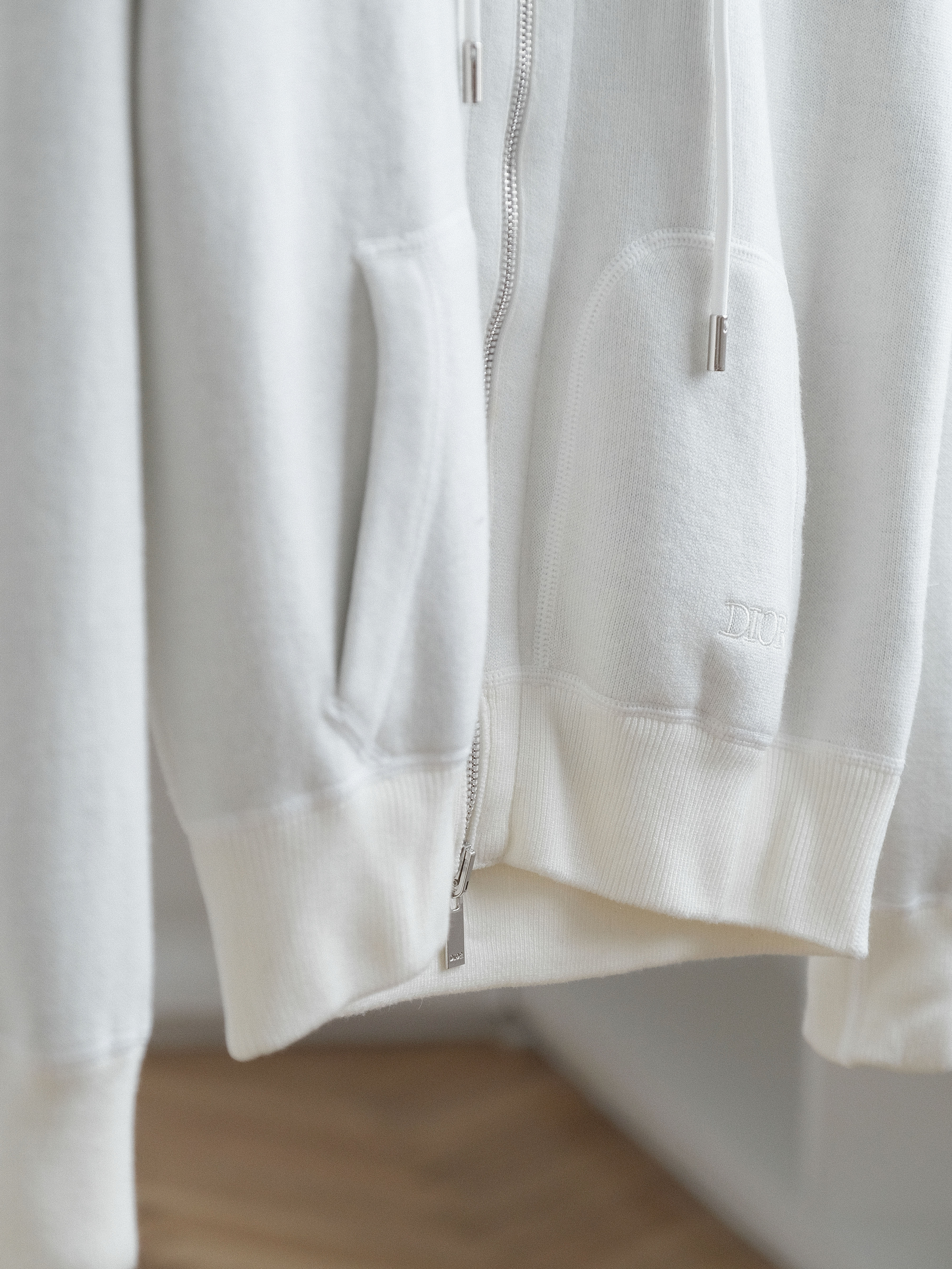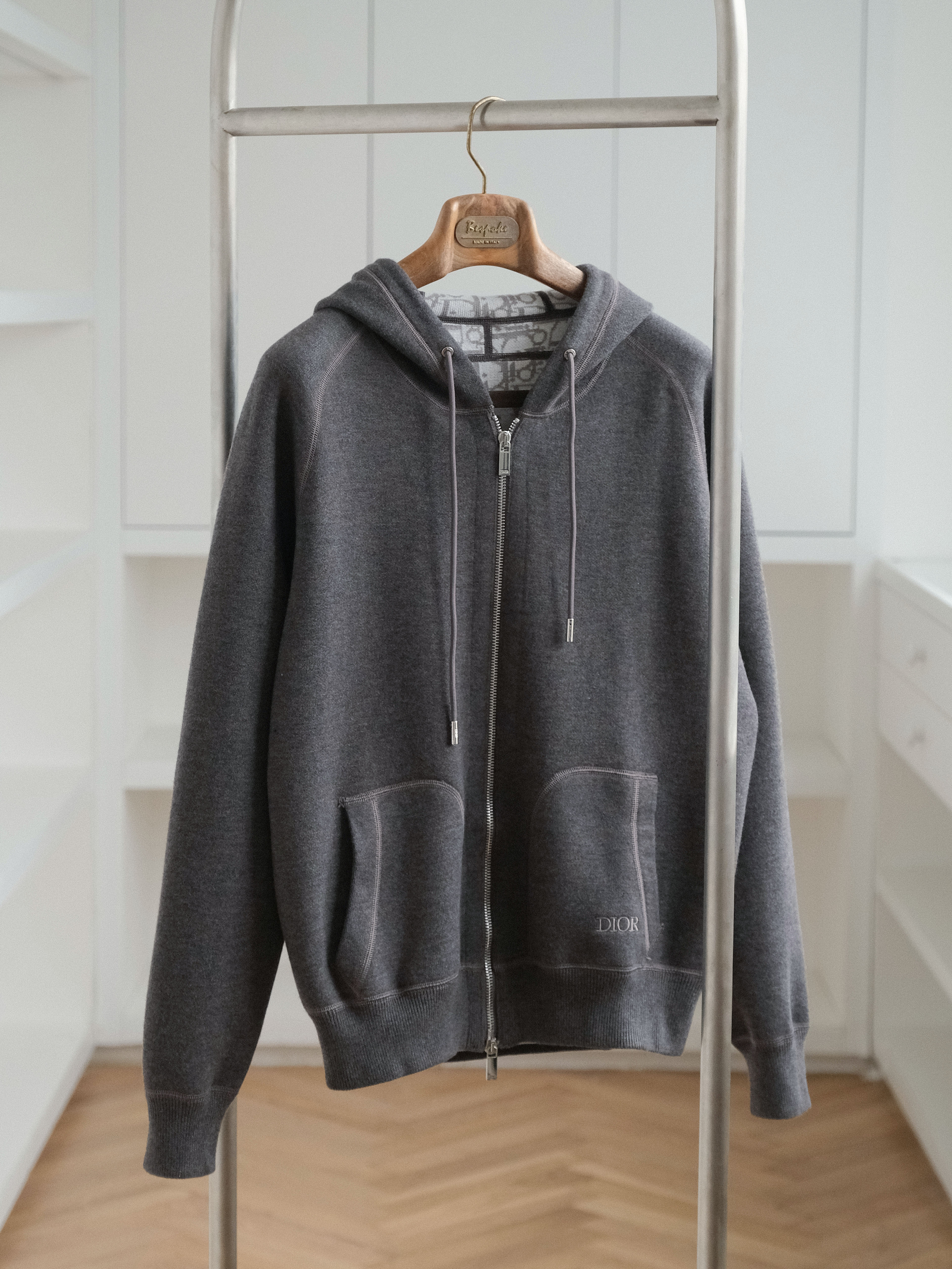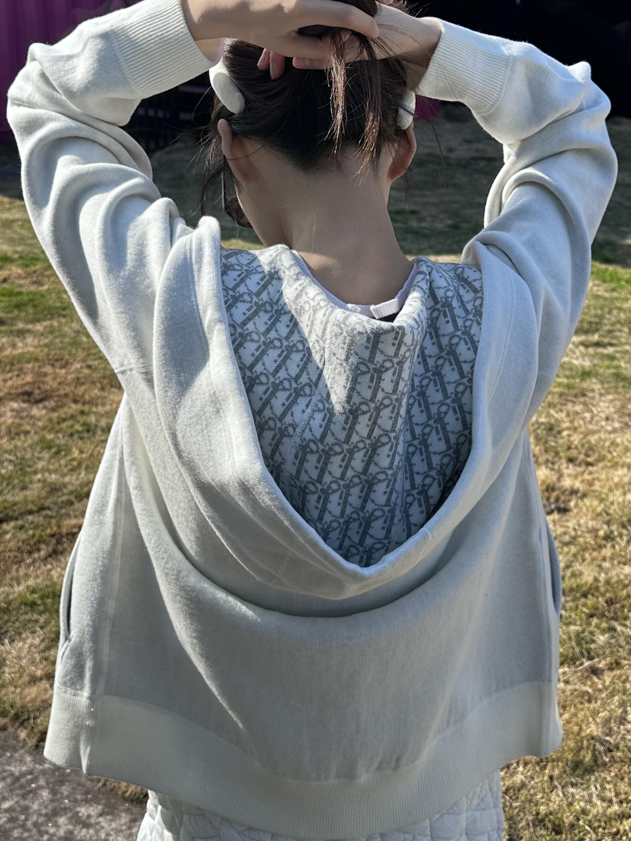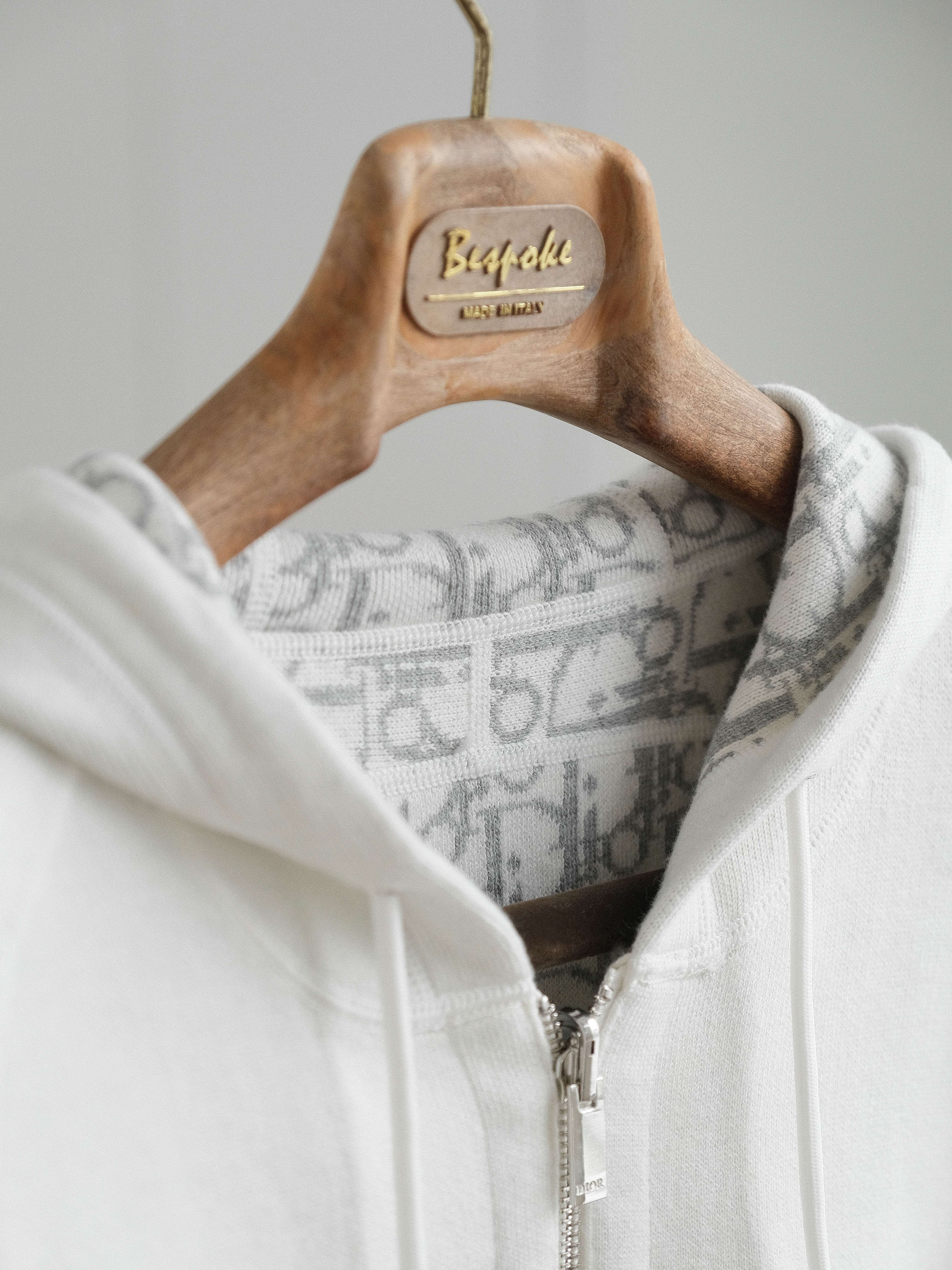 原17,500购入,面料采用乳白色棉质和羊绒混纺面料精心制作,成份为91% 棉+9%羊绒,将经典高订韵致融入基本款单品。正面左口袋饰以DR小刺绣,内侧通体饰以Obliqu针织提花。对板定织全棉罗纹,手感厚实且透气。整衣五金辅料全部按照原版开模定做,抽绳风帽搭配刻字金属吊钟,双向拉链紧固件开合,搭配镌刻DR标志的拉链头,采用进口专机锁边明线车缝,男女同款,修身版型。