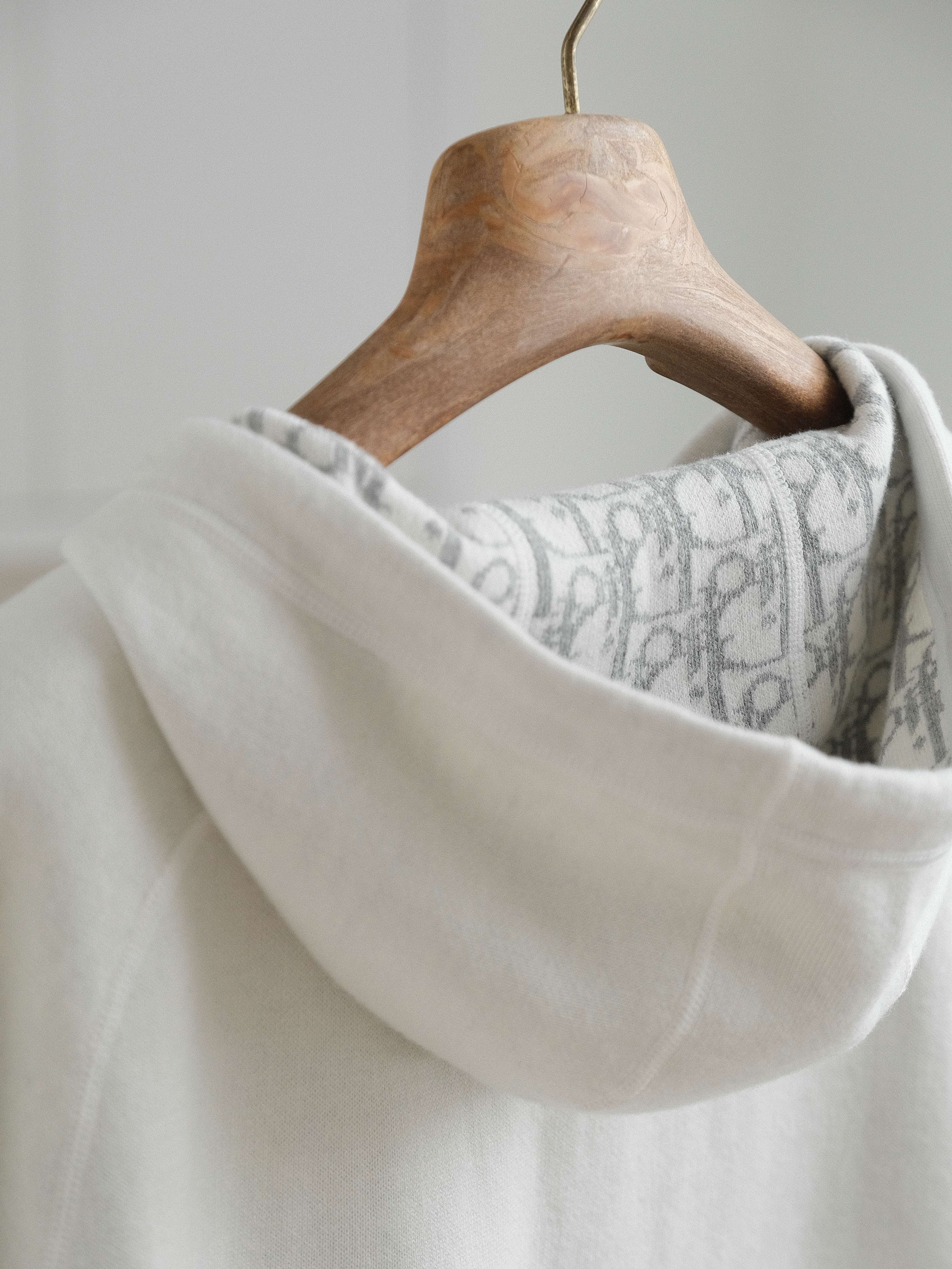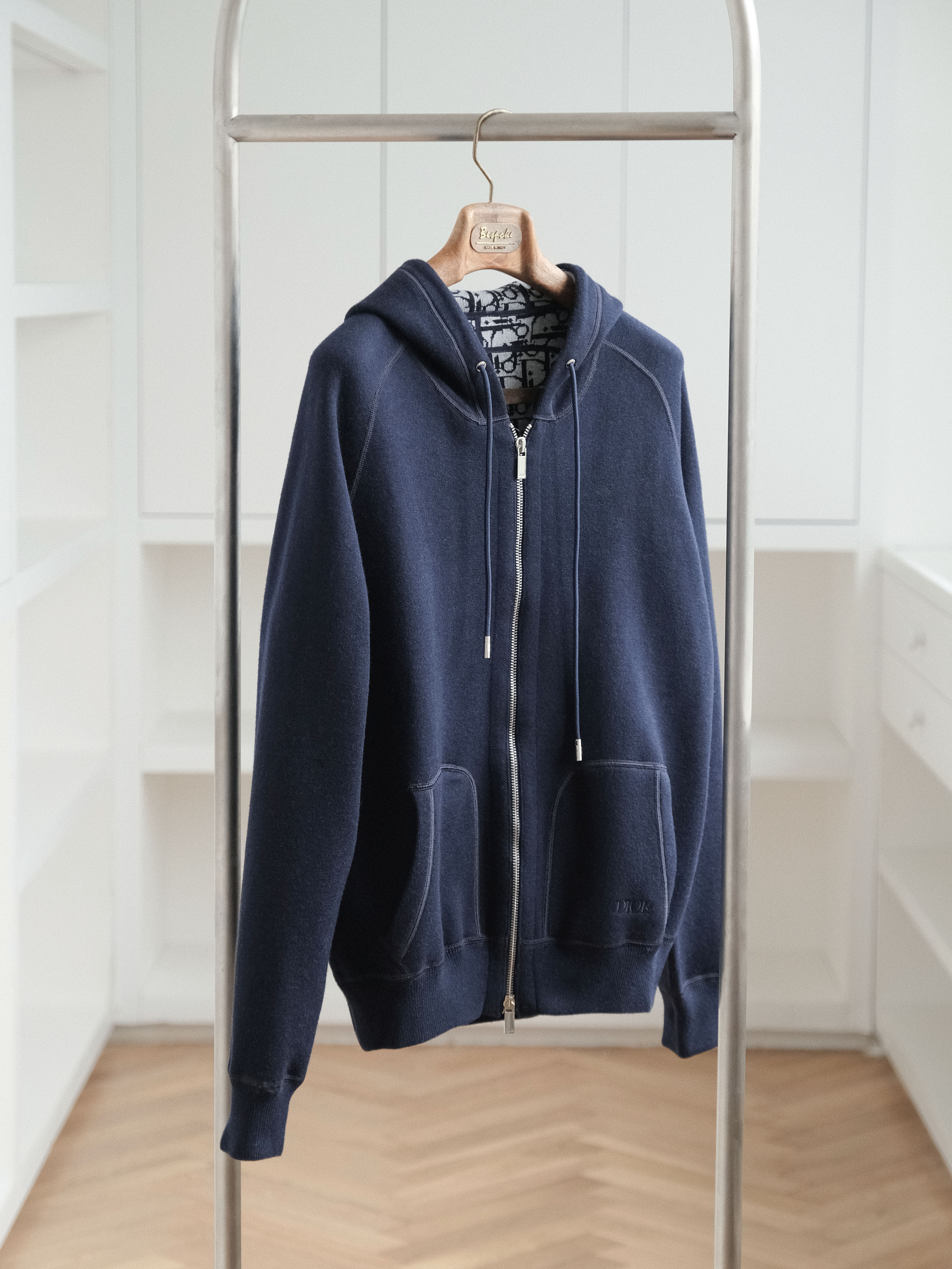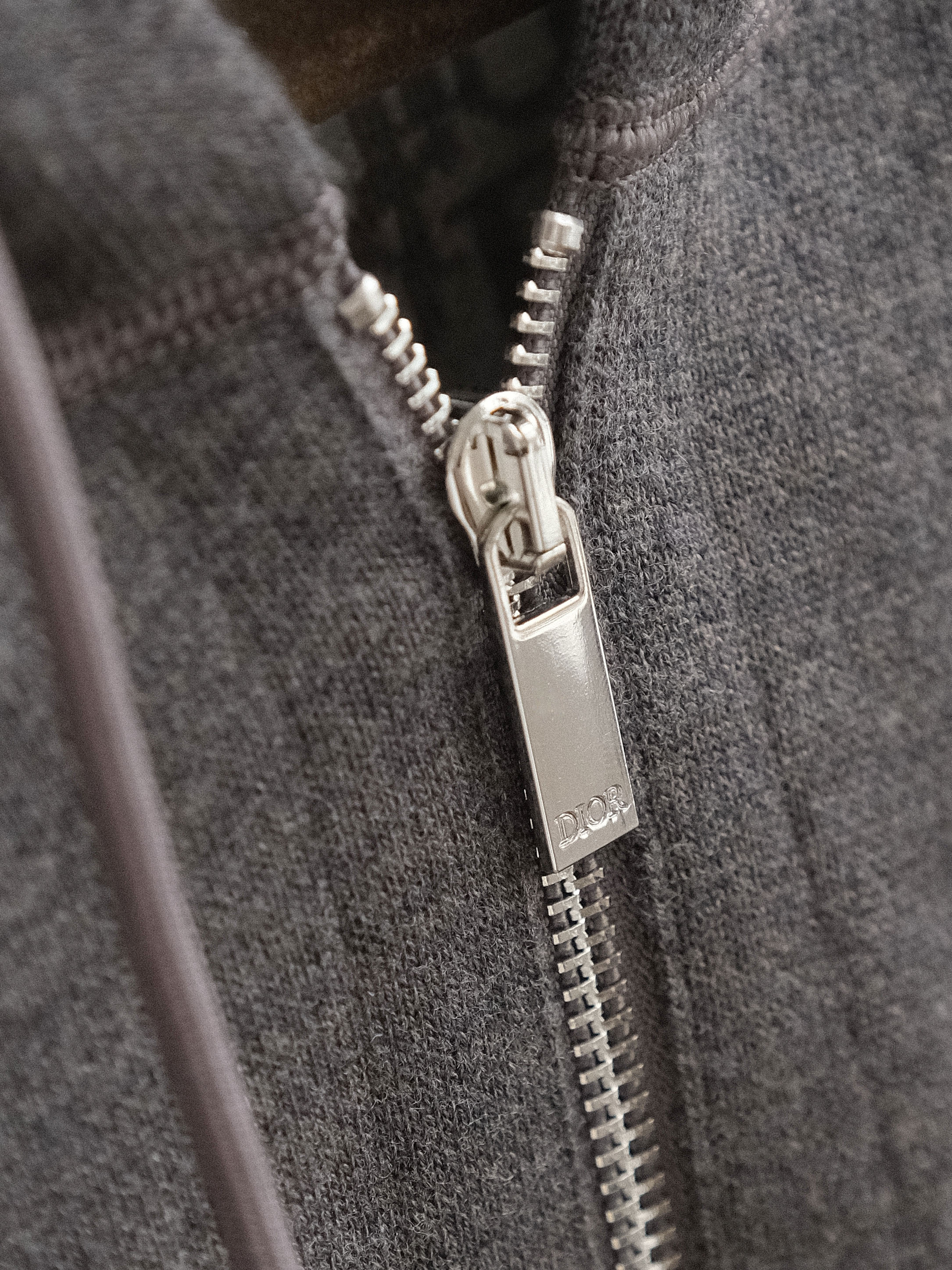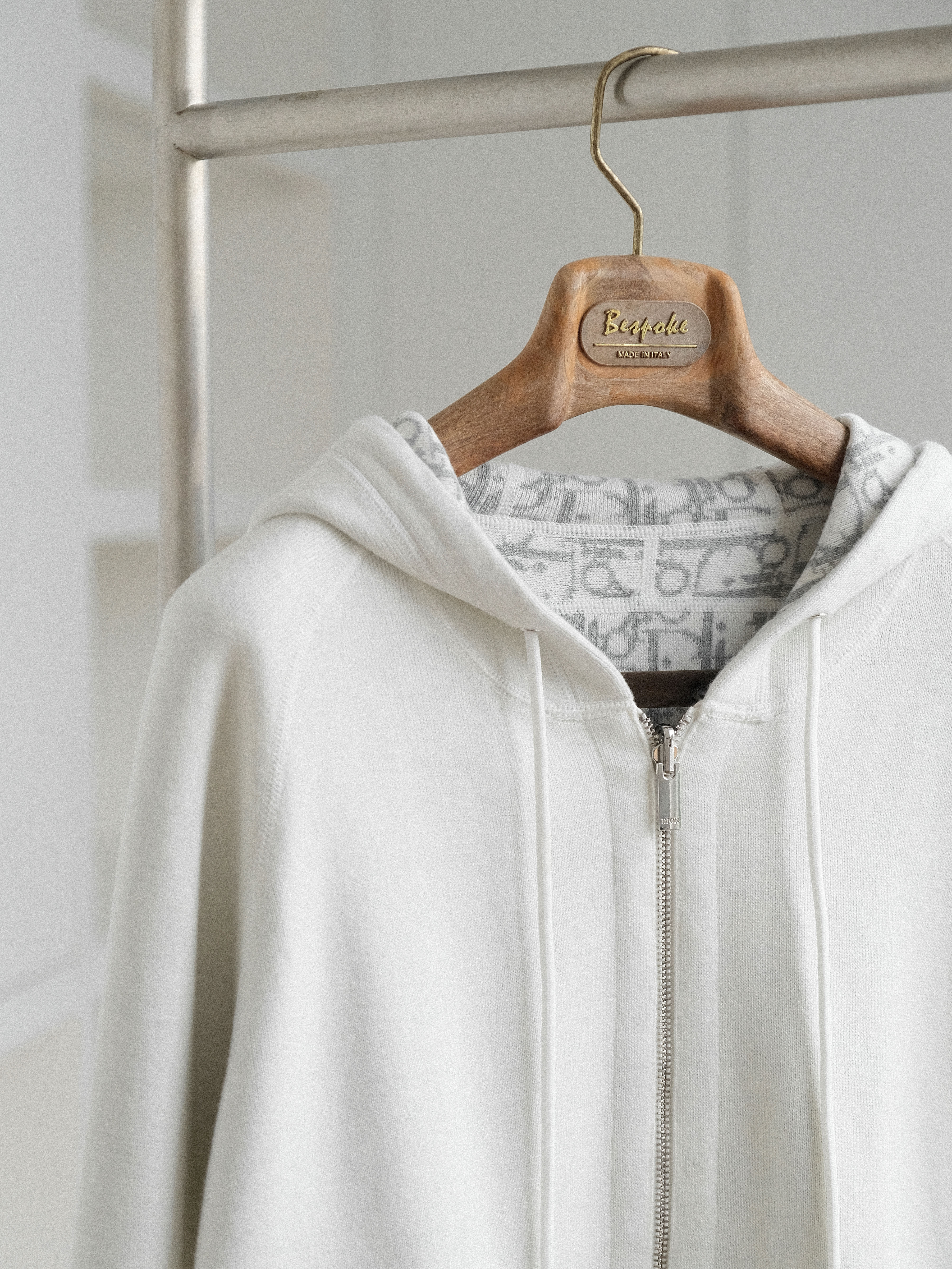 原17,500购入,面料采用乳白色棉质和羊绒混纺面料精心制作,成份为91% 棉+9%羊绒,将经典高订韵致融入基本款单品。正面左口袋饰以DR小刺绣,内侧通体饰以Obliqu针织提花。对板定织全棉罗纹,手感厚实且透气。整衣五金辅料全部按照原版开模定做,抽绳风帽搭配刻字金属吊钟,双向拉链紧固件开合,搭配镌刻DR标志的拉链头,采用进口专机锁边明线车缝,男女同款,修身版型。