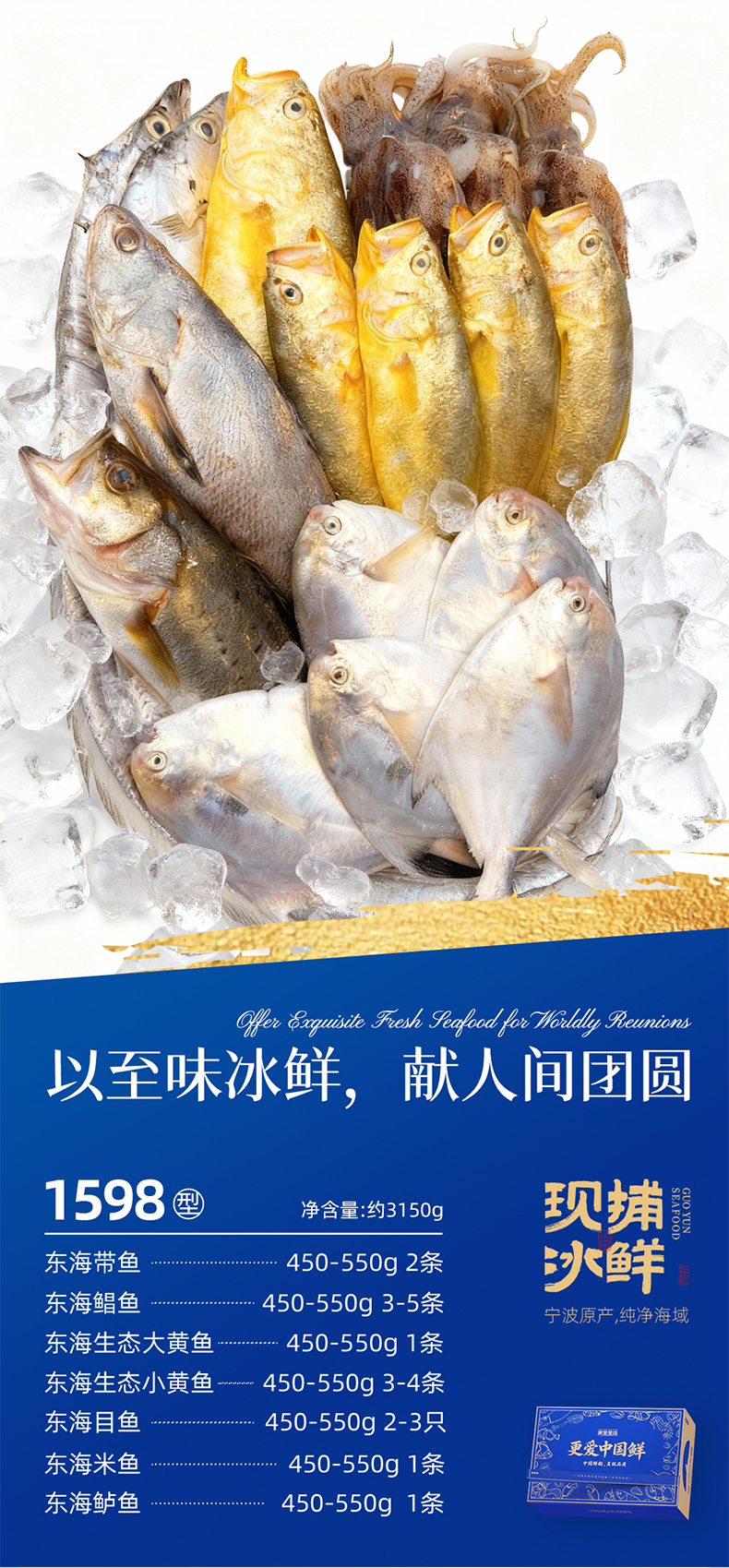 | 龙凤呈祥1598型 | 东海带鱼 450-550g 2条 东海鲳鱼 450-550g 3-5条 东海生态大黄鱼 450-550g 1条 东海生态小黄鱼 450-550g 3-4条 东海目鱼 450-550g 2-3只 东海米鱼 450-550g 1条 东海鲈鱼 450-550g 1条 |