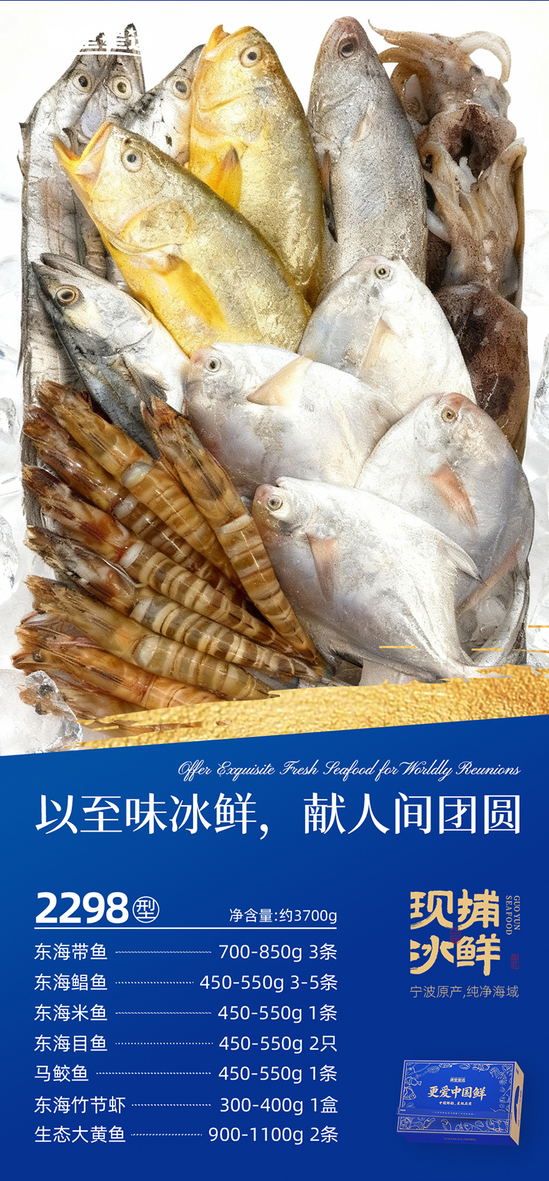 | 鹏程万里2298型 | 东海带鱼 700-850g 3条 东海鲳鱼 450-550g 3-4条 东海米鱼 450-550g 1条 东海目鱼 450-550g 2只 马鲛鱼 450-550g 1条 东海竹节虾 300-400g 1盒 生态大黄鱼 900-1100g2条 |