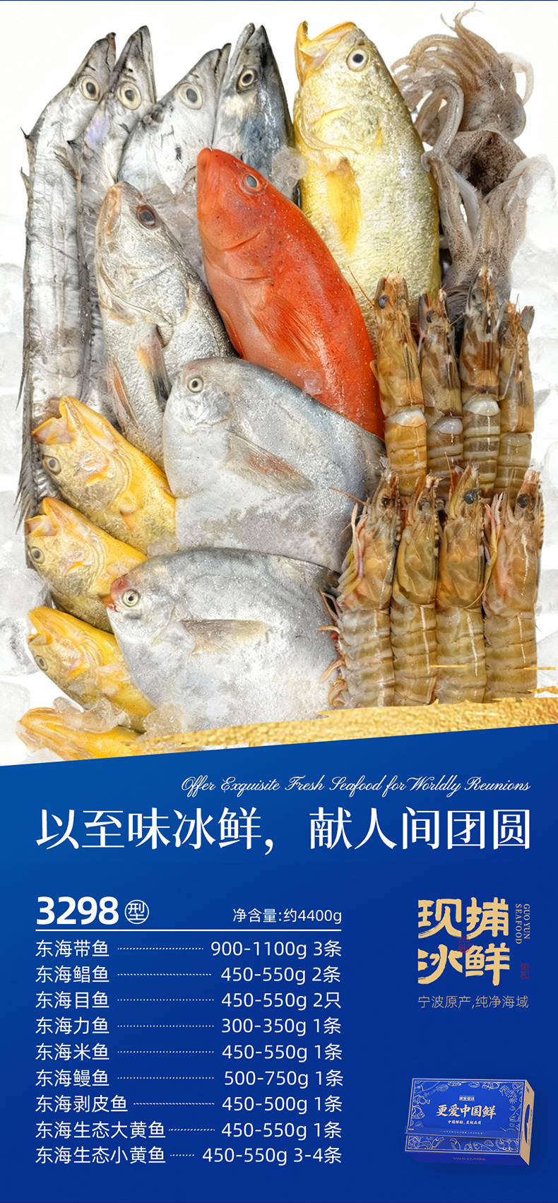 | 三羊开泰4698型 | 东海带鱼 900-1100g 3条 东海鲳鱼 450-550g 2条 东海目鱼 500-600g 2只 东海米鱼 450-550g 1条 东海竹节虾 300-400g 8-10只 东海东星斑 400-600g 1条 东海马鲛鱼 500-600g 1条 东海生态小黄鱼 450-550g 3-4条 东海生态大黄鱼 450-550g 1条 |