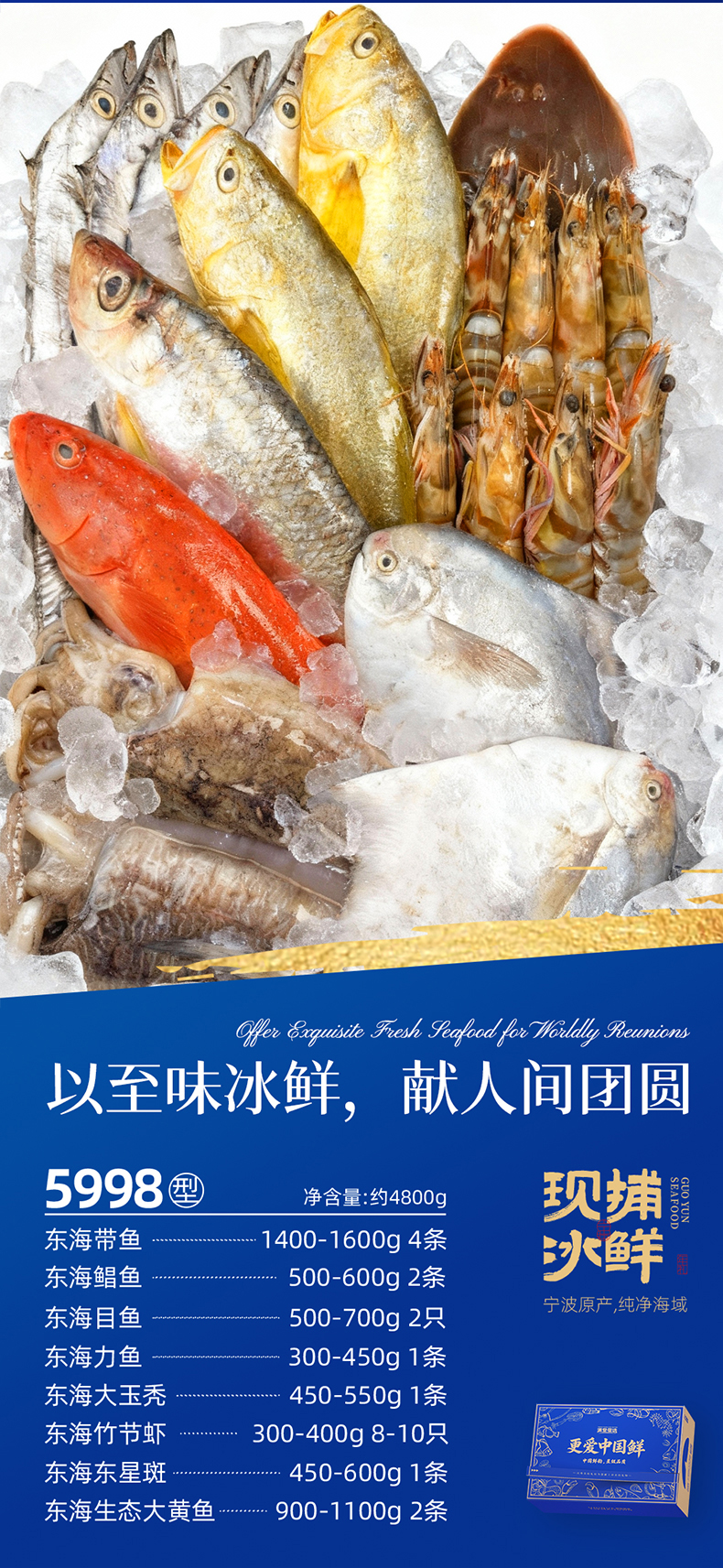 | 盛世祥和5998型 | 东海带鱼 1400-1600g 4条 东海鲳鱼 500-600g 2条 东海目鱼 500-700g 2只 东海力鱼 300-450g 1条 东海大玉秃 450-550g 1条 东海竹节虾 300-400g 8-10只 东海东星斑 450-600g 1条 东海生态大黄鱼 900-1100g 2条 |