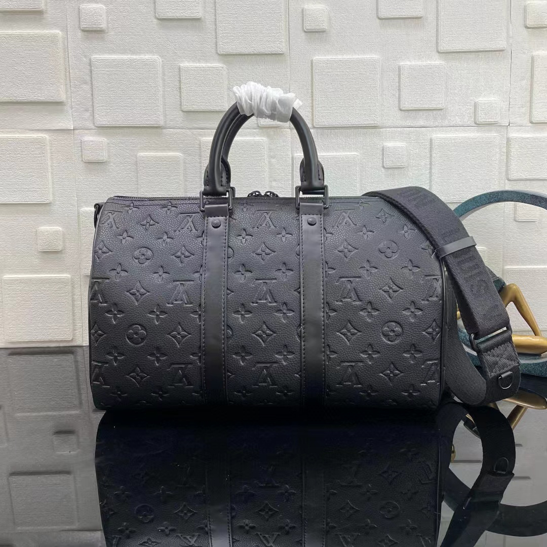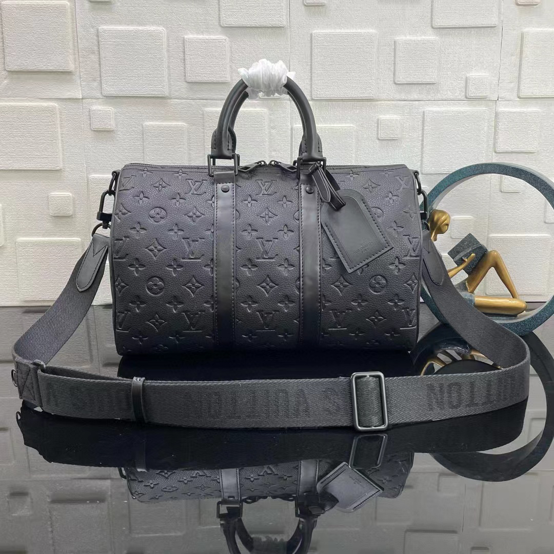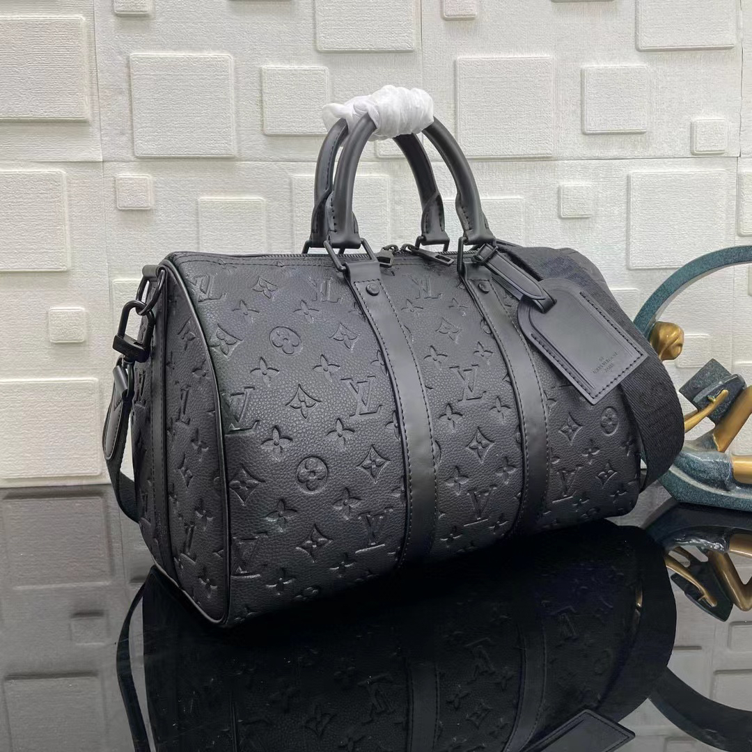 eepall Bandoulière 35 手袋是路易威登经典 Keepall 假日旅行袋的缩微版本 全粒面 Taurillon 皮革压印 Monogram 图案 皮革侧带和顶部皮革手柄延续 Keepall 系列的标志性元素 肩带可拆卸并调节 size:34x21x16cm