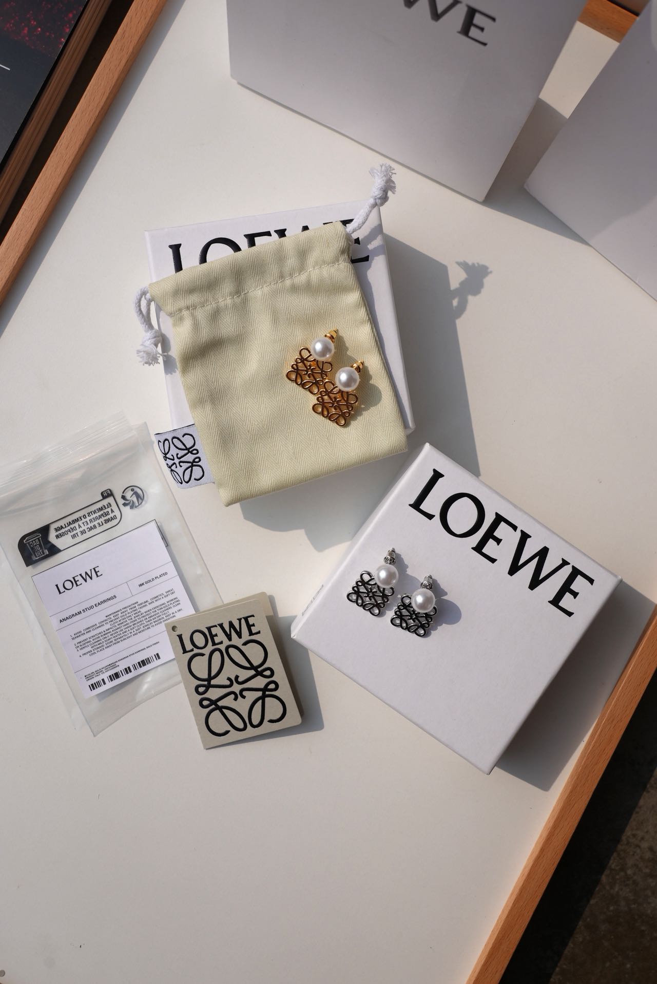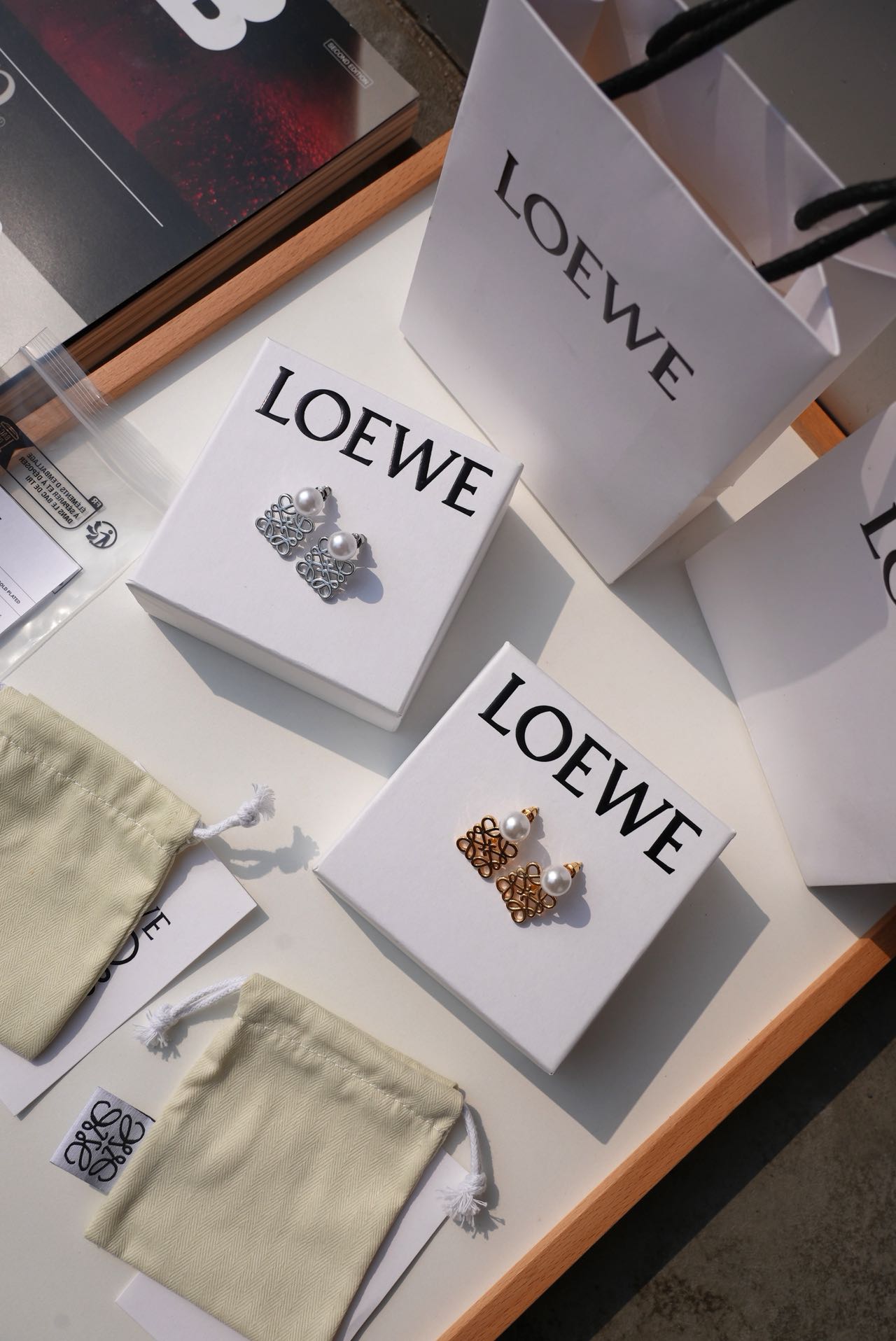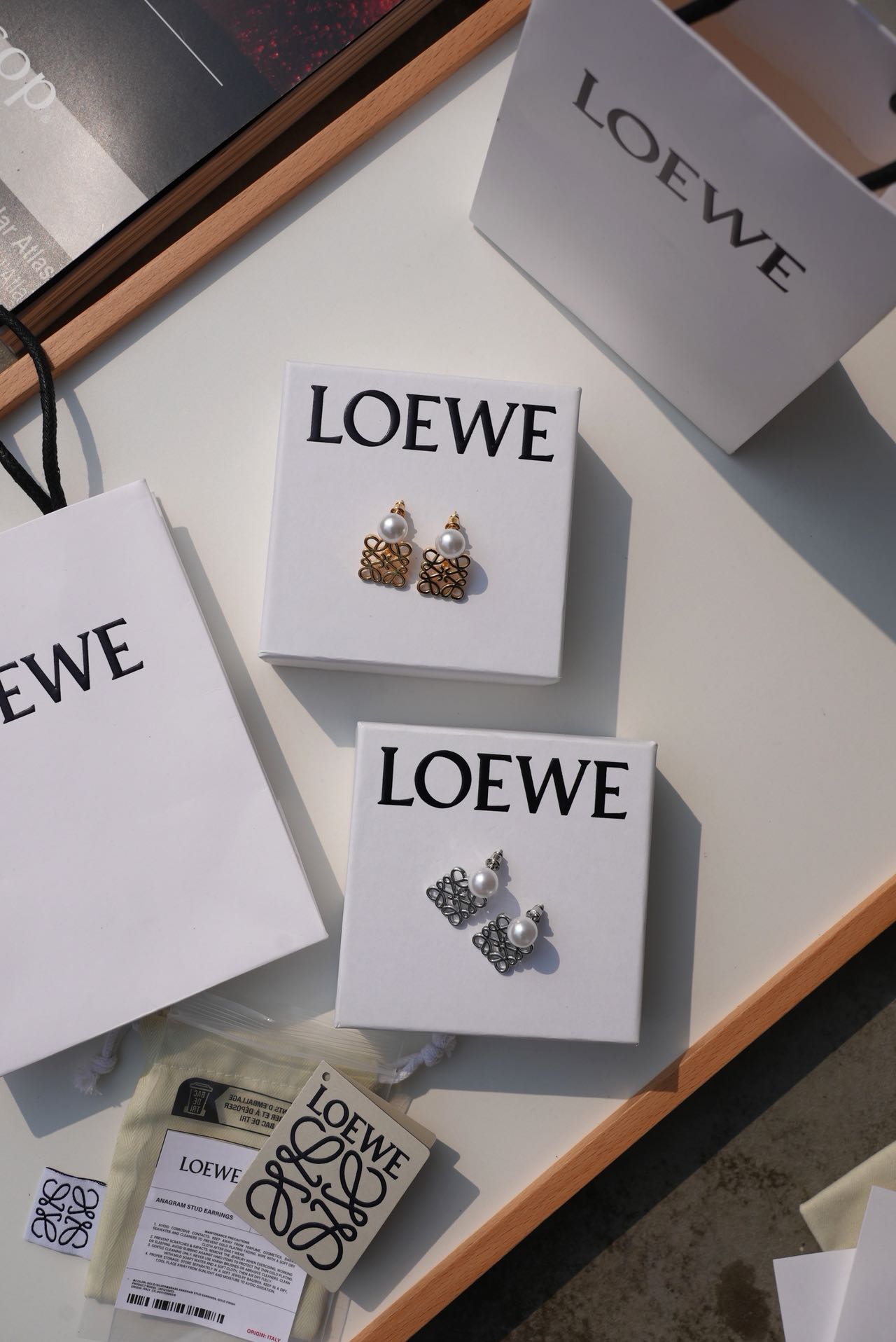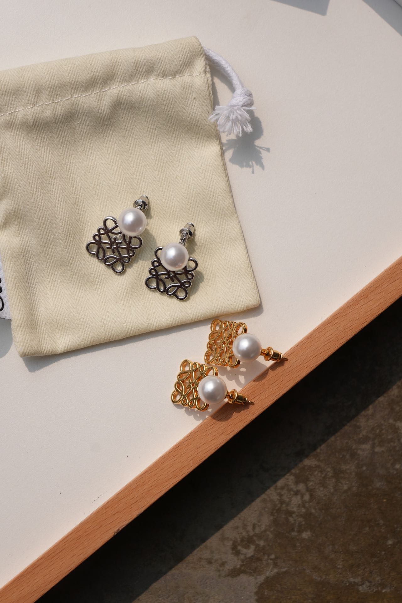 • Loewe标志性符号与珍珠的碰撞:经典的Anagram缠绕纹样以黄铜为底,在光线下流转细腻光泽,上方缀一颗圆润珍珠,刚柔并济,把品牌DNA与温柔质感完美融合。