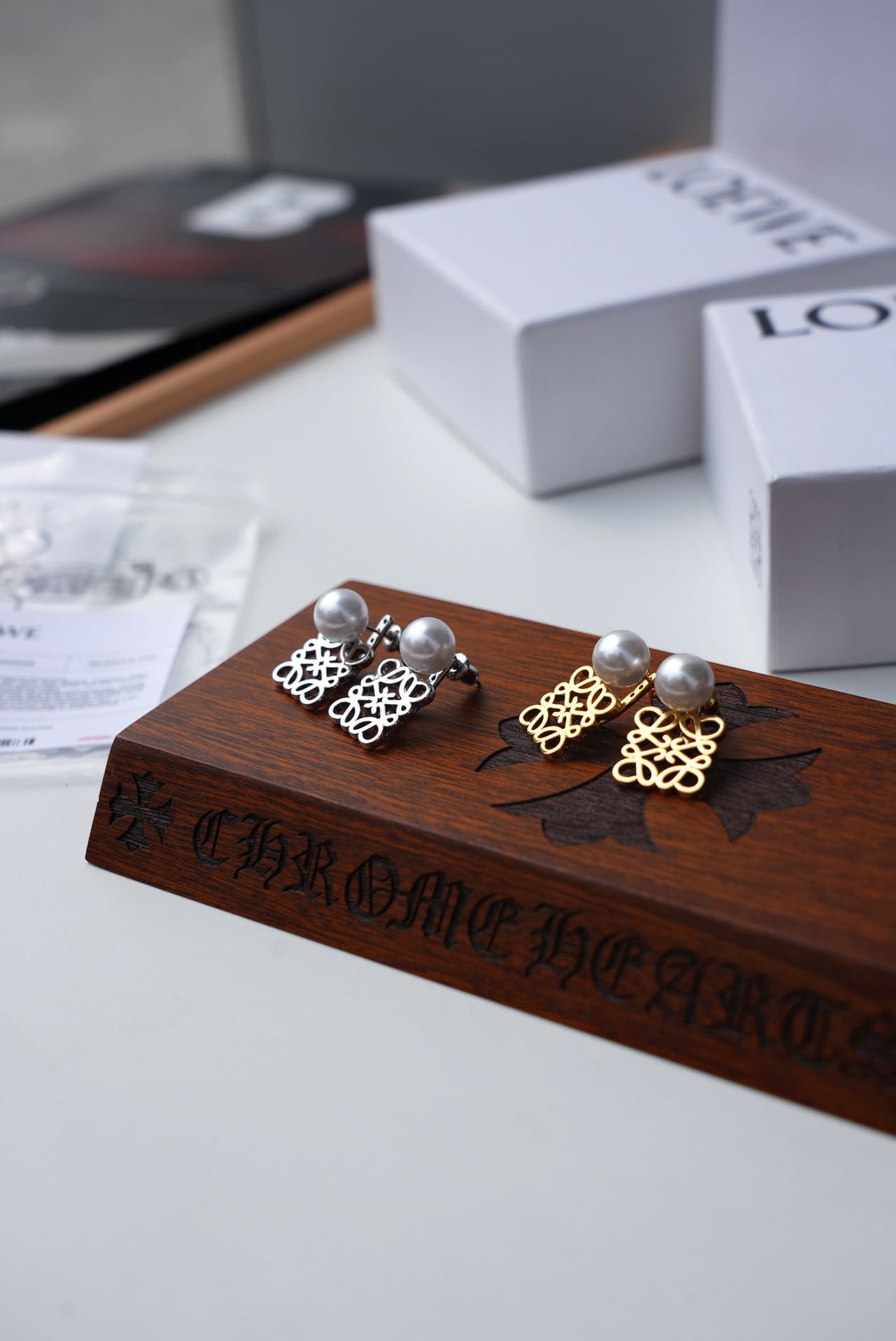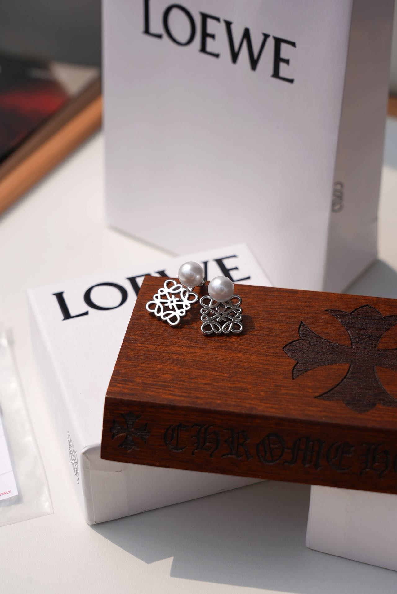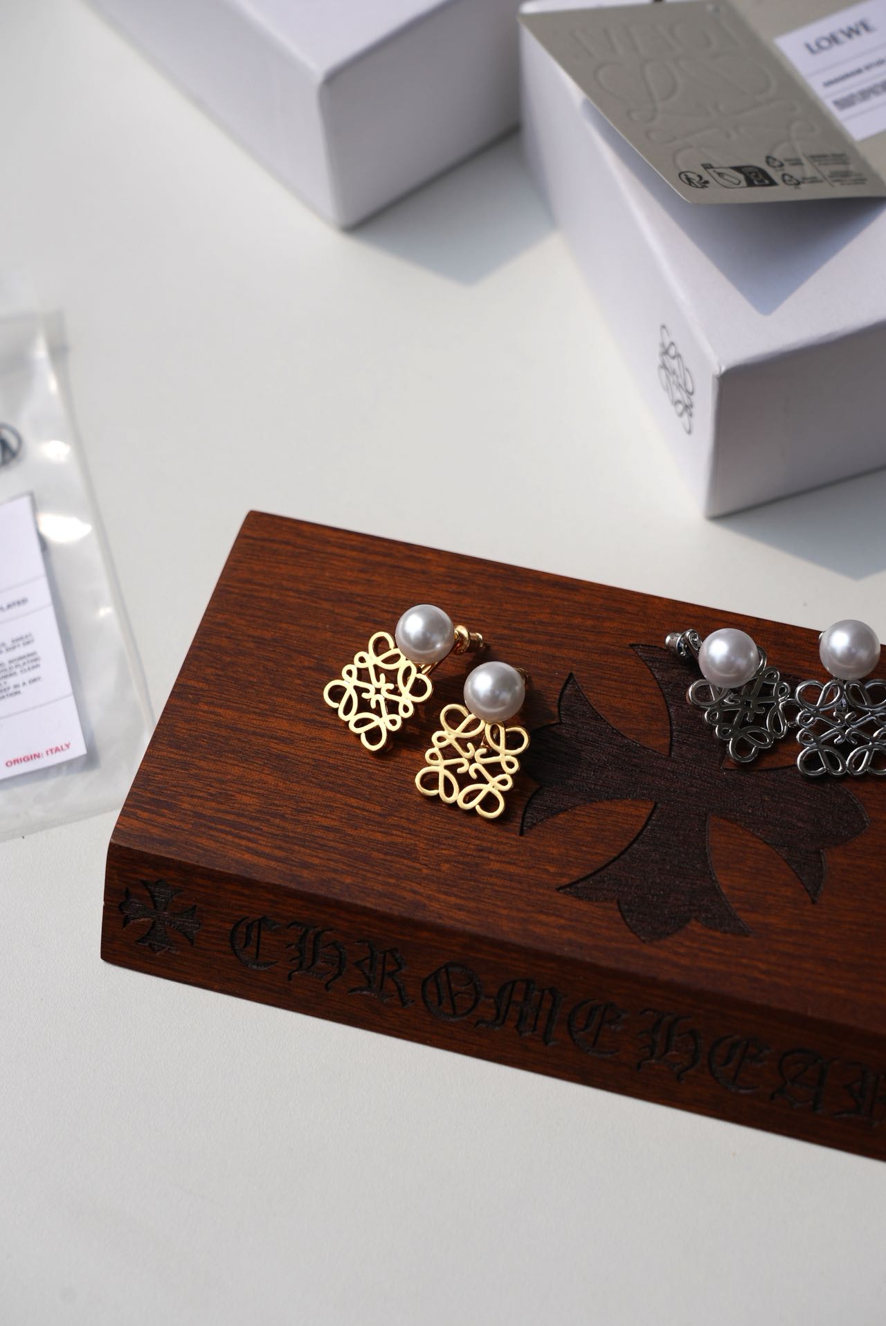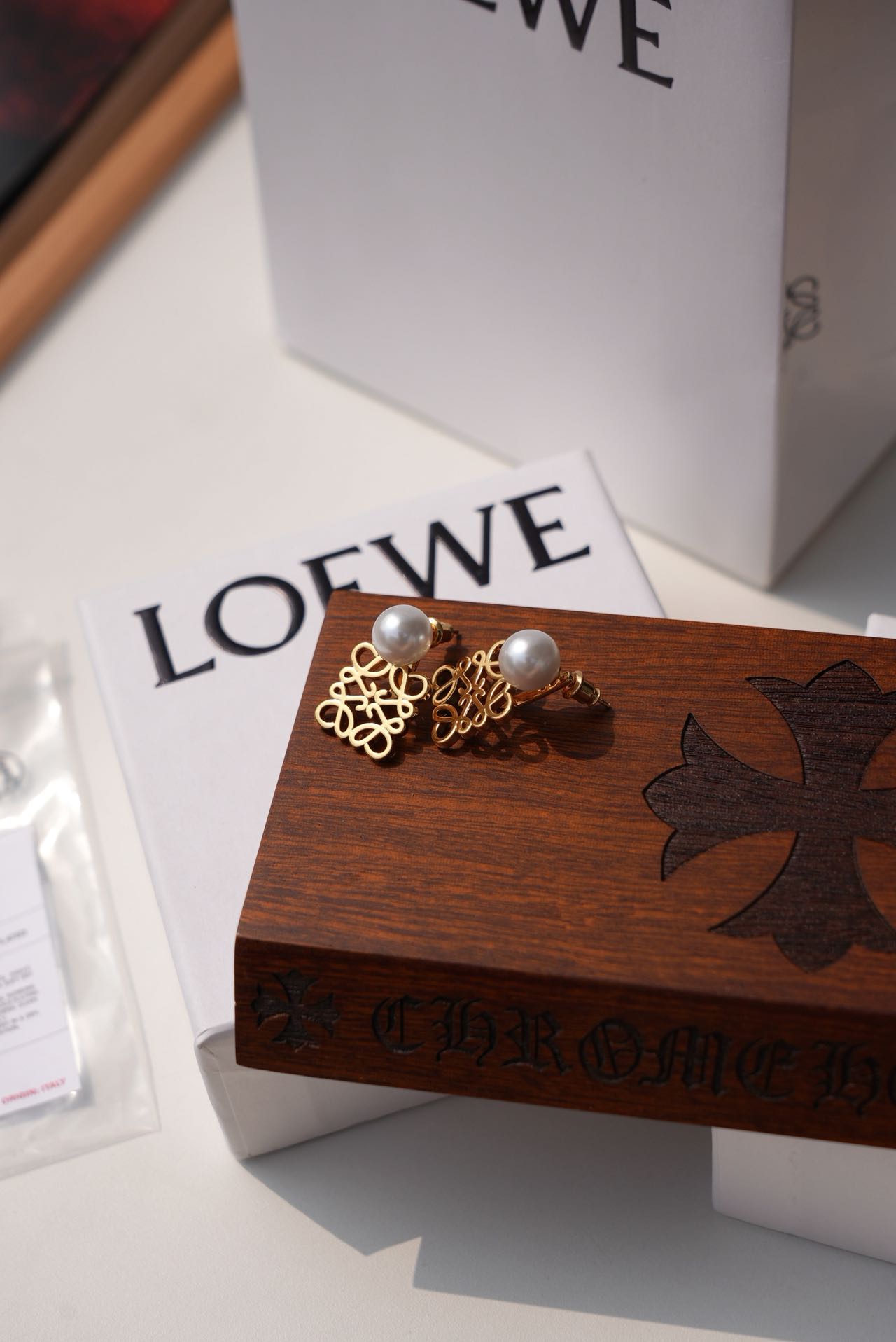 • Loewe标志性符号与珍珠的碰撞:经典的Anagram缠绕纹样以黄铜为底,在光线下流转细腻光泽,上方缀一颗圆润珍珠,刚柔并济,把品牌DNA与温柔质感完美融合。