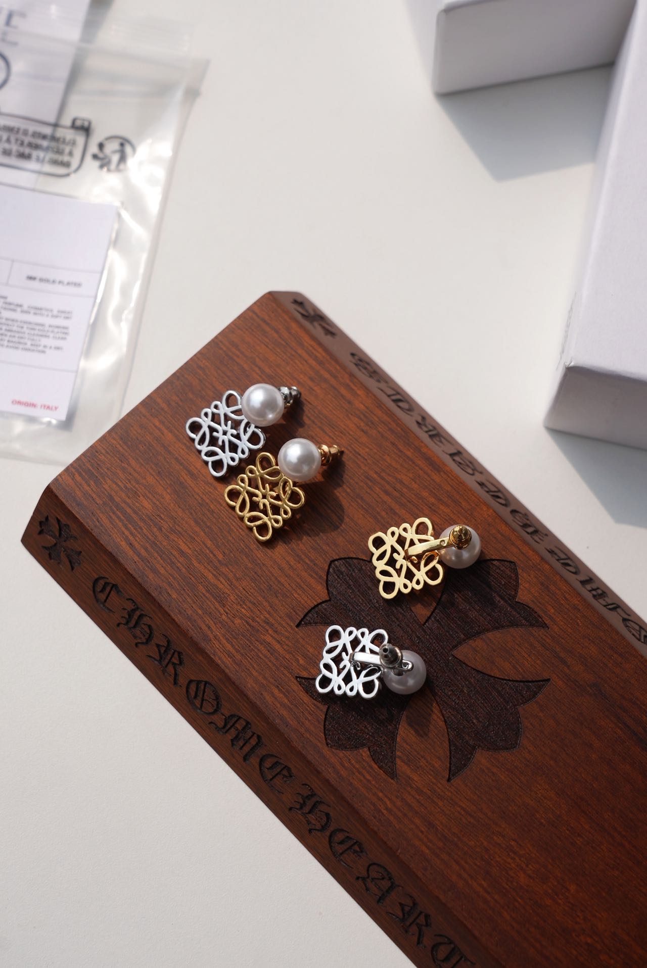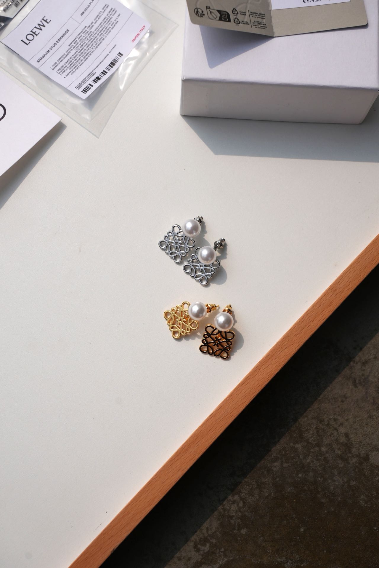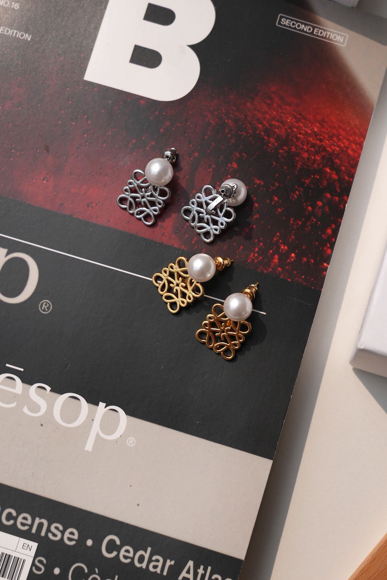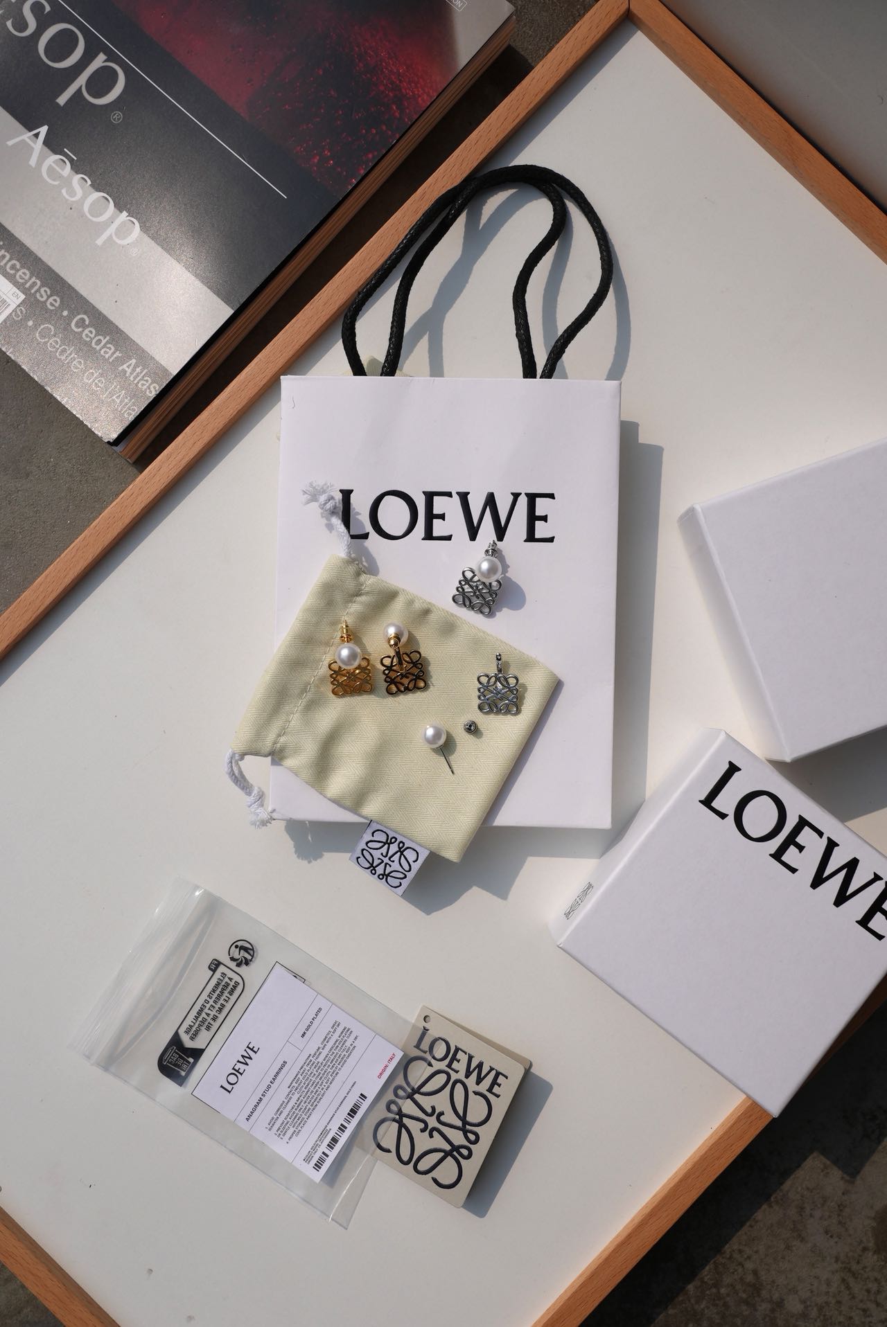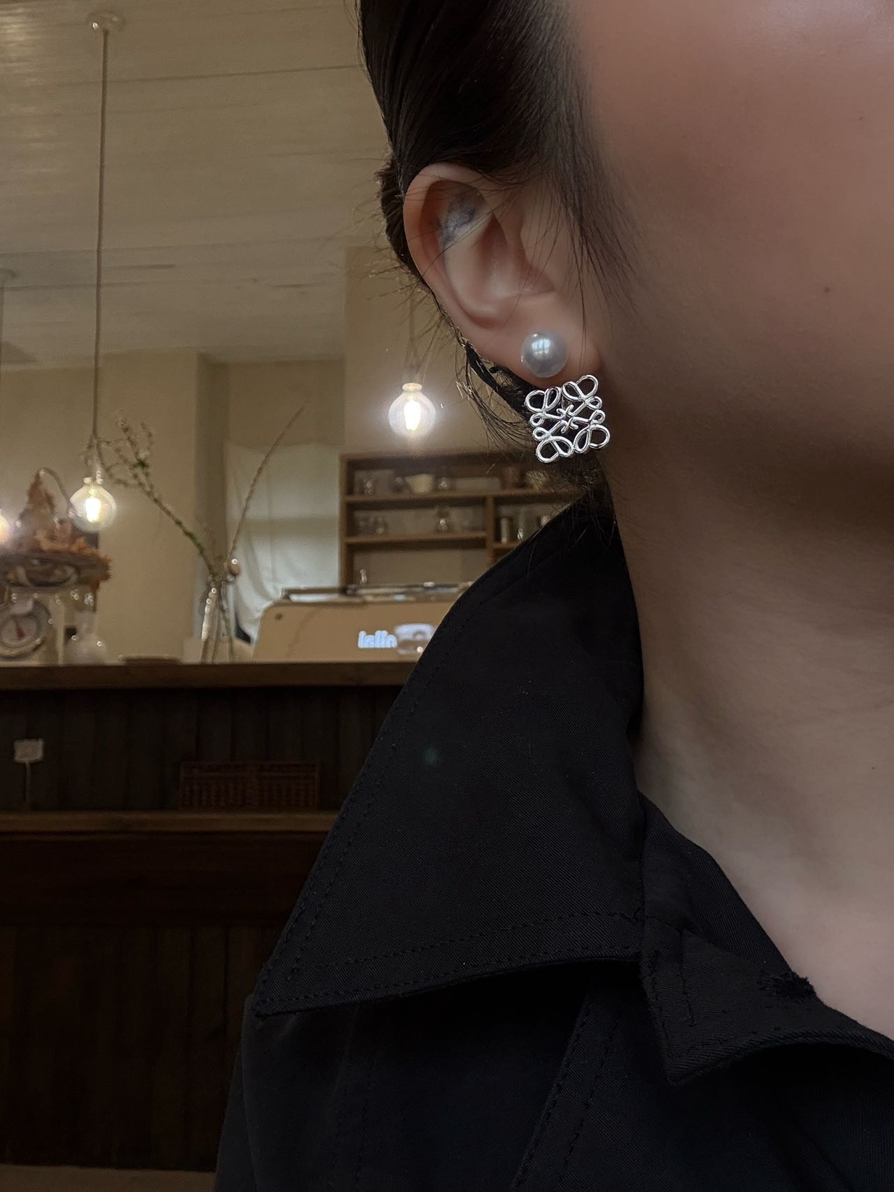 • Loewe标志性符号与珍珠的碰撞:经典的Anagram缠绕纹样以黄铜为底,在光线下流转细腻光泽,上方缀一颗圆润珍珠,刚柔并济,把品牌DNA与温柔质感完美融合。