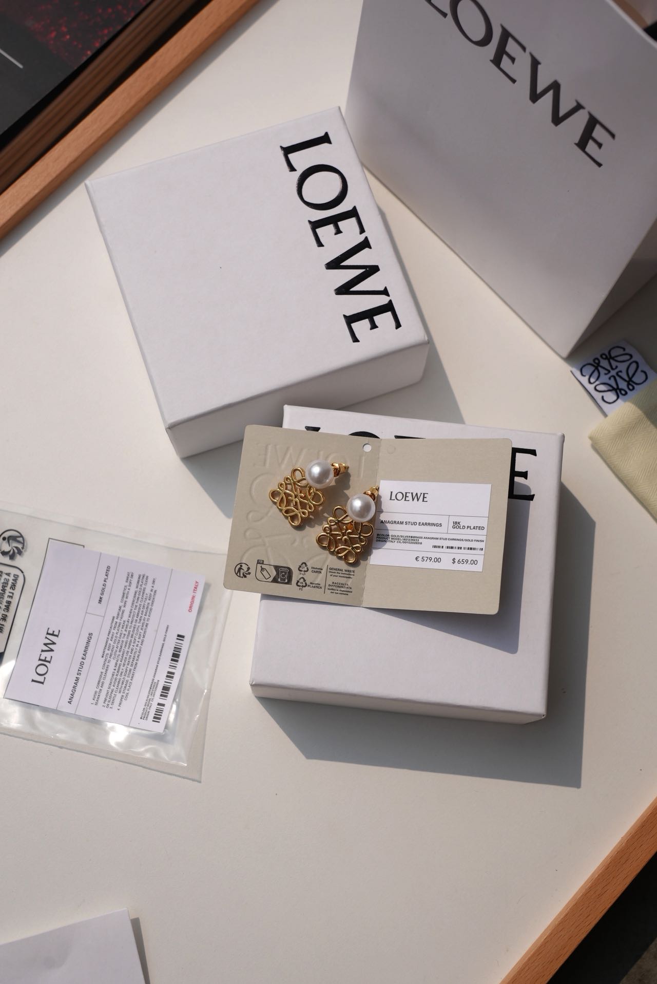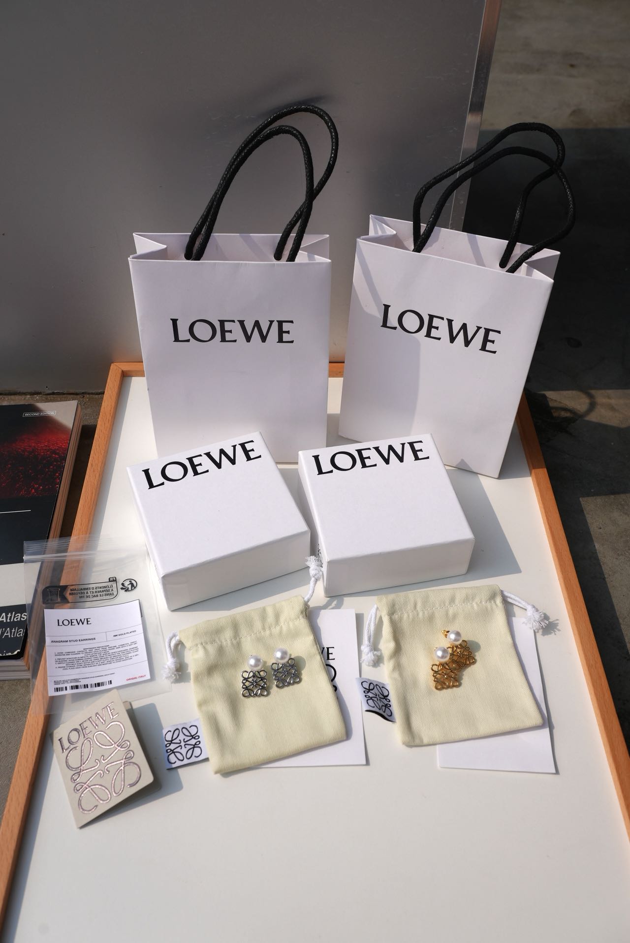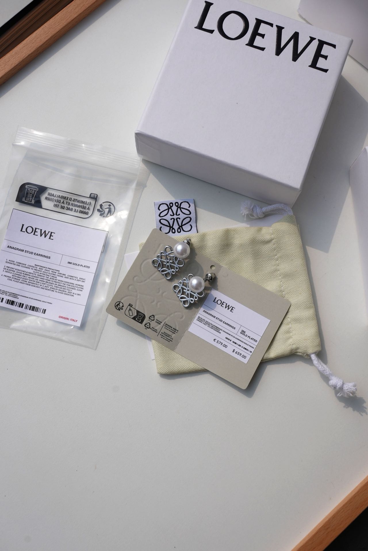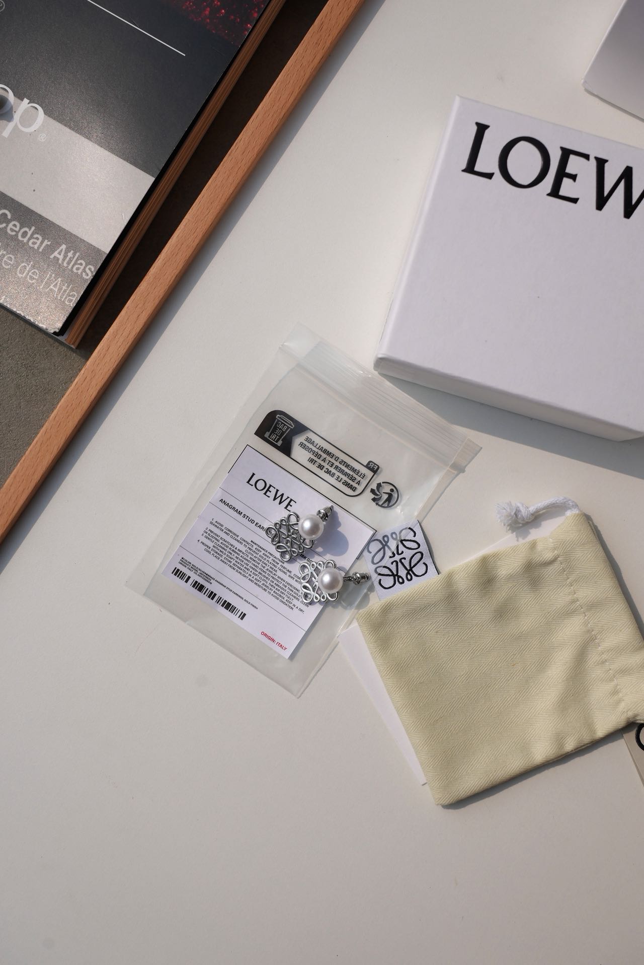 • Loewe标志性符号与珍珠的碰撞:经典的Anagram缠绕纹样以黄铜为底,在光线下流转细腻光泽,上方缀一颗圆润珍珠,刚柔并济,把品牌DNA与温柔质感完美融合。