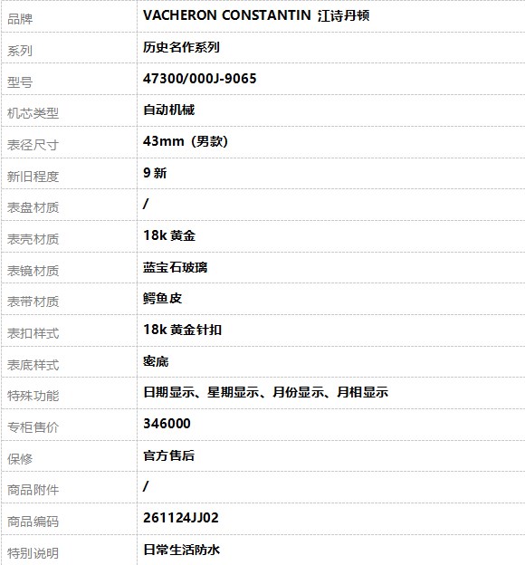 【9新】VACHERONCONSTANTIN江诗丹顿历史名作系列47300/000J-9065自动机械43mm(男款)261124JJ02 现售价:83000