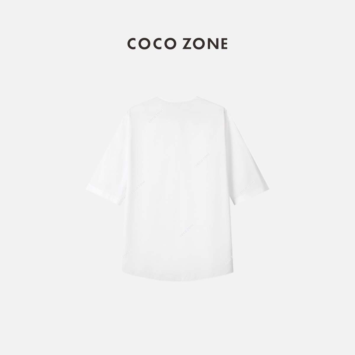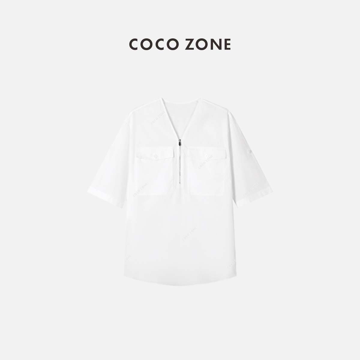 COCO ZONE 2023新款时尚中袖夏季拉链V领衬衫上衣 23C18313