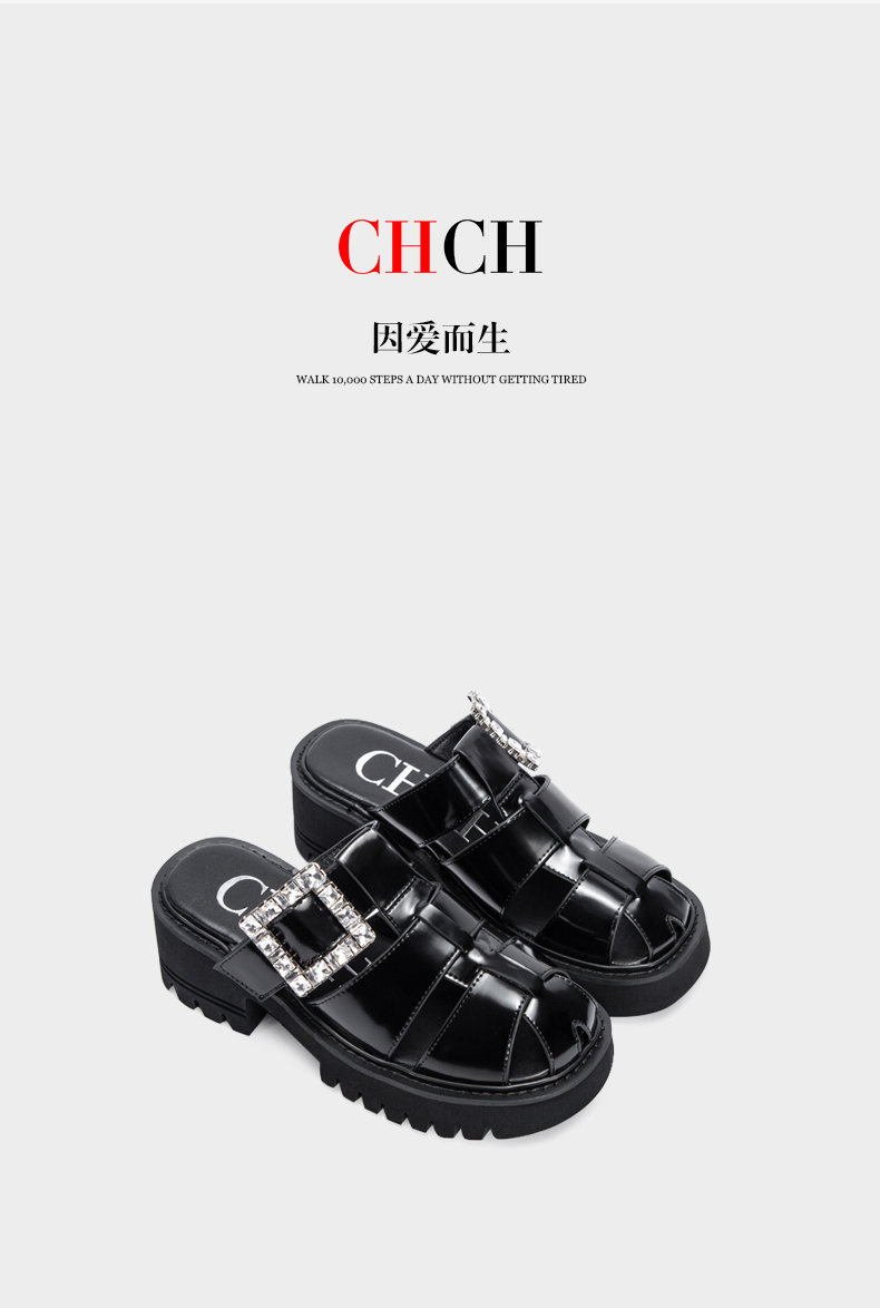 CHCH专柜同款春夏新品牛皮革方钻猪笼半拖CN1B1051