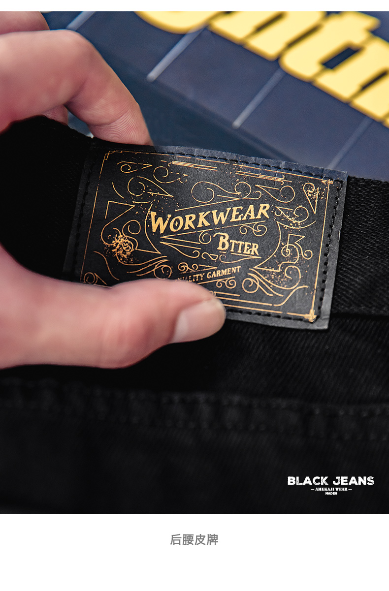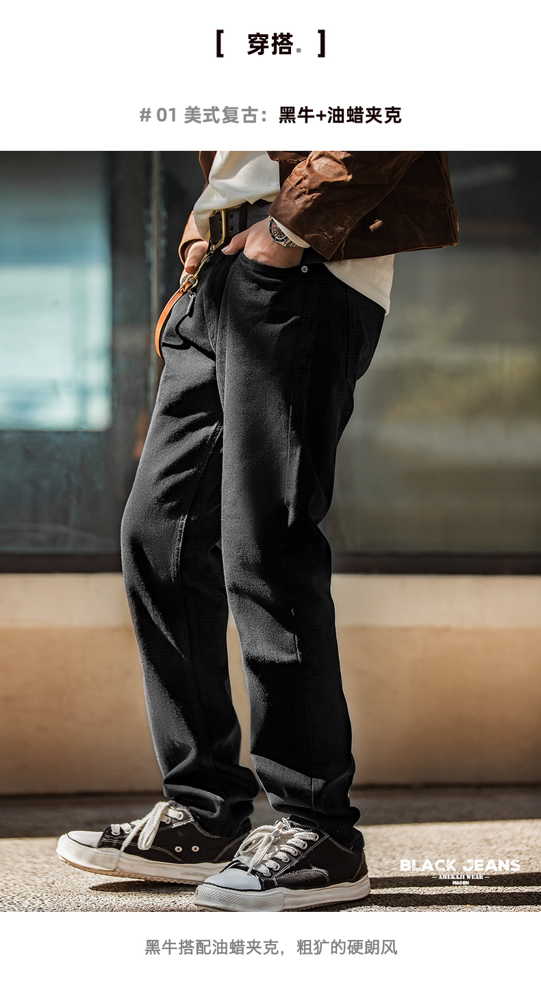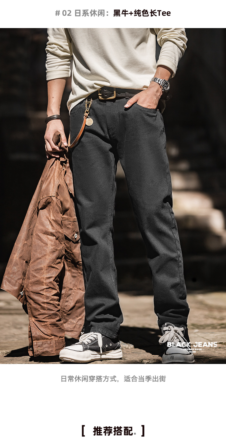 工装优选 美式复古纯黑色中腰牛仔裤水洗显瘦硬汉直筒丹宁长裤男秋