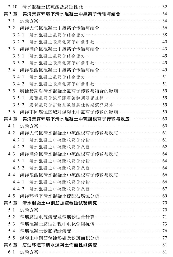在本书撰写和科研过程中,赵铁军教授、李秋义教授全程参与并指导了“青岛地铁清水混凝土耐久性设计与评估研究”的科研工作,中交上海三航科学研究院有限公司主持了清水混凝土模型试验与现场施工。青岛市西海岸轨道交通有限公司参与了现场试验及相关协调工作。课题组研究生康悦、刘海宝等参与了相关试验研究与文本整理工作,在此对他们表示衷心感谢。