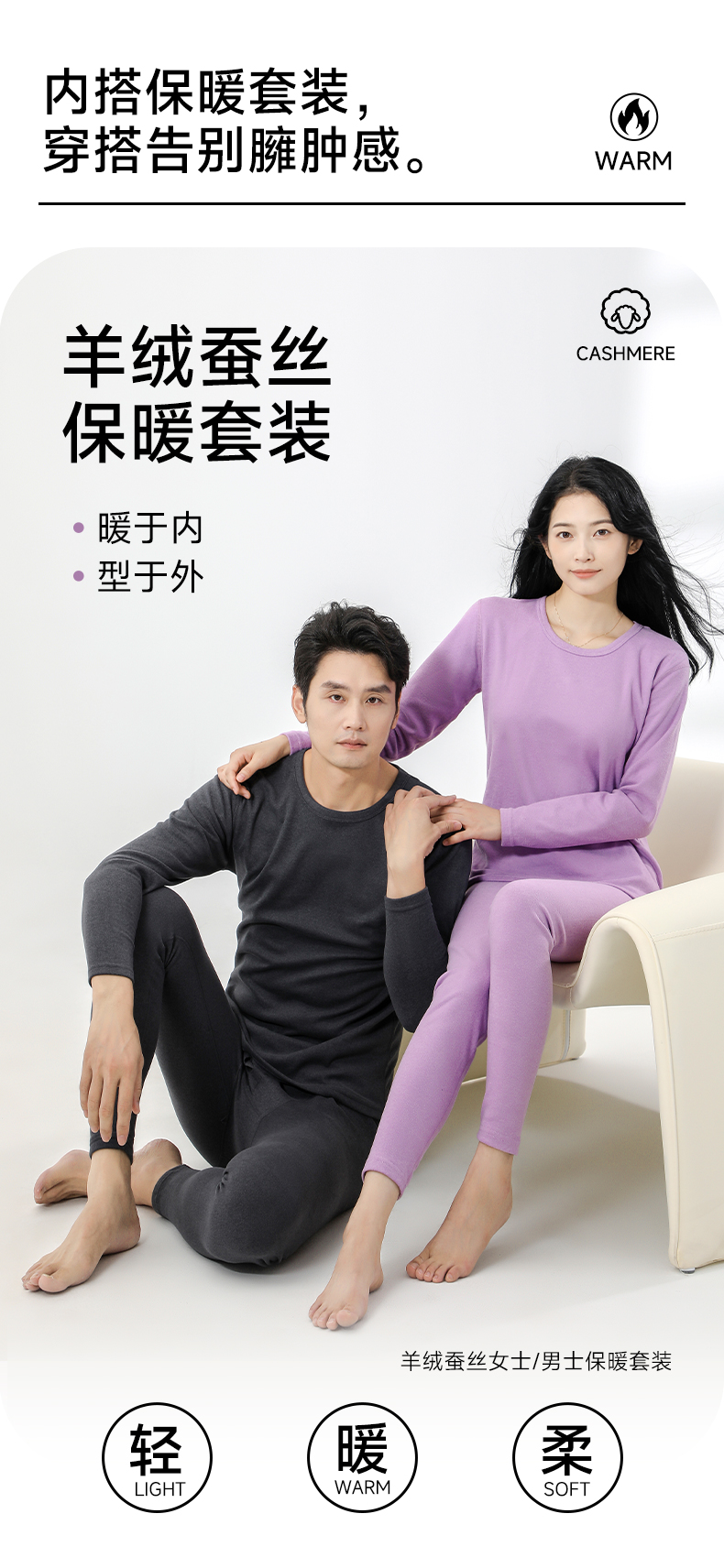 🔥多喜爱羊绒蚕丝保暖套装 男女款 【尺码偏小建议拍大一码】浅紫 / 黑 / 深灰