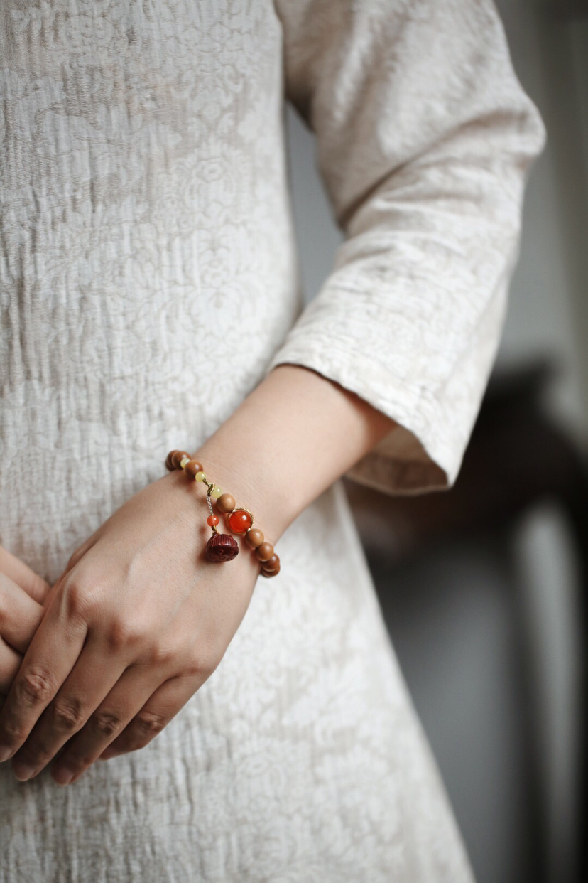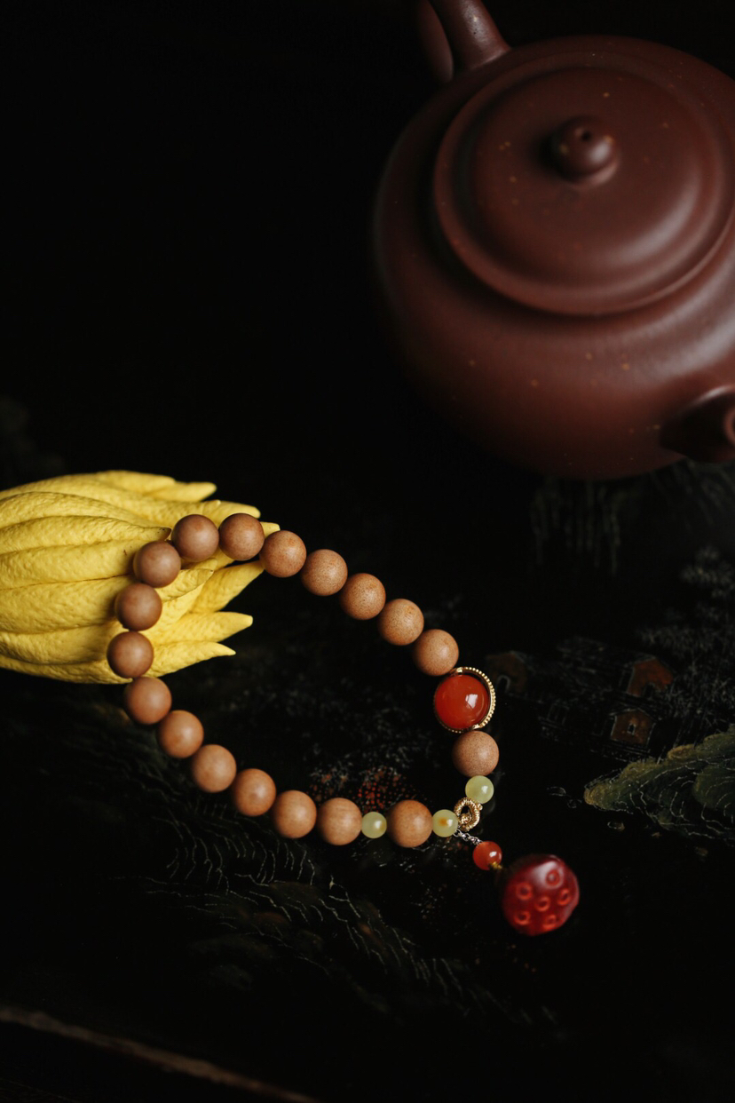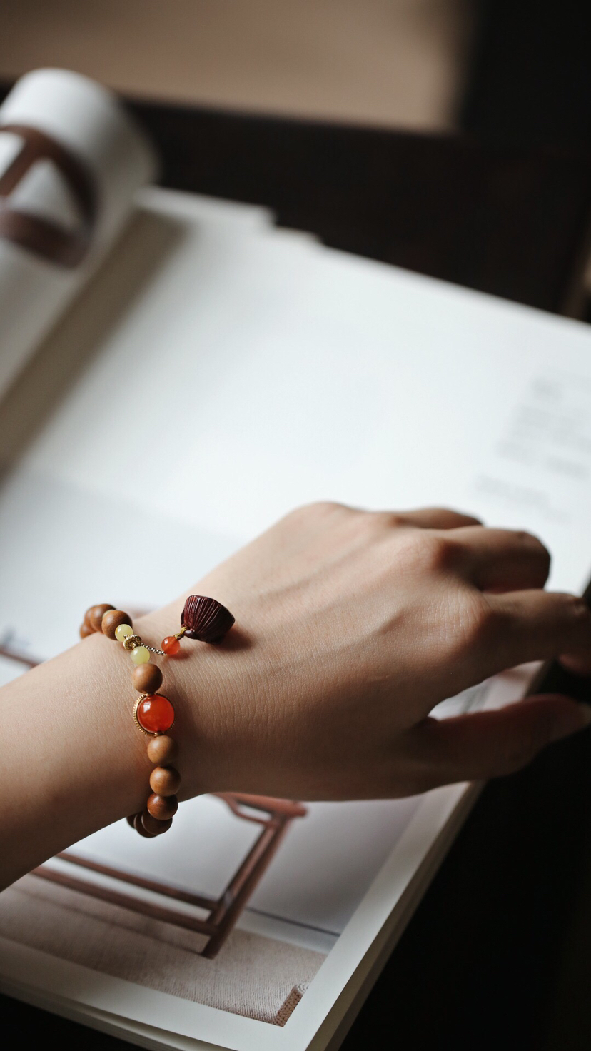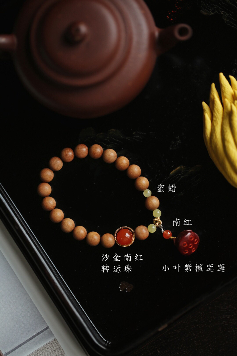宝贝精选了非常优质的老山檀料为基础,料质细腻,纹理清晰,底色干净,舒适自然,香气清新,别有韵味。又搭配小叶紫檀莲蓬挂坠,如出水芙蓉,清新自然,迷人舒适。整体给人一种清丽典雅之韵,美观大气,韵味十足。小巧可爱,价格实惠,值得入手!