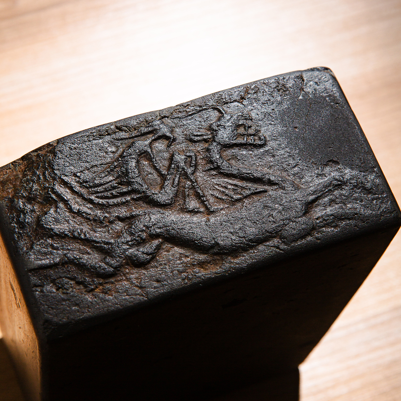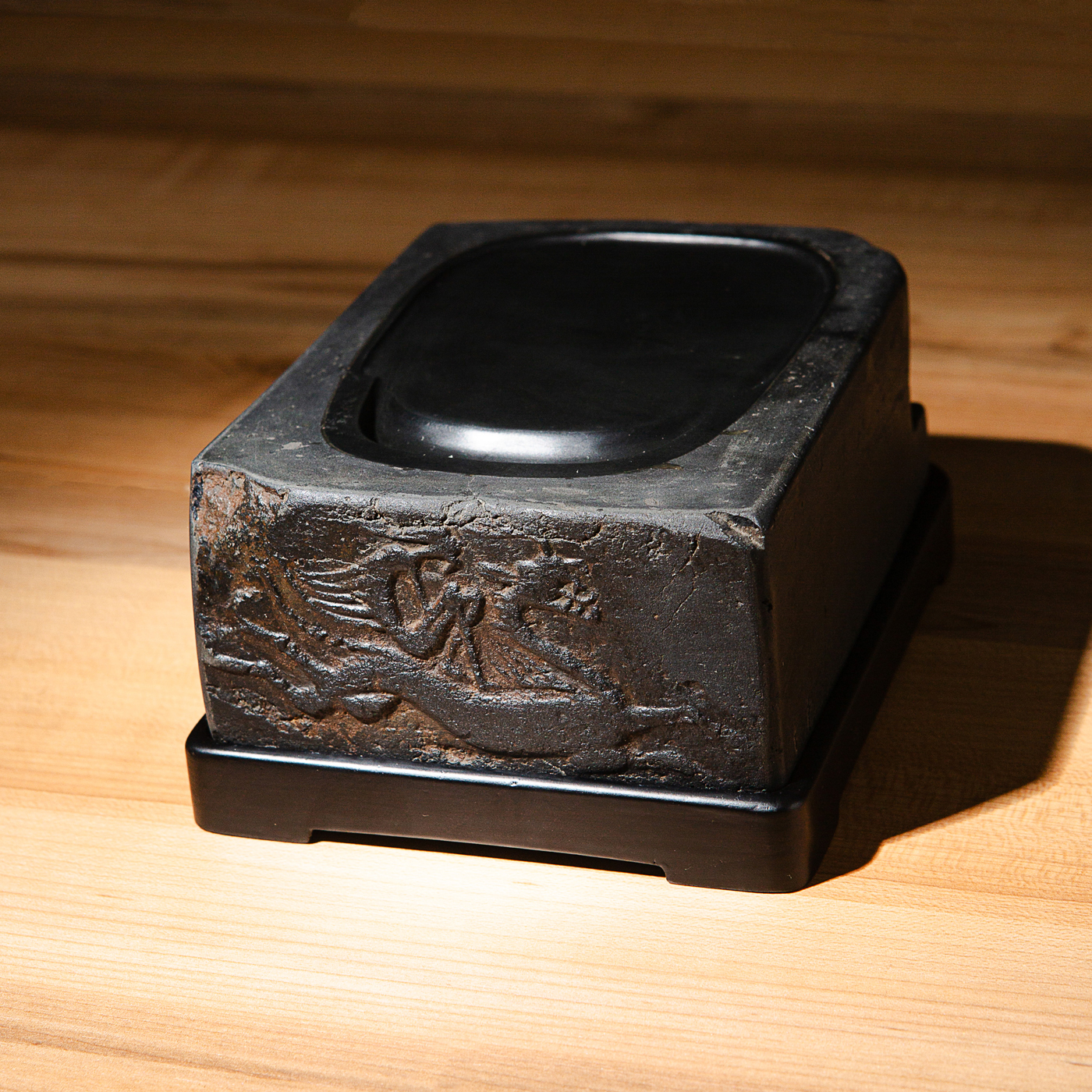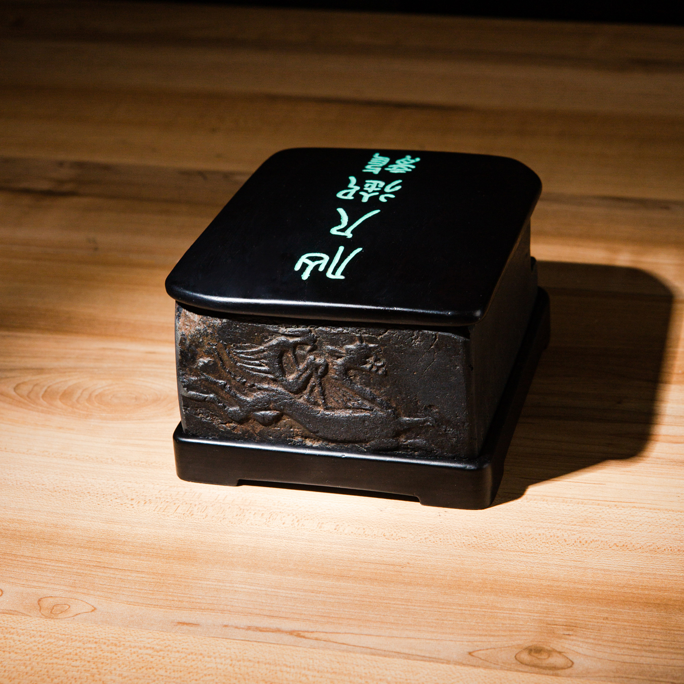 汉晋“仙人御龙”古砖制砚,图案精美少见,器型典雅端庄,砚膛所镶嵌歙石光洁细腻,是兼具收藏和实用的佳品。