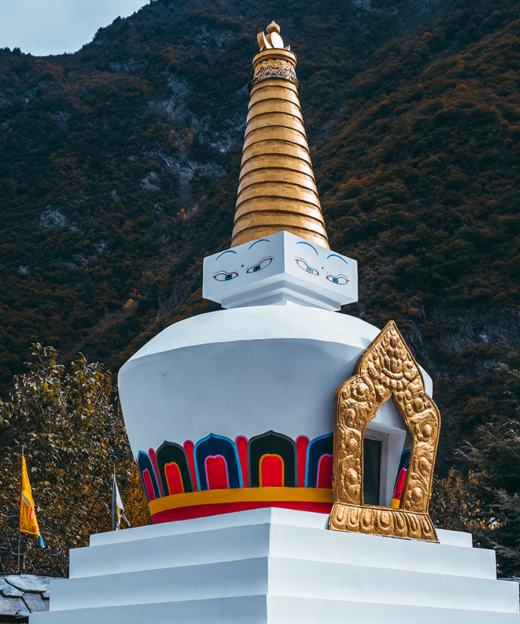 桑耶寺主殿四角就建有红、绿、黑、白四塔,每个塔伤都绘制有“佛眼”,观照四面八方,人间苦乐、大事小事、正义与龌龊、光明与疑难,似乎都能尽收眼底。